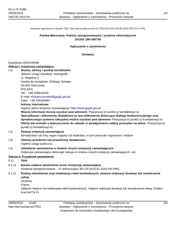 Dz.U./S S188 29/09/2015 340735-2015-PL Państwa członkowskie - Zamówienie publiczne na dostawy - Ogłoszenie o zamówieniu - Procedura otwarta 1/9 Niniejsze ogłoszenie w witrynie TED: http://ted.europa.eu/udl?uri=TED:NOTICE:340735-2015:TEXT:PL:HTML Polska-Warszawa: Pakiety oprogramowania i systemy informatyczne 2015/S 188-340735 Ogłoszenie o zamówieniu Dostawy Dyrektywa 2004/18/WE Sekcja I: Instytucja zamawiająca I.1) Nazwa, adresy i punkty kontaktowe Główny Urząd Geodezji i Kartografii ul. Wspólna 2 Osoba do kontaktów: Elżbieta Tomaka 00-926 Warszawa POLSKA Tel.: +48 226618432 E-mail: [email protected] Faks: +48 226283467 Adresy internetowe: Ogólny adres instytucji zamawiającej: http://www.gugik.gov.pl Więcej informacji można uzyskać pod adresem: Powyższy(-e) punkt(-y) kontaktowy(-e) Specyfikacje i dokumenty dodatkowe (w tym dokumenty dotyczące dialogu konkurencyjnego oraz dynamicznego systemu zakupów) można uzyskać pod adresem: Powyższy(-e) punkt(-y) kontaktowy(-e) Oferty lub wnioski o dopuszczenie do udziału w postępowaniu należy przesyłać na adres: Powyższy(-e) punkt(-y) kontaktowy(-e) I.2) Rodzaj instytucji zamawiającej Ministerstwo lub inny organ krajowy lub federalny, w tym jednostki regionalne i lokalne I.3) Główny przedmiot lub przedmioty działalności Ogólne usługi publiczne I.4) Udzielenie zamówienia w imieniu innych instytucji zamawiających Instytucja zamawiająca dokonuje zakupu w imieniu innych instytucji zamawiających: nie Sekcja II: Przedmiot zamówienia II.1) Opis II.1.1) Nazwa nadana zamówieniu przez instytucję zamawiającą: Dostawa oprogramowania – nr referencyjny: BO-ZP.2610.61.2015.KN.PRG. II.1.2) Rodzaj zamówienia oraz lokalizacja robót budowlanych, miejsce realizacji dostawy lub świadczenia usług Dostawy Kupno Główne miejsce lub lokalizacja robót budowlanych, miejsce realizacji dostawy lub świadczenia usług: Polska. Kod NUTS PL 29/09/2015 S188 http://ted.europa.eu/TED Państwa członkowskie - Zamówienie publiczne na dostawy - Ogłoszenie o zamówieniu - Procedura otwarta Suplement do Dziennika Urzędowego Unii Europejskiej 1/9 Dz.U./S S188 29/09/2015 340735-2015-PL Państwa członkowskie - Zamówienie publiczne na dostawy - Ogłoszenie o zamówieniu - Procedura otwarta II.1.3) Informacje na temat zamówienia publicznego, umowy ramowej lub dynamicznego systemu zakupów (DSZ) Ogłoszenie dotyczy zamówienia publicznego II.1.4) Informacje na temat umowy ramowej II.1.5) Krótki opis zamówienia lub zakupu 1. Przedmiotem zamówienia jest dostawa następującego oprogramowania: 1) oprogramowania do wirtualizacji; 2) systemu operacyjnego; 3) oprogramowania do wykonywania kopii zapasowych; 4) oprogramowania do ochrony antywirusowej maszyn wirtualnych; 5) oprogramowania dla potrzeb zarządzania projektem; 6) oprogramowania do przetwarzania i analizy danych przestrzennych. 2. Szczegółowy Opis Przedmiotu Zamówienia (SOPZ) stanowi Załącznik nr 1 do SIWZ. II.1.6) Wspólny Słownik Zamówień (CPV) 48000000, 72268000, 72265000 II.1.7) Informacje na temat Porozumienia w sprawie zamówień rządowych (GPA) Zamówienie jest objęte Porozumieniem w sprawie zamówień rządowych (GPA): tak II.1.8) Części To zamówienie podzielone jest na części: nie II.1.9) Informacje o ofertach wariantowych Dopuszcza się składanie ofert wariantowych: nie II.2) Wielkość lub zakres zamówienia II.2.1) Całkowita wielkość lub zakres: Całkowita wartość zamówienia wynosi: 988 648 PLN netto. Szacunkowa wartość bez VAT: 988 648 PLN II.2.2) Informacje o opcjach Opcje: nie II.2.3) Informacje o wznowieniach Jest to zamówienie podlegające wznowieniu: nie II.3) Czas trwania zamówienia lub termin realizacji 2/9 Sekcja III: Informacje o charakterze prawnym, ekonomicznym, finansowym i technicznym III.1) Warunki dotyczące zamówienia III.1.1) Wymagane wadia i gwarancje: 1. Wykonawca zobowiązany jest wnieść wadium w wysokości 25 000 PLN (słownie złotych: dwadzieścia pięć tysięcy, 00/100). 2. Wadium wnosi się przed upływem terminu składania ofert. 3. Wadium może być wniesione w jednej lub kilku następujących formach: 1) pieniądzu; 2) poręczeniach bankowych lub poręczeniach spółdzielczej kasy oszczędnościowo-kredytowej, z tym że poręczenie kasy jest zawsze poręczeniem pieniężnym; 3) gwarancjach bankowych; 4) gwarancjach ubezpieczeniowych; 29/09/2015 S188 http://ted.europa.eu/TED Państwa członkowskie - Zamówienie publiczne na dostawy - Ogłoszenie o zamówieniu - Procedura otwarta Suplement do Dziennika Urzędowego Unii Europejskiej 2/9 Dz.U./S S188 29/09/2015 340735-2015-PL Państwa członkowskie - Zamówienie publiczne na dostawy - Ogłoszenie o zamówieniu - Procedura otwarta 3/9 5) poręczeniach udzielanych przez podmioty, o których mowa w art. 6b ust. 5 pkt 2 ustawy z dnia 9 listopada 2000 r. o utworzeniu Polskiej Agencji Rozwoju Przedsiębiorczości (Dz.U. z 2007 r. nr 42, poz. 275, z późn. zm.). 4. Wadium wnoszone w pieniądzu wpłaca się przelewem na rachunek bankowy NBP rachunek nr: 17 1010 1010 0007 5213 9120 0000 z dopiskiem „Wadium nr referencyjny: BO-ZP.2610.61.2015.KN.PRG”. Uwaga: Za termin wniesienia wadium w formie pieniężnej zostanie przyjęty termin uznania rachunku Zamawiającego. 5. Dokument potwierdzający wniesienie wadium w innych formach niż w pieniądzu należy dołączyć do oferty w taki sposób, aby Zamawiający swobodnie mógł w wyznaczonym terminie zwrócić Wykonawcy wadium. 6. Wadium wniesione w pieniądzu Zamawiający przechowuje na rachunku bankowym. 7. Zamawiający zwraca wadium wszystkim Wykonawcom niezwłocznie po wyborze oferty najkorzystniejszej lub unieważnieniu postępowania, z wyjątkiem Wykonawcy, którego oferta została wybrana jako najkorzystniejsza, z zastrzeżeniem art. 46 ust. 4a ustawy Pzp. 8. Wykonawcy, którego oferta została wybrana jako najkorzystniejsza, Zamawiający zwraca wadium niezwłocznie po zawarciu umowy w sprawie zamówienia publiczne