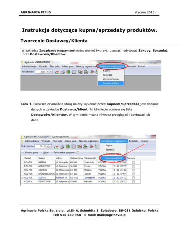 AGRINAVIA FIELD styczeń 2013 r. Instrukcja dotycząca kupna/sprzedaży produktów. Tworzenie Dostawcy/Klienta W zakładce Zarządzanie magazynami można również tworzyć, usuwać i edytować Zakupy, Sprzedaż oraz Dostawców/Klientów. Krok 1. Pierwszą czynnością którą należy wykonać przed Kupnem/Sprzedażą jest dodanie danych w zakładce Dostawca/klient. Po kliknięciu otwiera się lista Dostawców/Klientów. W tym oknie można również przeglądać i edytować ich dane. Agrinavia Polska Sp. z o.o., ul.Dr A. Schmidta 1, Żołędowo, 86-031 Osielsko, Polska Tel: 515 230 958 - E-mail: [email protected] AGRINAVIA FIELD styczeń 2013 r. Krok 2. Jeżeli chcemy uwzględnić nowego Dostawcę/klienta wystarczy kliknąć Utwórz nową i na samym dole listy otworzą się puste rubryki wiersza, które należy pokolei wypełnić zaczynając od lewej strony. Krok 3. By usunąć Dostawcę/kliena zaznaczamy jednym kliknięciem wiersz danych, który po wybraniu zmienia kolor na niebieski. Następnie klikamy na Usuń. Dostawca/Klient zostanie usunięty bez możliwości cofnięcia kroku ( jedyna możliwość to wczytanie z Kopii Bezpieczeństwa). Agrinavia Polska Sp. z o.o., ul.Dr A. Schmidta 1, Żołędowo, 86-031 Osielsko, Polska Tel: 515 230 958 - E-mail: [email protected] AGRINAVIA FIELD styczeń 2013 r. Krok 4. Gdy mamy dodanych wszystkich Dostawców/klientów wówczas możemy korzystać z podzakładek Kupno i Sprzedaż. Podzakładka Kupno umożliwia dodanie produktów do magazynu. Dodawanie w każdej z tych zakładek wygląda identycznie (graficzny przykład pokazany na ”Kupnie produktu”). Sprzedaż wykonujemy w ten sam sposób otrzymująć odwrotny rezultat, czyli ściągniecie ze stanu magazynowego. W efekcie możemy również drukować raporty zakupów /sprzedaży wg poszczególnych dostawców dla wybranych okresów, rodzajów produktów itd... Agrinavia Polska Sp. z o.o., ul.Dr A. Schmidta 1, Żołędowo, 86-031 Osielsko, Polska Tel: 515 230 958 - E-mail: [email protected]