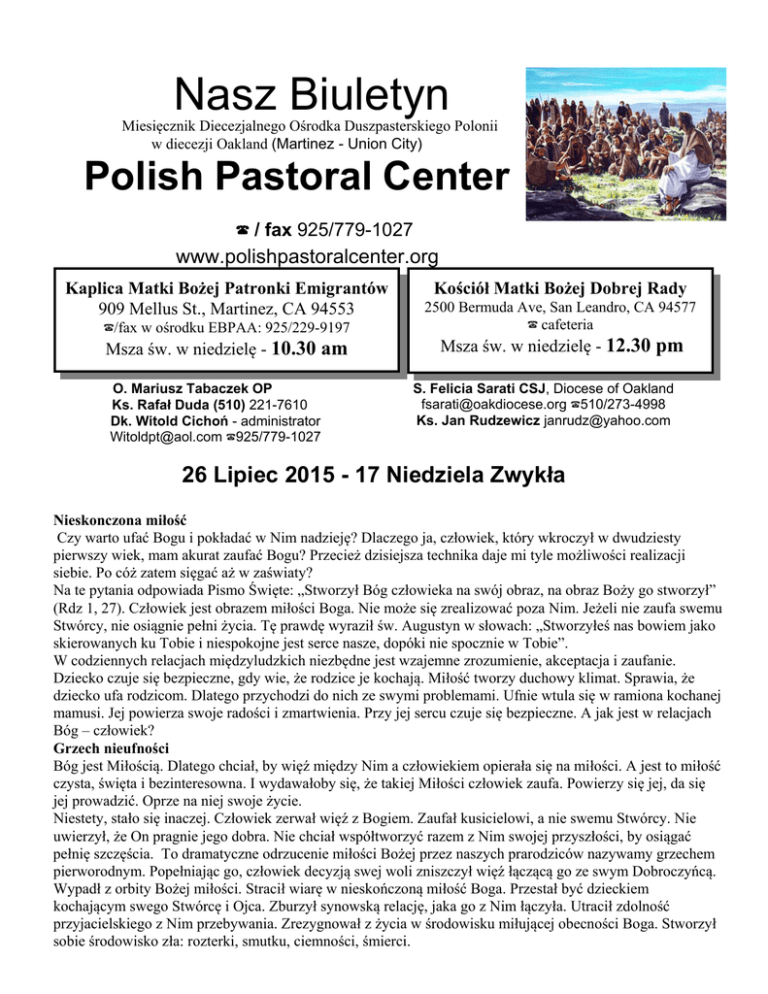 Nasz Biuletyn Miesięcznik Diecezjalnego Ośrodka Duszpasterskiego Polonii w diecezji Oakland (Martinez - Union City) Polish Pastoral Center ? / fax 925/779-1027 www.polishpastoralcenter.org Kaplica Matki Bożej Patronki Emigrantów 909 Mellus St., Martinez, CA 94553 ?/fax w ośrodku EBPAA: 925/229-9197 Msza św. w niedzielę - 10.30 am O. Mariusz Tabaczek OP Ks. Rafał Duda (510) 221-7610 Dk. Witold Cichoń - administrator [email protected] ?925/779-1027 Kościół Matki Bożej Dobrej Rady 2500 Bermuda Ave, San Leandro, CA 94577 ? cafeteria Msza św. w niedzielę - 12.30 pm S. Felicia Sarati CSJ, Diocese of Oakland [email protected] ?510/273-4998 Ks. Jan Rudzewicz [email protected] 26 Lipiec 2015 - 17 Niedziela Zwykła Nieskonczona miłość Czy warto ufać Bogu i pokładać w Nim nadzieję? Dlaczego ja, człowiek, który wkroczył w dwudziesty pierwszy wiek, mam akurat zaufać Bogu? Przecież dzisiejsza technika daje mi tyle możliwości realizacji siebie. Po cóż zatem sięgać aż w zaświaty? Na te pytania odpowiada Pismo Święte: „Stworzył Bóg człowieka na swój obraz, na obraz Boży go stworzył” (Rdz 1, 27). Człowiek jest obrazem miłości Boga. Nie może się zrealizować poza Nim. Jeżeli nie zaufa swemu Stwórcy, nie osiągnie pełni życia. Tę prawdę wyraził św. Augustyn w słowach: „Stworzyłeś nas bowiem jako skierowanych ku Tobie i niespokojne jest serce nasze, dopóki nie spocznie w Tobie”. W codziennych relacjach międzyludzkich niezbędne jest wzajemne zrozumienie, akceptacja i zaufanie. Dziecko czuje się bezpieczne, gdy wie, że rodzice je kochają. Miłość tworzy duchowy klimat. Sprawia, że dziecko ufa rodzicom. Dlatego przychodzi do nich ze swymi problemami. Ufnie wtula się w ramiona kochanej mamusi. Jej powierza swoje radości i zmartwienia. Przy jej sercu czuje się bezpieczne. A jak jest w relacjach Bóg – człowiek? Grzech nieufności Bóg jest Miłością. Dlatego chciał, by więź między Nim a człowiekiem opierała się na miłości. A jest to miłość czysta, święta i bezinteresowna. I wydawałoby się, że takiej Miłości człowiek zaufa. Powierzy się jej, da się jej prowadzić. Oprze na niej swoje życie. Niestety, stało się inaczej. Człowiek zerwał więź z Bogiem. Zaufał kusicielowi, a nie swemu Stwórcy. Nie uwierzył, że On pragnie jego dobra. Nie chciał współtworzyć razem z Nim swojej przyszłości, by osiągać pełnię szczęścia. To dramatyczne odrzucenie miłości Bożej przez naszych prarodziców nazywamy grzechem pierworodnym. Popełniając go, człowiek decyzją swej woli zniszczył więź łączącą go ze swym Dobroczyńcą. Wypadł z orbity Bożej miłości. Stracił wiarę w nieskończoną miłość Boga. Przestał być dzieckiem kochającym swego Stwórcę i Ojca. Zburzył synowską relację, jaka go z Nim łączyła. Utracił zdolność przyjacielskiego z Nim przebywania. Zrezygnował z życia w środowisku miłującej obecności Boga. Stworzył sobie środowisko zła: rozterki, smutku, ciemności, śmierci. Bóg nie rezygnuje Bywa, że w rodzinie mają miejsce tak zwane ciche dni. Są one gorzkim owocem braku serdecznej więzi i ofiarowanego sobie czasu. Bóg nie chciał, by między Nim a ludzkością panowały ciche dni. Kierując się miłosierdziem, postanowił nie przerywać z człowiekiem dialogu miłości, pomimo grzechu nieposłuszeństwa. Na przestrzeni całej Bosko-ludzkiej historii toczy się dramatyczne zmaganie świętej miłości Boga z grzesznym człowiekiem. Bóg objawia się jako zawsze wierny – człowiek jako niewierny. Bóg chce być źródłem szczęścia – człowiek szuka szczęścia poza Nim. Bóg stale na nowo podejmuje dialog – człowiek przez swe nieposłuszeństwo zrywa go. Mimo to Stwórca ofiaruje człowiekowi swoje przebaczenie. Ciągle wzywa, by zawierzył Jego nieskończonej miłości. Obecnie Bóg już nie przemawia przez proroków. To Mu nie wystarcza. Przez Chrystusa objawia swoją wolę przywrócenia ludzi do godności dzieci Bożych. Maryja jest wzorcem zawierzenia Bogu. W tajemnicy zwiastowania najdoskonalej okazała Mu swe zaufanie w słowach: „Oto Ja służebnica Pańska, niech mi się stanie według twego słowa” (Łk 1, 38). Stojąc pod krzyżem Jezusa, swą postawę całkowitego zawierzenia woli Bożej przypieczętowała cierpieniem. W ten sposób łączyła swoje „fiat” z ofiarą swego Syna, Jezusa Chrystusa. Maryja zawierzała siebie Bogu. Jest całkowicie dla Niego, ponieważ On jest całkowicie dla nas Nauczyciele ufności W Kościele Duch Święty odnawia ufność zniszczoną przez grzech. Tutaj spotykamy się z Chrystusem. Oddajemy cześć Trójcy Świętej. Prawdziwa ufność owocuje świętością życia. Świadkami ufności są święci. Oni w całej pełni odpowiedzieli na zaufanie Boga. Na przykładzie kilku sylwetek przedstawimy świętość jako całkowite zawierzenie siebie Bogu. Św. Paweł – pochwycony przez Chrystusa Paweł swoją więź z Jezusem ujmuje w słowach: „Wiem, komu uwierzyłem, i pewien jestem, że mocen jest ustrzec mój depozyt aż do owego dnia” (2 Tm 1, 12). To jego zawierzenie Jezusowi jest tak radykalne, że prowadzi go do utożsamienia się z Nim. Przed wiernymi w Filippi otwiera swoje serce: „Dla mnie bowiem żyć – to Chrystus, a umrzeć – to zysk” (1, 21). Jego więź z Panem sięga granic heroizmu. Po prostu jest mocniejsza niż śmierć. Powierzenie swego życia Bogu nie przychodzi Pawłowi łatwo. Wymaga zgody na całkowitą ofiarę. Apostoł nie cofa się przed nią. Świadczą o tym słowa: „Aby żyć dla Boga, razem z Chrystusem zostałem przybity do krzyża. Teraz zaś już nie ja żyję, lecz żyje we mnie Chrystus (...). Obecne moje życie jest życiem wiary w Syna Bożego, który umiłował mnie i samego siebie wydał za mnie” (Ga 2, 19-20). W tym oświadczeniu Paweł podkreśla swoją solidarność z Jezusem przez mistyczne przybicie razem z Nim do krzyża. Owocem tego prz