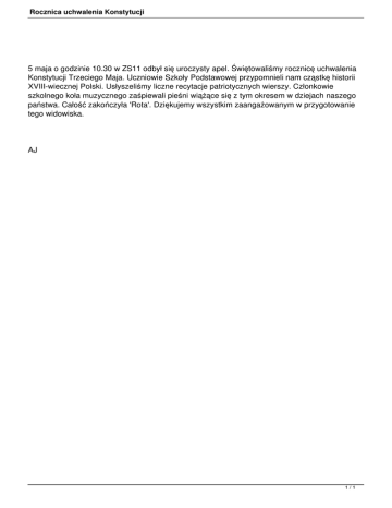 Rocznica uchwalenia Konstytucji 5 maja o godzinie 10.30 w ZS11 odbył się uroczysty apel. Świętowaliśmy rocznicę uchwalenia Konstytucji Trzeciego Maja. Uczniowie Szkoły Podstawowej przypomnieli nam cząstkę historii XVIII-wiecznej Polski. Usłyszeliśmy liczne recytacje patriotycznych wierszy. Członkowie szkolnego koła muzycznego zaśpiewali pieśni wiążące się z tym okresem w dziejach naszego państwa. Całość zakończyła 'Rota'. Dziękujemy wszystkim zaangażowanym w przygotowanie tego widowiska. AJ 1/1