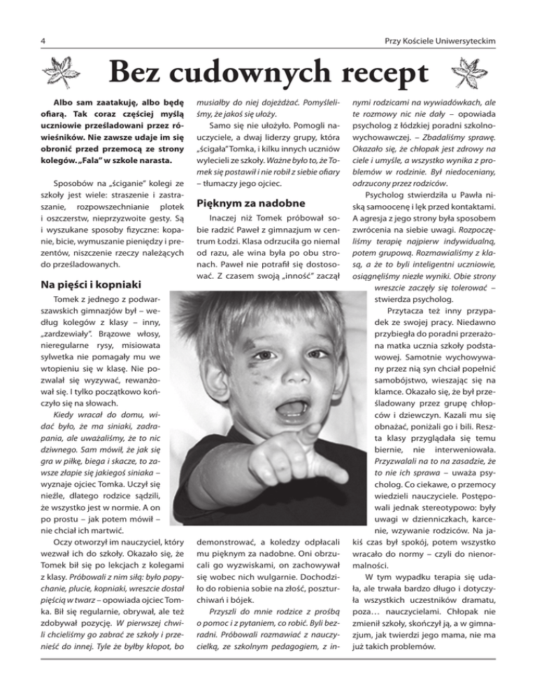 4 Przy Kościele Uniwersyteckim Bez cudownych recept Albo sam zaatakuję, albo będę ofiarą. Tak coraz częściej myślą uczniowie prześladowani przez rówieśników. Nie zawsze udaje im się obronić przed przemocą ze strony kolegów. „Fala” w szkole narasta. Sposobów na „ściganie” kolegi ze szkoły jest wiele: straszenie i zastraszanie, rozpowszechnianie plotek i oszczerstw, nieprzyzwoite gesty. Są i wyszukane sposoby fizyczne: kopanie, bicie, wymuszanie pieniędzy i prezentów, niszczenie rzeczy należących do prześladowanych. Na pięści i kopniaki Tomek z jednego z podwarszawskich gimnazjów był – według kolegów z klasy – inny, „zardzewiały”. Brązowe włosy, nieregularne rysy, misiowata sylwetka nie pomagały mu we wtopieniu się w klasę. Nie pozwalał się wyzywać, rewanżował się. I tylko początkowo kończyło się na słowach. Kiedy wracał do domu, widać było, że ma siniaki, zadrapania, ale uważaliśmy, że to nic dziwnego. Sam mówił, że jak się gra w piłkę, biega i skacze, to zawsze złapie się jakiegoś siniaka – wyznaje ojciec Tomka. Uczył się nieźle, dlatego rodzice sądzili, że wszystko jest w normie. A on po prostu – jak potem mówił – nie chciał ich martwić. Oczy otworzył im nauczyciel, który wezwał ich do szkoły. Okazało się, że Tomek bił się po lekcjach z kolegami z klasy. Próbowali z nim siłą: było popychanie, plucie, kopniaki, wreszcie dostał pięścią w twarz – opowiada ojciec Tomka. Bił się regularnie, obrywał, ale też zdobywał pozycję. W pierwszej chwili chcieliśmy go zabrać ze szkoły i przenieść do innej. Tyle że byłby kłopot, bo musiałby do niej dojeżdżać. Pomyśleliśmy, że jakoś się ułoży. Samo się nie ułożyło. Pomogli nauczyciele, a dwaj liderzy grupy, która „ścigała” Tomka, i kilku innych uczniów wylecieli ze szkoły. Ważne było to, że Tomek się postawił i nie robił z siebie ofiary – tłumaczy jego ojciec. Pięknym za nadobne Inaczej niż Tomek próbował sobie radzić Paweł z gimnazjum w centrum Łodzi. Klasa odrzuciła go niemal od razu, ale wina była po obu stronach. Paweł nie potrafił się dostosować. Z czasem swoją „inność” zaczął demonstrować, a koledzy odpłacali mu pięknym za nadobne. Oni obrzucali go wyzwiskami, on zachowywał się wobec nich wulgarnie. Dochodziło do robienia sobie na złość, poszturchiwań i bójek. Przyszli do mnie rodzice z prośbą o pomoc i z pytaniem, co robić. Byli bezradni. Próbowali rozmawiać z nauczycielką, ze szkolnym pedagogiem, z in- nymi rodzicami na wywiadówkach, ale te rozmowy nic nie dały – opowiada psycholog z łódzkiej poradni szkolnowychowawczej. – Zbadaliśmy sprawę. Okazało się, że chłopak jest zdrowy na ciele i umyśle, a wszystko wynika z problemów w rodzinie. Był niedoceniany, odrzucony przez rodziców. Psycholog stwierdziła u Pawła niską samoocenę i lęk przed kontaktami. A agresja z jego strony była sposobem zwrócenia na siebie uwagi. Rozpoczęliśmy terapię najpierw indywidualną, potem grupową. Rozmawialiśmy z klasą, a że to byli inteligentni uczniowie, osiągnęliśmy niezłe wyniki. Obie strony wreszcie zaczęły się tolerować – stwierdza psycholog. Przytacza też inny przypadek ze swojej pracy. Niedawno przybiegła do poradni przerażona matka ucznia szkoły podstawowej. Samotnie wychowywany przez nią syn chciał popełnić samobójstwo, wieszając się na klamce. Okazało się, że był prześladowany przez grupę chłopców i dziewczyn. Kazali mu się obnażać, poniżali go i bili. Reszta klasy przyglądała się temu biernie, nie interweniowała. Przyzwalali na to na zasadzie, że to nie ich sprawa – uważa psycholog. Co ciekawe, o przemocy wiedzieli nauczyciele. Postępowali jednak stereotypowo: były uwagi w dzienniczkach, karcenie, wzywanie rodziców. Na jakiś czas był spokój, potem wszystko wracało do normy – czyli do nienormalności. W tym wypadku terapia się udała, ale trwała bardzo długo i dotyczyła wszystkich uczestników dramatu, poza… nauczycielami. Chłopak nie zmienił szkoły, skończył ją, a w gimnazjum, jak twierdzi jego mama, nie ma już takich problemów.