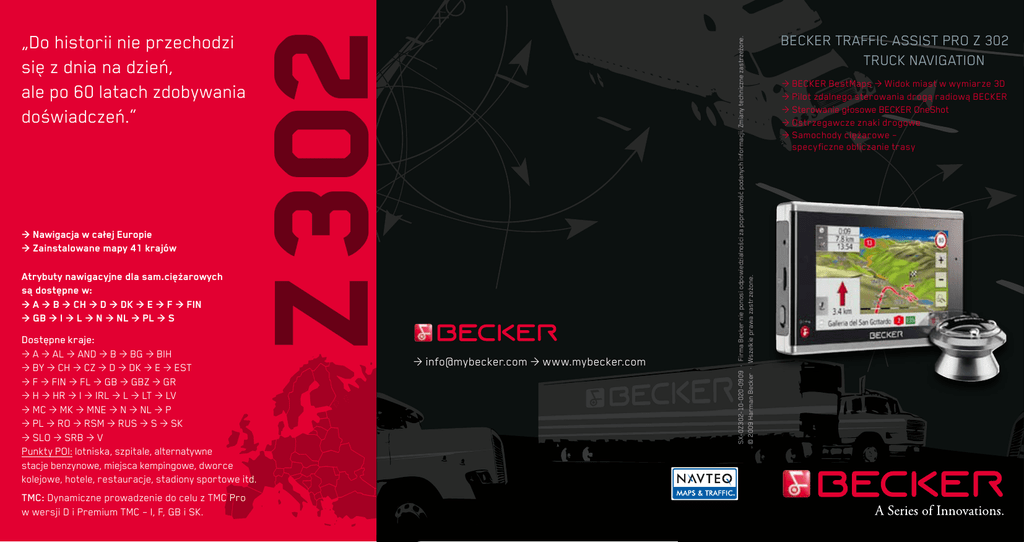 > Nawigacja w całej Europie > Zainstalowane mapy 41 krajów Atrybuty nawigacyjne dla sam.ciężarowych są dostępne w: > A > B > CH > D > DK > E > F > FIN > GB > I > L > N > NL > PL > S Dostępne kraje: > A > AL > AND > B > BG > BIH > BY > CH > CZ > D > DK > E > EST > F > FIN > FL > GB > GBZ > GR > H > HR > I > IRL > L > LT > LV > MC > MK > MNE > N > NL > P > PL > RO > RSM > RUS > S > SK > SLO > SRB > V Punkty POI: lotniska, szpitale, alternatywne stacje benzynowe, miejsca kempingowe, dworce kolejowe, hotele, restauracje, stadiony sportowe itd. TMC: Dynamiczne prowadzenie do celu z TMC Pro w wersji D i Premium TMC – I, F, GB i SK. > [email protected] > www.mybecker.com SX-0Z302-10-020-0909 · Firma Becker nie ponosi odpowiedzialności za poprawność podanych informacji. Zmiany techniczne zastrzeżone. © 2009 Harman Becker · Wszelkie prawa zastrzeżone. Z 302 „Do historii nie przechodzi się z dnia na dzień, ale po 60 latach zdobywania doświadczeń.“ BECKER TRAFFIC ASSIST PRO Z 302 TRUCK NAVIGATION > BECKER BestMaps > Widok miast w wymiarze 3D > Pilot zdalnego sterowania drogą radiową BECKER > Sterowanie głosowe BECKER OneShot > Ostrzegawcze znaki drogowe > Samochody ciężarowe – specyficzne obliczanie trasy BECKER TRAFFIC ASSIST PRO Z 302 TRUCK NAVIGATION > HARDware > Cechy produktu >Samochody ciężarowe – specyficzne obliczanie trasy > 4 alternatywne trasy > Sterowanie głosowe BECKER OneShot > Pilot zdalnego sterowania drogą radiową: Innowacyjny pilot zdalnego sterowania 360°. Samochody ciężarowe – specyficzne obliczanie trasy: Najlepsze prowadzenie do celu, przy uwzględnieniu wymiarów takich, jak wysokość, szerokość, dane przyczepy i materiałów niebezpiecznych. Becker BestMaps: Bezpłatna aktualizacja map przez 24 miesiące w strefie pobierania plików mybecker.com (ważne tylko podczas rejestracji online przy użyciu załączonego oprogramowania w ciągu 30 dni po pierwszym uruchomieniu). Pełna prezentacja nawigacyjna 3D: Przestrzenna wizualizacja gór i dolin, miast oraz obiektów charakterystycznych dla Europy. Sterowanie głosowe BECKER OneShot: Pełne wprowadzenie adresu jednym poleceniem głosowym przez dwa zintegrowane mikrofony (D, E, F, GB, I, NL, PT). NAVTEQ Traffic Patterns: Optymalne prowadzenie do celu oparte na zgromadzonych danych o ruchu drogowym. Można w ten sposób ominąć newralgiczne węzły ruchu ulicznego w zależności od pory dnia i wymaganego czasu. (D, F, GB) Ostrzegawcze znaki drogowe: W miejscach niebezpiecznych prezentowane są na wyświetlaczu odpowiednie znaki ostrzegawcz. Technologia bezprzewodowa Bluetooth®: Bezprzewodowe łączenie z telefonami komórkowymi obsługującymi Bluetooth®, Profil Handsfree 1.5, pobranie książki tel., zestaw głośnomówiący, książka telefoniczna Tekst-to-Speech (TTS): Zapowiedź głosowa nazw ulic. Becker Smart Search: Często wybierane cele podróży są proponowane bezpoś-rednio jako cel jazdy. Drogowskazy: Wyświetlanie drogowskazów z nazwą miejscowości i wskazaniami kierunku na autostradach, pomocne przy wykonywaniu manewrów. > Software Szereg możliwości wprowadzania celu: Kod pocztowy, numer budynku, skrzyżowanie, punkty POI Wyszukiwanie punktów POI wzdłuż wyznaczonej trasy: Wybrane punkty POI np. stacje benzynowe, parkingi są wyszukiwane wzdłuż obliczonej trasy. Nowy: Więcej Punktów POI: np. cele specjalne (POI) dla sam. ciężarowych, Alternatywne stacje benzynowe, miejsca kempingowe, etc. Pamięć celu: Pamięć dla ponad 200 punktów docelowych. Lista trasy: Wylistowanie pojedynczych odcinków trasy. Informacja o trasie: Wyświetlona oraz głosowa informacja o szacowanym czasie dojazdu do celu, przewidywanego czasu jazdy i odległości do celu (także w przypadku wprowadzenia punktów tranzytowych). Wybór trasy (dozwolone/unikaj/ niedozwolone): Autostrada, drogi płatne, przeprawy promowe, drogi nieutwardzone, zawracanie. Asystent pasa ruchu: Informacja o wyborze właściwego pasa ruchu na skrzyżowaniach np. podczas skrętu. Kalkulacja trasy: Możliwość wyboru profilu (Samochody ciężarowe – specyficzne obliczanie trasy, pojazd zwykły, pojazd szybki, pojazd wolny, motocykl, rower, pieszy). Nawigacja: Komunikaty głosowe oraz menu w różnych językach (BG, CY, CZ, D, DK, E, EE, F, FIN, GB, GR, HR, HU, I, LT, LV, N, P, PL, RO, RU, S, SK, SLO, SRB, TR, UA, Vlaams). Dopuszczalna prędkość: Informacja o dopuszczalnej prędkości wyświetlana na ekranie, sygnał dźwiękowy ostrzegający kierowcę o przekroczeniu zaprogramowanego progu. Widok mapy: Tryb dzienny-/nocny dla optymalnej czytelności (specjalnie rozbudowany nocny design), Jasność ekranu ręcznie regulowana zarówno w dzień i w nocy, automatyczne ściemnienie ekranu po wjechaniu do tunelu, 2D/3D/Zoom, pojawiające się przy przekraczaniu granicy. > Media-player Przeglądarka zdjeć: Przeglądarka zdjęć, pokaz slajdów. Format obrazu: JPG Odtwarzacz MP3/Video: Czas trwania utworu, foldery, id3tag (tytuł utworu i wykonawca), Formaty kompresji: MP3, MPEG-4 Part2 > OPcje Zasilacz sieciowy (110 - 220 V do 5 V), torba, przewód łączący umożliwiający wygodną integrację z instalacją pokładową samochodu Prędkość: Procesor 600 MHz Pamięć wewnętrzna: Pamięć wewnętrzna 4 GB z zainstalowanymi mapami 41 krajów Europy Gps: GPS SIRF III Automatyczne wł./wył.: Automatycznie włączanie/wyłączanie urządzenia po starcie silnika lub jego wyłączeniu. Wyświetlacz: Dotykowy ekran TFT 4.3 cala 16:9, 16-bitowa głębia koloru, 65536 kolorów Wymiary: 126,4 mm x 81,4 mm x 19,7 mm (szer. x wys. x głęb.) Ciężar: 214 g > Podłączenie Podłączenia: wejście na słuchawki,przewód instalacyjny do gniazda zapalniczki w pojeździe (12 V/24 V),Podłączenie wielofunkcyjnej stacji dokującej Karta micro SD do 2 GB > Zawartość opakowania Traffic Assist Pro Z 302, pilot zdalnego sterowania drogą radiową, samochodowe urządzenie ładujące 12V/24V, aktywne zamocowanie (przyłącze