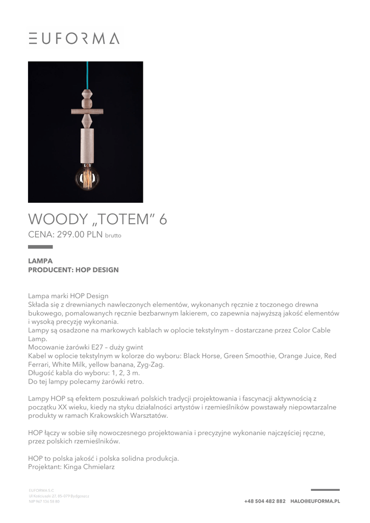 WOODY „TOTEM” 6 CENA: 299.00 PLN brutto LAMPA PRODUCENT: HOP DESIGN Lampa marki HOP Design Składa się z drewnianych nawleczonych elementów, wykonanych ręcznie z toczonego drewna bukowego, pomalowanych ręcznie bezbarwnym lakierem, co zapewnia najwyższą jakość elementów i wysoką precyzję wykonania. Lampy są osadzone na markowych kablach w oplocie tekstylnym – dostarczane przez Color Cable Lamp. Mocowanie żarówki E27 – duży gwint Kabel w oplocie tekstylnym w kolorze do wyboru: Black Horse, Green Smoothie, Orange Juice, Red Ferrari, White Milk, yellow banana, Zyg-Zag. Długość kabla do wyboru: 1, 2, 3 m. Do tej lampy polecamy żarówki retro. Lampy HOP są efektem poszukiwań polskich tradycji projektowania i fascynacji aktywnością z początku XX wieku, kiedy na styku działalności artystów i rzemieślników powstawały niepowtarzalne produkty w ramach Krakowskich Warsztatów. HOP łączy w sobie siłę nowoczesnego projektowania i precyzyjne wykonanie najczęściej ręczne, przez polskich rzemieślników. HOP to polska jakość i polska solidna produkcja. Projektant: Kinga Chmielarz Kolor kabla: Black Horse, Green Smoothie, Orange Juice, Red Ferrari, White Milk, yellow banana, Zyg-Zag. Długość kabla : 1 m, 2 m, 3 m Źródło światła w komplecie: nie Czas oczekiwania: ok 4-5 dni Kabel w oplocie tekstylnym w kolorze do wyboru Do tej lampy polecamy żarówki retro Powered by TCPDF (www.tcpdf.org)