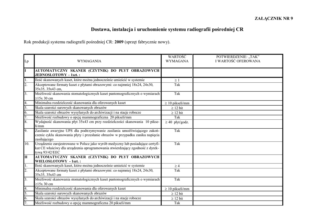 ZAŁĄCZNIK NR 9 Dostawa, instalacja i uruchomienie systemu radiografii pośredniej CR Rok produkcji systemu radiografii pośredniej CR: 2009 (sprzęt fabrycznie nowy). Lp I 1. 2. 3. 4. 5. 6. 7. 8. 9. 10. II 1. 2. 3. 4. 5. 6. 7. WYMAGANIA AUTOMATYCZNY SKANER (CZYTNIK) DO PŁYT OBRAZOWYCH JEDNOSLOTOWY – 1szt. : Ilość skanowanych kaset, które można jednocześnie umieścić w systemie Akceptowane formaty kaset z płytami obrazowymi: co najmniej 18x24, 24x30, 35x35, 35x43 cm, Możliwość skanowania stomatologicznych kaset pantomograficznych o wymiarach ³15x 30 cm Minimalna rozdzielczość skanowania dla oferowanych kaset Skala szarości surowych skanowanych obrazów Skala szarości obrazów wysyłanych do archiwizacji i na stacje robocze Możliwość rozbudowy o opcję mammograficzna 20 pikseli/mm Wydajność skanowania płyt 35x43 cm przy rozdzielczości skanowania 10 pikseli/mm Zasilanie awaryjne UPS dla podtrzymywanie zasilania umożliwiającego zakończenie cyklu skanowania płyty i przesłanie obrazów w przypadku zaniku napięcia zasilającego Urządzenie zarejestrowane w Polsce jako wyrób medyczny lub posiadające certyfikat CE właściwy dla urządzenia oprogramowania stwierdzający zgodność z dyrektywą 93/42/EEC AUTOMATYCZNY SKANER (CZYTNIK) DO PŁYT OBRAZOWYCH WIELOSLOTOWY - 1szt. : Ilość skanowanych kaset, które można jednocześnie umieścić w systemie Akceptowane formaty kaset z płytami obrazowymi: co najmniej 18x24, 24x30, 35x35, 35x43 cm Możliwość skanowania stomatologicznych kaset pantomograficznych o wymiarach ³15x 30 cm Minimalna rozdzielczość skanowania dla oferowanych kaset Skala szarości surowych skanowanych obrazów Skala szarości obrazów wysyłanych do archiwizacji i na stacje robocze Możliwość rozbudowy o opcję mammograficzna 20 pikseli/mm WARTOŚĆ WYMAGANA ³1 Tak Tak ³ 10 pikseli/mm ³ 12 bit ³ 12 bit Tak ³ 40 płyt/godz. Tak Tak ³4 Tak Tak ³ 10 pikseli/mm ³ 12 bit ³ 12 bit Tak POTWIERDZENIE: „TAK” I WARTOŚĆ OFEROWANA 8. 9. 10. III 1. 2. 3. 4. 5. 6. 7. 8. 9. 10. 11. IV 1. 2. 3. 4. 5. 6. 7. 8. 9. 10. Wydajność skanowania płyt 35x43 cm przy rozdzielczości skanowania 10 pikseli/mm Zasilanie awaryjne UPS dla podtrzymywanie zasilania umożliwiającego zakończenie cyklu skanowania płyty i przesłanie obrazów w przypadku zaniku napięcia zasilającego Urządzenie zarejestrowane w Polsce jako wyrób medyczny lub posiadające certyfikat CE właściwy dla urządzenia oprogramowania stwierdzający zgodność z dyrektywą 93/42/EEC KASETY Z PŁYTAMI OBRAZOWYMI : Gwarantowana przez producenta trwałość płyty (ilość cykli skanowania) Kaseta nie zintegrowana z ekranem (oddzielny element) Kaseta z płytą obrazową, rozmiar 35x43 cm Kratka do CR, rozmiar 35x43 cm Kaseta o rozmiarze min. 35x80 do zdjęć kości długich z kratką Kaseta z płytą obrazową, rozmiar 24x30 cm Kratka do CR, rozmiar 24x30 cm Kaseta z płytą obrazową rozmiar 18x24 cm Stojak z kratką umożliwiający wykonanie zdjęć kości długich o min. rozmiarze 35x120 cm Automatycznie obróbka wymienionych powyżej formatów kaset (dla formatu 35x80 cm dopuszcza się przed skanowaniem przełożenie płyt do kaset 35x43 cm ) Kasety zarejestrowane w Polsce jako wyrób medyczny lub posiadające certyfikat CE właściwy dla urządzenia oprogramowania stwierdzający zgodność z dyrektywą 93/42/EEC STANOWISKO TECHNIKA DO PRZYPISYWANIA DANYCH PACJENTA DO OBRAZÓW - 6 szt. : Stanowisko technika zintegrowane lub niezintegrowane ze skanerem (czytnikiem) Cztery stacje technika zainstalowane przy aparatach rentegnowskich a dwie stacje przy skanerach Interfejs użytkownika w języku polskim Przekątna ekranu monitora dotykowego Wprowadzanie danych przy pomocy ekranu dotykowego oraz przy pomocy klawiatury i myszki Wprowadzanie danych przy pomocy czytnika kodu kreskowego ³ 60 płyt/godz. Pobieranie listy pacjentów z systemu RIS poprzez mechanizm DICOM WORKLIST Dołączanie danych demograficznych pacjenta i rodzaju badaniu do obrazu CR przed i po ekspozycji Dostęp do stacji tylko dla osób uprawnionych przez logowanie Wielopoziomowy dostęp do zaawansowanych opcji zależny od uprawnień nada- Tak Tak Tak ³ 10 000 Tak 20 szt. 1 szt. 1 szt. 10 szt. 1 szt. 2 szt. 1 szt. Tak Tak Tak Tak Tak ³ 19” Tak Tak Tak Tak Tak 11. 12. 13. 14. 15. 16. 17. 18. 19. 20. 21. 22. 23. 24. 25. 26. V 1. 2. 3. 4. 5. 6. nych poszczególnym technikom Podstawowe oprogramowanie do obróbki zeskanowanych obrazów: - zmiana zaczernienia i kontrastu, - obracanie obrazu, - prezentacja pozytyw – negatyw, Oprogramowanie polepszające jakość zdjęcia, usuwające obraz kratki przeciwrozproszeniowej i umożliwiające ręczne blendowanie (przesłanianie) obrazu Oprogramowanie pediatryczne do wstępnej, dedykowanej obróbki badań dzieci (obok procedur predefiniowanych fabrycznie, możliwość definiowania własnych programów wstępnej obróbki ) Automatyczne dodawanie do obrazu skali centymetrowej lub inne podobne rozwiania pozwalające określić odleglość Wykonywanie badań kości długich – oprogramowanie automatycznie łączące obraz do rozmiaru min. 35x80 cm Umieszczania komentarzy w dowolnym miejscu na zeskanowanym obrazie Ilość zdefiniowanych elektronicznych markerów (znaczników) Wyświetlanie na ekranie znacznika umożliwiającego jednoznaczną identyfikację kierunku i narożnika kasety Wydruk obrazu w trybie TRUE-SIZE (skala 1:1) a w przypadku wydruku na mniejszym filmie możliwość kadrowania obrazu Obsługa kilku skanerów jednocześnie Prowadzenie kilku otwartych badań (procedur) jednocześnie na kilku zestawach rtg w różnych gabinetach rtg, np. podczas wykonywania zdjęć kontrastowych z odstępem czasowym Uzyskiwania na stacji informacji o statusie suchego systemu wydruku Transmisja obrazu przez technika do wybranych wielu miejsc docelowych Kompozytor wydruków i wydruk obrazów bezpośrednio ze stacji technika poprzez mechanizm DICOM Print, podział kliszy min. 1x1, 1x2,