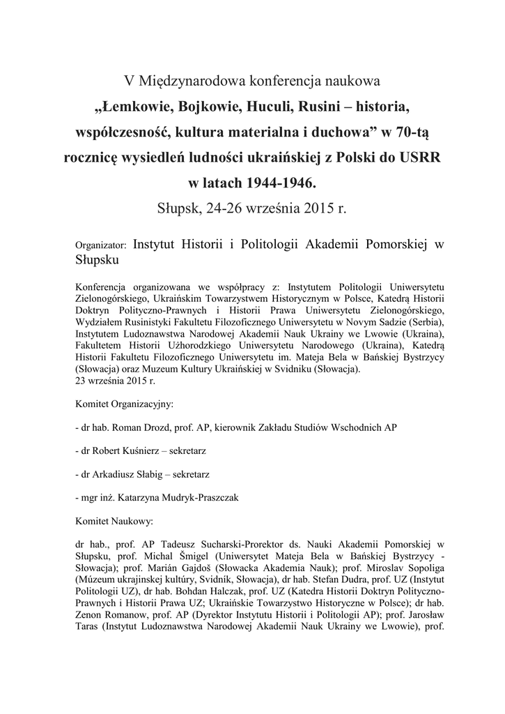 V Międzynarodowa konferencja naukowa „Łemkowie, Bojkowie, Huculi, Rusini – historia, współczesność, kultura materialna i duchowa” w 70-tą rocznicę wysiedleń ludności ukraińskiej z Polski do USRR w latach 1944-1946. Słupsk, 24-26 września 2015 r. Organizator: Instytut Historii i Politologii Akademii Pomorskiej w Słupsku Konferencja organizowana we współpracy z: Instytutem Politologii Uniwersytetu Zielonogórskiego, Ukraińskim Towarzystwem Historycznym w Polsce, Katedrą Historii Doktryn Polityczno-Prawnych i Historii Prawa Uniwersytetu Zielonogórskiego, Wydziałem Rusinistyki Fakultetu Filozoficznego Uniwersytetu w Novym Sadzie (Serbia), Instytutem Ludoznawstwa Narodowej Akademii Nauk Ukrainy we Lwowie (Ukraina), Fakultetem Historii Użhorodzkiego Uniwersytetu Narodowego (Ukraina), Katedrą Historii Fakultetu Filozoficznego Uniwersytetu im. Mateja Bela w Bańskiej Bystrzycy (Słowacja) oraz Muzeum Kultury Ukraińskiej w Svidniku (Słowacja). 23 września 2015 r. Komitet Organizacyjny: - dr hab. Roman Drozd, prof. AP, kierownik Zakładu Studiów Wschodnich AP - dr Robert Kuśnierz – sekretarz - dr Arkadiusz Słabig – sekretarz - mgr inż. Katarzyna Mudryk-Praszczak Komitet Naukowy: dr hab., prof. AP Tadeusz Sucharski-Prorektor ds. Nauki Akademii Pomorskiej w Słupsku, prof. Michal Šmigel (Uniwersytet Mateja Bela w Bańskiej Bystrzycy Słowacja); prof. Marián Gajdoš (Słowacka Akademia Nauk); prof. Miroslav Sopoliga (Múzeum ukrajinskej kultúry, Svidník, Słowacja), dr hab. Stefan Dudra, prof. UZ (Instytut Politologii UZ), dr hab. Bohdan Halczak, prof. UZ (Katedra Historii Doktryn PolitycznoPrawnych i Historii Prawa UZ; Ukraińskie Towarzystwo Historyczne w Polsce); dr hab. Zenon Romanow, prof. AP (Dyrektor Instytutu Historii i Politologii AP); prof. Jarosław Taras (Instytut Ludoznawstwa Narodowej Akademii Nauk Ukrainy we Lwowie), prof. Janko Ramač ( Wydział Rusinistyki Fakultetu Filozoficznego Uniwersytetu w Novym Sadzie, Serbia), dr Piotr Pochyły (Instytut Politologii UZ). Przyjazd- zakwaterowanie w Domu Studenta (D.S.) nr 3 lub 4 (ul. Arciszewskiego 22 a) 19:00-21:00 – Kolacja (stołówka „Riwiera”, D.S. nr 1 ul. Arciszewskiego 22a) 24 września 2015 r. 7.00- 8.00 - Śniadanie (stołówka „Riwiera”, D.S. nr 1 ul. Arciszewskiego 22a) 8.00-9.00 - Rejestracja uczestników (ul. Boh. Westerplatte 64, przed wejściem do auli 414) 9.00-9.10 - Przywitanie zebranych: J.M. Rektor Akademii Pomorskiej w Słupsku dr hab. prof. AP Roman Drozd 9.10-9.20 - Wystąpienia zaproszonych gości: Obrady plenarne (aula 414 ul. Boh. Westerplatte 64) Moderator: Roman Drozd, dr hab., prof. AP 9.20-9.40 Jan Pisuliński, dr hab. prof. UR Przesiedlenia ludności polskiej z USRR i ukraińskiej z Polski w latach 1944-1946. 9.40-10.00 Bohdan Halczak, dr hab. prof. UZ, Michal Šmigel’, Doc. PhDr., PhD. Univerzita Mateja Bela v Banskej Bystrici, Słowacja, Czechosłowacja wobec wysiedlenia ludności ukraińskiej z Polski do USRR w latach 1944-1946. 10.00-10.20 Tadeusz Sucharski, dr hab. prof. AP, Ty nie chciałeś wyjechać z Podola, on też nie chce ze swoich Bieszczadów’. O problemie deportacji w prozie polskiej. 10.20-10.40 Dyskusja 11:00 – obrady w sekcjach Sekcja A Historia Podsekcja A I Historia: Okres do 1945 r. (sala 317, ul. Boh. Westerplatte 64) Moderator: Michal Šmigel’, Doc. PhDr., PhD. 11.00-11.15 Martina Škutová, mgr, Słowacja, Život východných kresťanov v Šariši v 16. 11.15-11.30 Володимир Піпаш, Закарпатська обласна державна адміністрація, начальник управління інформаційної діяльності та комунікацій із громадськістю, Гуцульська республіка (1918-1919 рр.) – феноменальна сторінка українського державотворення на Закарпатті. 11.30-11.45 Роман Піняжко, доцент, Львіський національний медичний університет ім. Данила Галицького, Роль Команчівської та гуцульської республік в інтегральному процесі українського державотворення в XX столітті. 11.45-12.00 Miroslav Sopoliga, Dr.h.c., PhDr., DrSc, Svidník, Słowacja, Múzeum ukrajinskej kultúry, Особливості формування сільських поселень русинів-українців Східної Словаччини. 12.00-12.20 Dyskusja 12.20-12.40 Przerwa na kawę (Galeria Akademicka) 12.40-12.55 Peter Švorc, Univ. prof. PhDr., CSc., Filozofická fakulta Prešovskej univerzity, Słowacja, Rusíni a židia po vzniku Československa. Hľadanie novej koexistencie. 12.55-13.10 Tamara Włodarczyk, mgr, Uniwersytet Wrocławski, Relacje łemkowskożydowskie w czasie II wojny światowej. 13.10-13.25 Дюра Гарді, Dr Sc, професор, Філософічний факультет у Новому Саді, Serbia, Історіографічна й публіцистична творчість єпикопа Діонісія Няраді в контексті релігійного й національного ідентитету бачвансько-сремських русинів. 13.25-13.40 Тамара Пацай, Інститут народознавства НАНУ, Конференційна діяльність Етнографічної комісії НТШ у 20-30-х рр. ХХ ст.: характер і тематика. 13.40-14.00 Dyskusja 14.00-14.15 Stanisław Konečný, PhDr., CSc., SAV v Košiciach, Słowacja, Podkarpatská Rus a ústavné zmeny v rokoch 1918 – 1945. 14.15-14.30 Олександр Гаврилюк, доцент, Східноєвропейський національний університет ім. Лесі Українки, Державна політика 