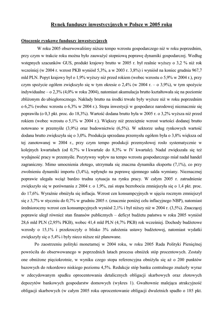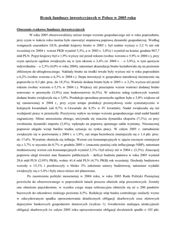 Rynek funduszy inwestycyjnych w Polsce w 2005 roku Otoczenie rynkowe funduszy inwestycyjnych W roku 2005 obserwowaliśmy niŜsze tempo wzrostu gospodarczego niŜ w roku poprzednim, przy czym w trakcie roku moŜna było zauwaŜyć stopniową poprawę dynamiki gospodarczej. Według wstępnych szacunków GUS, produkt krajowy brutto w 2005 r. był realnie wyŜszy o 3,2 % niŜ rok wcześniej (w 2004 r. wzrost PKB wyniósł 5,3%, a w 2003 r. 3,8%) i wyniósł na koniec grudnia 967,7 mld PLN. Popyt krajowy był o 1,9% wyŜszy niŜ przed rokiem (wobec wzrostu o 5,9% w 2004 r.), przy czym spoŜycie ogółem zwiększyło się w tym okresie o 2,4% (w 2004 r. – o 3,9%), w tym spoŜycie indywidualne – o 2,3% (4,0% w roku 2004), natomiast akumulacja brutto kształtowała się na poziomie zbliŜonym do ubiegłorocznego. Nakłady brutto na środki trwałe były wyŜsze niŜ w roku poprzednim o 6,2% (wobec wzrostu o 6,3% w 2004 r.). Stopa inwestycji w gospodarce narodowej nieznacznie się poprawiła (o 0,3 pkt. proc. do 18,3%). Wartość dodana brutto była w 2005 r. o 3,2% wyŜsza niŜ przed rokiem (wobec wzrostu o 5,1% w 2004 r.). Większy niŜ przeciętnie wzrost wartości dodanej brutto notowano w przemyśle (3,9%) oraz budownictwie (6,5%). W sektorze usług rynkowych wartość dodana brutto zwiększyła się o 3,0%. Produkcja sprzedana przemysłu ogółem była o 3,8% większa od tej zanotowanej w 2004 r., przy czym tempo produkcji przemysłowej rosło systematycznie w kolejnych kwartałach (od 0,7% w I kwartale do 8,3% w IV kwartale). Nadal zwiększała się teŜ wydajność pracy w przemyśle. Pozytywny wpływ na tempo wzrostu gospodarczego miał nadal handel zagraniczny. Mimo umocnienia złotego, utrzymała się znaczna dynamika eksportu (7,1%), co przy zwolnieniu dynamiki importu (3,4%), wpłynęło na poprawę ujemnego salda wymiany. Nieznacznej poprawie ulegała wciąŜ bardzo trudna sytuacja na rynku pracy. W całym 2005 r. zatrudnienie zwiększyło się w porównaniu z 2004 r. o 1,9%, zaś stopa bezrobocia zmniejszyła się o 1,4 pkt. proc. do 17,6%. Wyraźnie obniŜyła się inflacja. Wzrost cen konsumpcyjnych w ujęciu rocznym zmniejszył się z 3,7% w styczniu do 0,7% w grudniu 2005 r. (znacznie poniŜej celu inflacyjnego NBP), natomiast średnioroczny wzrost cen konsumpcyjnych wyniósł 2,1% i był niŜszy niŜ w 2004 r. (3,5%). Znaczącej poprawie uległ równieŜ stan finansów publicznych – deficyt budŜetu państwa w roku 2005 wyniósł 28,6 mld PLN (2,95% PKB), wobec 41,4 mld PLN (4,7% PKB) rok wcześniej. Dochody budŜetowe wzrosły o 15,1% i przekroczyły o blisko 3% załoŜenia ustawy budŜetowej, natomiast wydatki zwiększyły się o 5,4% i były nieco niŜsze niŜ planowane. Po zaostrzeniu polityki monetarnej w 2004 roku, w roku 2005 Rada Polityki PienięŜnej powróciła do obserwowanego w poprzednich latach procesu obniŜek stóp procentowych. Zostały one obniŜone pięciokrotnie, w wyniku czego stopa referencyjna obniŜyła się aŜ o 200 punktów bazowych do rekordowo niskiego poziomu 4,5%. Redukcje stóp banku centralnego znalazły wyraz w zdecydowanym spadku oprocentowania detalicznych obligacji skarbowych oraz złotowych depozytów bankowych gospodarstw domowych (wykres 1). Gwałtownie malejąca atrakcyjność obligacji skarbowych (w całym 2005 roku oprocentowanie obligacji dwuletnich spadło o 185 pkt. bazowych, obligacji trzyletnich o 267 pkt. bazowych, obligacji czteroletnich o 175 pkt. bazowych, a obligacji pięcioletnich i dziesięcioletnich o 200 pkt. bazowych) było przyczyną istotnego spadku wartości ich sprzedaŜy w minionych 12 miesiącach w porównaniu z rokiem 2004 (sprzedaŜ obligacji dwuletnich zmniejszyła się o 41%, zaś obligacji czteroletnich o 50%). Mimo zmniejszenia oprocentowania rocznych depozytów złotowych gospodarstw domowych o 1,2 pkt. proc. (z 4,4% do 3,2%) ich ogólna wartość wzrosła o blisko 10 mld PLN (5,7%), przy czym wynikało to ze wzrostu wartości depozytów bieŜących, gdyŜ wartość depozytów długoterminowych (do dwóch lat) zmniejszyła się o 1,2 mld PLN (-0,9%). Wykres 1. Oprocentowanie skarbowych obligacji detalicznych (dwu-, trzy- i czteroletnich) oraz rocznych depozytów złotowych gospodarstw domowych w 2005 roku. 7.0% 6.5% 6.0% 5.5% 5.0% 4.5% 4.0% 3.5% 3.0% I 2005 II III IV V VI VII VIII IX X XI XII oprocentow anie dw uletnich obligacji oszczędnościow ych (DOS) oprocentow anie czteroletnich obligacji oszczędnościow ych indeksow anych (COI) w I okresie odsetkow ym średnie w aŜone oprocentow anie rocznych depozytów złotow ych gospodarstw domow ych oprocentow anie obligacji trzyletnich (TZ) w I okresie odsetkow ym Źródło: opracowanie na podstawie danych MF i NBP. Bardzo powaŜną konkurencją dla funduszy inwestycyjnych w 2005 roku były natomiast, juŜ trzeci rok z rzędu, bezpośrednie inwestycje w akcje. Wiele róŜnorodnych moŜliwości inwestycyjnych zapewnił rynek pierwotny – zadebiutowało na nim 35 spółek (o jedną mniej niŜ rok wcześniej), w tym dwie zagraniczne. Dało to warszawskiej giełdzie trzecie miejsce w Europie (za Londynem i Oslo). Łączna wartość wszystkich ubiegłorocznych ofert wyniosła 6,98 mld PLN, z czego 5,25 mld PLN stanowiły środki uzyskane przez spółki w wyniku podwyŜszenia kapitału. Największymi ofertami na rynku pierwotnym w 2005 r. były PGNiG (2,68 mld PLN) oraz Lotos (ponad 1 mld PLN). Zdecydowana większość przeprowadzonych ofert zakończyła się sukcesem, czego dowodem było uplasowanie wszystkich oferowanych papierów, wysokie stopy redukcji 2 podczas subskrypcji oraz atrakcyjne stopy zwrotu dla inwestorów (często kilkunasto-, a czasami nawet kilkudziesięcioprocentowe „przebicia” podczas pierwszej sesji w stosunku do ceny emisyjnej). Jeszcze wyŜsze zyski stały się udziałem inwestorów na rynku wtórnym. Znakomita koniunktura na warszawskim parkiecie, będąca pochodną przede wszystkim bardzo dobrych wyników finansowych większośc