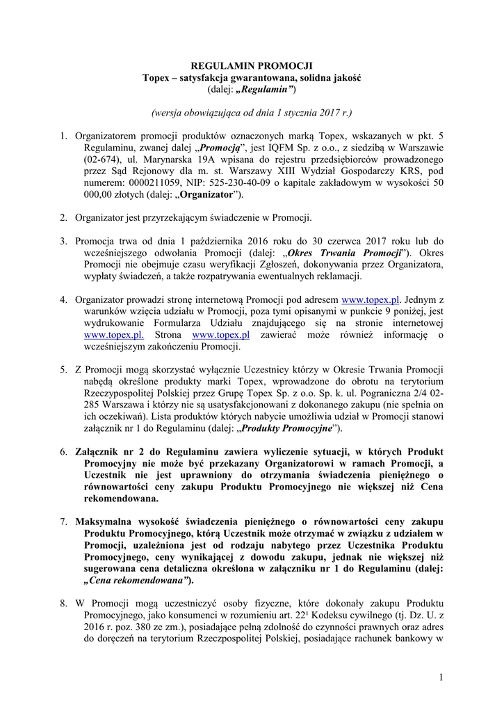 REGULAMIN PROMOCJI Topex – satysfakcja gwarantowana, solidna jakość (dalej: „Regulamin”) (wersja obowiązująca od dnia 1 stycznia 2017 r.) 1. Organizatorem promocji produktów oznaczonych marką Topex, wskazanych w pkt. 5 Regulaminu, zwanej dalej „Promocją”, jest IQFM Sp. z o.o., z siedzibą w Warszawie (02-674), ul. Marynarska 19A wpisana do rejestru przedsiębiorców prowadzonego przez Sąd Rejonowy dla m. st. Warszawy XIII Wydział Gospodarczy KRS, pod numerem: 0000211059, NIP: 525-230-40-09 o kapitale zakładowym w wysokości 50 000,00 złotych (dalej: „Organizator”). 2. Organizator jest przyrzekającym świadczenie w Promocji. 3. Promocja trwa od dnia 1 października 2016 roku do 30 czerwca 2017 roku lub do wcześniejszego odwołania Promocji (dalej: „Okres Trwania Promocji”). Okres Promocji nie obejmuje czasu weryfikacji Zgłoszeń, dokonywania przez Organizatora, wypłaty świadczeń, a także rozpatrywania ewentualnych reklamacji. 4. Organizator prowadzi stronę internetową Promocji pod adresem www.topex.pl. Jednym z warunków wzięcia udziału w Promocji, poza tymi opisanymi w punkcie 9 poniżej, jest wydrukowanie Formularza Udziału znajdującego się na stronie internetowej www.topex.pl. Strona www.topex.pl zawierać może również informację o wcześniejszym zakończeniu Promocji. 5. Z Promocji mogą skorzystać wyłącznie Uczestnicy którzy w Okresie Trwania Promocji nabędą określone produkty marki Topex, wprowadzone do obrotu na terytorium Rzeczypospolitej Polskiej przez Grupę Topex Sp. z o.o. Sp. k. ul. Pograniczna 2/4 02285 Warszawa i którzy nie są usatysfakcjonowani z dokonanego zakupu (nie spełnia on ich oczekiwań). Lista produktów których nabycie umożliwia udział w Promocji stanowi załącznik nr 1 do Regulaminu (dalej: „Produkty Promocyjne”). 6. Załącznik nr 2 do Regulaminu zawiera wyliczenie sytuacji, w których Produkt Promocyjny nie może być przekazany Organizatorowi w ramach Promocji, a Uczestnik nie jest uprawniony do otrzymania świadczenia pieniężnego o równowartości ceny zakupu Produktu Promocyjnego nie większej niż Cena rekomendowana. 7. Maksymalna wysokość świadczenia pieniężnego o równowartości ceny zakupu Produktu Promocyjnego, którą Uczestnik może otrzymać w związku z udziałem w Promocji, uzależniona jest od rodzaju nabytego przez Uczestnika Produktu Promocyjnego, ceny wynikającej z dowodu zakupu, jednak nie większej niż sugerowana cena detaliczna określona w załączniku nr 1 do Regulaminu (dalej: „Cena rekomendowana”). 8. W Promocji mogą uczestniczyć osoby fizyczne, które dokonały zakupu Produktu Promocyjnego, jako konsumenci w rozumieniu art. 22¹ Kodeksu cywilnego (tj. Dz. U. z 2016 r. poz. 380 ze zm.), posiadające pełną zdolność do czynności prawnych oraz adres do doręczeń na terytorium Rzeczpospolitej Polskiej, posiadające rachunek bankowy w 1 banku lub kasie spółdzielczej z siedzibą na terytorium Rzeczypospolitej Polskiej (dalej: „Uczestnicy”). Uczestnikami nie mogą być osoby fizyczne będące pracownikami Organizatora, Grupy Topex Sp. z o.o. Sp. k. (ul. Pograniczna 2/4 02-285 Warszawa) oraz kontrahenci Grupy Topex Sp. z o.o. Sp. k. zaangażowani w sprzedaż Produktów Promocyjnych. 9. Warunkiem wzięcia udziału w Promocji przez Uczestnika, który nie jest usatysfakcjonowany Produktem Promocyjnym, jest łączne spełnienie następujących warunków: a) b) c) Zakup w sklepie znajdującym się na terenie Rzeczypospolitej Polskiej, w Okresie Trwania Promocji jednego Produktu Promocyjnego (dalej: „Zakup Promocyjny”); Zachowanie oryginału dowodu dokonania zakupu Produktu Promocyjnego w postaci paragonu fiskalnego albo faktury VAT, świadczącego o dokonaniu zakupu Produktu Promocyjnego w Okresie Trwania Promocji; Jeżeli z dowodu dokonania Zakupu Promocyjnego nie wynika zakup Produktu Promocyjnego (nazwa towaru nie wskazuje na Produkt Promocyjny), wówczas Uczestnik powinien zwrócić się do sprzedawcy o dokonanie adnotacji na dowodzie Zakupu Promocyjnego wskazującej na fakt zakupu Produktu Promocyjnego (nazwa i model) opatrzonej pieczątką sprzedawcy i odręcznym czytelnym podpisem; Zgłoszenia Zakupu Promocyjnego w Okresie Trwania Promocji, jednak nie później niż w terminie 14 dni od dnia dokonania Zakupu Promocyjnego, poprzez wysłanie na adres Organizatora przesyłki pocztowej lub kurierskiej (paczka) zawierającej: - wydrukowany i prawidłowo uzupełniony formularz zgłoszenia do Promocji (dalej: „Formularz Udziału”) zawierający następujące dane (dalej: „Zgłoszenie”): i. imię i nazwisko Uczestnika; ii. adres zamieszkania Uczestnika; iii. adres poczty elektronicznej Uczestnika; iv. numer telefonu Uczestnika; v. numer rachunku bankowego Uczestnika prowadzonego przez bank lub kasę spółdzielczą z siedzibą w Rzeczypospolitej Polskiej, na który ma zostać dokonane przekazanie środków; vi. symbol zakupionego Produktu Promocyjnego; vii. kwota ceny za Produkt Promocyjny; viii. opisać na czym polega brak satysfakcji z nabytego Produktu Promocyjnego (dalej: „Opinia”) oraz ix. x. zapoznać się z Regulaminem (oznaczenie pola); wyrazić zgodę na przetwarzanie danych osobowych Uczestnika przez IQFM Sp. z o.o., z siedzibą w Warszawie (02-674), ul. Marynarska 19A w celu i zakresie związanym z realizacją Promocji, poprzez zaznaczenie odpowiedniego pola; 2 xi. xii. załączyć czytelną kopię dowodu dokonania Zakupu Promocyjnego w postaci paragonu fiskalnego lub faktury VAT potwierdzającą fakt spełnienia przez Uczestnika warunków udziału w Promocji; złożyć oświadczenie o przeniesieniu na Organizatora własności wskazanego w Zgłoszeniu Produktu Promocyjnego (pod warunkiem otrzymania świadczenia pieniężnego w wysokości równowartości ceny zakupu Produktu Promocyjnego w maksymalnej wysokości wskazanej w Regulaminie). - zakupiony przez Uczestnika Produkt Promocyjny wskazany w Zgłoszeniu, w stanie niespełniającym 