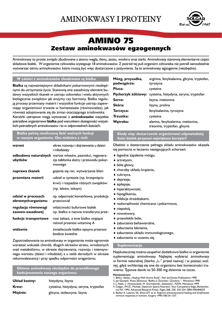 AMINOKWASY I PROTEINY Amino 75 Zestaw aminokwasów egzogennych Aminokwasy to proste związki zbudowane z atomu węgla, tlenu, azotu, wodoru oraz siarki. Aminokwasy stanowią elementarne części składowe białek. W organizmie człowieka występuje 18 aminokwasów. Z pośród tej puli organizm człowieka nie potrafi samodzielnie wytwarzać ośmiu aminokwasów, które muszą być więc dostarczone z pożywienia. Są to aminokwasy egzogenne (niezbędne). W całości z aminokwasów zbudowane są białka. Białka są najważniejszymi składnikami pokarmowymi niezbędnymi do utrzymania życia. Stanowią one zasadniczy element budowy wszystkich tkanek w ustroju człowieka i wielu aktywnych biologicznie związków jak enzymy czy hormony. Białka regulują procesy przemiany materii i wszystkie funkcje ustroju zapewniając organizmowi trwanie w homeostazie (równowadze), jak również adoptowanie się do zmian otaczającego środowiska. Komórki ustrojowe mogą wytwarzać z aminokwasów wszystkie potrzebne organizmowi białka pod warunkiem dostępności wszystkich potrzebnych aminokwasów i to w odpowiednich ilościach. Białka pełnią niezliczoną ilość ważnych funkcji w naszym organizmie. Oto niektóre z nich: wzrost okres rozwoju i dojrzewania u dzieci i młodzieży odbudowa naturalnych wzrost włosów, paznokci, regenera- ubytków cja nabłonka skóry i przewodu pokar- mowego Mózg, przysadka, arginina, fenyloalanina, glicyna, tryptofan, podwzgórze: tyrozyna Płuca: cysteina Pęcherzyk żółciowy: cysteina, histydyna, seryna, tryptofan Serce: lizyna, metionina Skóra: lizyna, prolina Tarczyca: fenyloalanina, tyrozyna Trzustka: cysteina Wątroba: alanina, fenyloalanina, metionina, treonina, tryptofan, glicyna Kiedy więc dostarczenie organizmowi odpowiedniej ilości białek przynosi największe korzyści? Dbałość o dostarczenie pełnego składu aminokwasów okazała się pomocna w leczeniu następujących schorzeń: ♦ łagodne zapalenie mózgu, ♦ artretyzm, ♦ bóle głowy, ♦ choroby układu krążenia, naprawa tkanek gojenie się ran, wytwarzanie blizn ♦ cukrzyca, przemiana materii udział w syntezie (np. krzepnięciu ♦ depresje, krwi) i rozpadzie różnych związków ♦ epilepsje, (np. leków, toksyn) ♦ hiperaktywność, ♦ hipoglikemia, udział w procesach np. odporność komórkowa, produkcja ♦ infekcje drożdżakami, obronnych organizmu przeciwciał ♦ nadwrażliwość chemiczna i pokarmowa, regulacja równowagi właściwości buforowe białek ♦ niepokój, zasowo-zasadowej np. białko o nazwie transferyna prze- ♦ nowotwory, ♦ przewlekłe bóle, funkcje transportowe nosi żelazo, a inne białko wiążące retinol przenosi witaminę A ♦ zaburzenia behawioralne, widzenie światłoczułe białko opsyna przenosi ♦ zaburzenia łaknienia, ♦ zaburzenia układu immunologicznego, bodźce świetlne ♦ zaburzenia w uczeniu się. Zapotrzebowanie na aminokwasy w organizmie może ogromnie wzrastać wskutek chorób, długich okresów stresu, wrodzonych Suplementacja wad metabolizmu, w okresie dojrzewania, rozwoju i intensywNajskuteczniej można uzupełnić dodatkowo białko w organizmie nego wzrostu (dzieci i młodzież) a u osób dorosłych w okresie suplementując aminokwasy. Najlepiej wybierać aminokwasy rekonwalescencji i przy spadku odporności oraganizmu. w formie naturalnej (literka „L-” przed nazwą) i w postaci wolnej, gdyż wchłaniają się one do organizmu bez konieczności traGłówne aminokwasy niezbędne do prawidłowego wienia. Typowe dawki to 50-300 mg dziennie na czczo. funkcjonowania naszego organizmu: Piśmiennictwo: Układ kostny: histydyna, lizyna Krew: cysteina, histydyna, seryna, tryptofan Mięśnie: glicyna, izoleucyna, lizyna 1.Billie J. Sahley „Healing With Amino Acids”, Pain and Stress Publications 1998 2.Jan Gawęcki, Praca Zbiorowa “Białka w Żywności i Żywieniu “, Warszawa 1998 3.J. Hasik, L. Hryniewiecki, M. Grymisławski „Dietetyka”, PZWL Warszawa 1999 4.Colgan, PH.D., Michael, Optimum Sports Nutrition: Your Competitive Edge (Ronkonkoma NY: 1993, Advanced Research Press), Pages 268, 330, 333-334. ISBN 096484059. 5.Barbul A, Lazarou SA, Efron DT, et al. Arginine enhanceswound healing and lymphocyte immune responses in humans. Surgery 1990;108:331-337.
