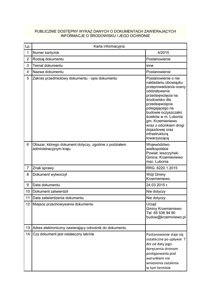PUBLICZNIE DOSTĘPNY WYKAZ DANYCH O DOKUMENTACH ZAWIERAJĄCYCH INFORMACJE O ŚRODOWISKU I JEGO OCHRONIE Lp. Karta informacyjna 1 Numer karty/rok 4/2015 2 Rodzaj dokumentu Postanowienie 3 Temat dokumentu inne 4 Nazwa dokumentu Postanowienie 5 Zakres przedmiotowy dokumentu - opis dokumentu Postanowienie o nie nakładaniu obowiązku przeprowadzania oceny oddziaływania przedsięwzięcia na środowisko dla przedsięwzięcia polegającego na budowie oczyszczalni ścieków w m. Lubonia gm. Krzemieniewo wraz z odcinkiem drogi dojazdowej oraz infrastrukturą towarzyszącą 6 Obszar, którego dokument dotyczy, zgodnie z podziałem administracyjnym kraju Województwo: wielkopolskie Powiat: leszczyński Gmina: Krzemieniewo msc. Lubonia 7 Znak sprawy RRG. 6220.1.2015 8 Dokument wytworzył Wójt Gminy Krzemieniewo 9 Data dokumentu 24.03.2015 r. 10 Dokument zatwierdził Nie dotyczy 11 Data zatwierdzenia dokumentu Nie dotyczy 12 Miejsce przechowywania dokumentu Urząd Gminy Krzemieniewo Tel. 65 536 94 90 [email protected] 13 Adres elektroniczny zawierający odnośnik do dokumentu 14 Czy dokument jest ostateczny tak/nie Postanowienie staje się ostateczne po upływie 7 dni od daty jego doręczenia stronom postępowania pod warunkiem nie wniesienia zażalenia w tym terminie 15 Numery kart innych dokumentów w sprawie 1/2015; 2/2015; 3/2015 16 Data zamieszczenia w wykazie danych o dokumencie 10.04.2015 17 Zastrzeżenia dotyczące nieudostępniania informacji 18 Uwagi