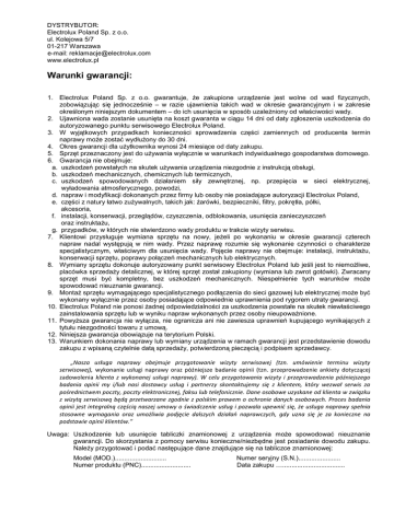 DYSTRYBUTOR: Electrolux Poland Sp. z o.o. ul. Kolejowa 5/7 01-217 Warszawa e-mail: [email protected] www.electrolux.pl Warunki gwarancji: 1. Electrolux Poland Sp. z o.o. gwarantuje, Ŝe zakupione urządzenie jest wolne od wad fizycznych, zobowiązując się jednocześnie – w razie ujawnienia takich wad w okresie gwarancyjnym i w zakresie określonym niniejszym dokumentem – do ich usunięcia w sposób uzaleŜniony od właściwości wady. 2. Ujawniona wada zostanie usunięta na koszt gwaranta w ciągu 14 dni od daty zgłoszenia uszkodzenia do autoryzowanego punktu serwisowego Electrolux Poland. 3. W wyjątkowych przypadkach konieczności sprowadzenia części zamiennych od producenta termin naprawy moŜe zostać wydłuŜony do 30 dni. 4. Okres gwarancji dla uŜytkownika wynosi 24 miesiące od daty zakupu. 5. Sprzęt przeznaczony jest do uŜywania wyłącznie w warunkach indywidualnego gospodarstwa domowego. 6. Gwarancja nie obejmuje: a. uszkodzeń powstałych na skutek uŜywania urządzenia niezgodnie z instrukcją obsługi, b. uszkodzeń mechanicznych, chemicznych lub termicznych, c. uszkodzeń spowodowanych działaniem siły zewnętrznej, np. przepięcia w sieci elektrycznej, wyładowania atmosferycznego, powodzi, d. napraw i modyfikacji dokonanych przez firmy lub osoby nie posiadające autoryzacji Electrolux Poland, e. części z natury łatwo zuŜywalnych, takich jak: Ŝarówki, bezpieczniki, filtry, pokrętła, półki, akcesoria, f. instalacji, konserwacji, przeglądów, czyszczenia, odblokowania, usunięcia zanieczyszczeń oraz instruktaŜu, g. przypadków, w których nie stwierdzono wady produktu w trakcie wizyty serwisu. 7. Klientowi przysługuje wymiana sprzętu na nowy, jeŜeli po wykonaniu w okresie gwarancji czterech napraw nadal występują w nim wady. Przez naprawę rozumie się wykonanie czynności o charakterze specjalistycznym, właściwym dla usunięcia wady. Pojęcie naprawy nie obejmuje: instalacji, instruktaŜu, konserwacji sprzętu, poprawy połączeń mechanicznych lub elektrycznych. 8. Wymiany sprzętu dokonuje autoryzowany punkt serwisowy Electrolux Poland lub jeśli jest to niemoŜliwe, placówka sprzedaŜy detalicznej, w której sprzęt został zakupiony (wymiana lub zwrot gotówki). Zwracany sprzęt musi być kompletny, bez uszkodzeń mechanicznych. Niespełnienie tych warunków moŜe spowodować nieuznanie gwarancji. 9. MontaŜ sprzętu wymagającego specjalistycznego podłączenia do sieci gazowej lub elektrycznej moŜe być wykonany wyłącznie przez osoby posiadające odpowiednie uprawnienia pod rygorem utraty gwarancji. 10. Electrolux Poland nie ponosi Ŝadnej odpowiedzialności za uszkodzenia powstałe na skutek niewłaściwego zainstalowania sprzętu lub w wyniku napraw wykonanych przez osoby nieupowaŜnione. 11. PowyŜsza gwarancja nie wyłącza, nie ogranicza ani nie zawiesza uprawnień kupującego wynikających z tytułu niezgodności towaru z umową. 12. Niniejsza gwarancja obowiązuje na terytorium Polski. 13. Warunkiem dokonania naprawy lub wymiany urządzenia w ramach gwarancji jest przedstawienie dowodu zakupu z wpisaną czytelnie datą sprzedaŜy, potwierdzoną pieczęcią i podpisem sprzedawcy. „Nasza usługa naprawy obejmuje przygotowanie wizyty serwisowej (tzn. umówienie terminu wizyty serwisowej), wykonanie usługi naprawy oraz późniejsze badanie opinii (tzn. przeprowadzenie ankiety dotyczącej zadowolenia klienta z wykonanej usługi naprawy). W celu przygotowania wizyty i przeprowadzenia późniejszego badania opinii my i/lub nasi dostawcy usług i partnerzy skontaktujemy się z klientem, który wezwał serwis za pośrednictwem poczty, poczty elektronicznej, faksu lub telefonicznie. Dane osobowe uzyskane od klienta w związku z wizytą serwisową będą przetwarzane zgodnie z polskim prawem o ochronie danych osobowych. Proces badania opinii jest integralną częścią naszej umowy o świadczenie usług i pozwala upewnić się, że usługa naprawy spełnia stosowne wymagania oraz umożliwia podjęcie dalszych działań naprawczych, gdy uzna się je za konieczne na podstawie opinii klientów.” Uwaga: Uszkodzenie lub usunięcie tabliczki znamionowej z urządzenia moŜe spowodować nieuznanie gwarancji. Do skorzystania z pomocy serwisu konieczne/niezbędne jest posiadanie dowodu zakupu. NaleŜy przygotować i podać następujące dane znajdujące się na tabliczce znamionowej: Model (MOD.)............................ Numer produktu (PNC)........................... Numer seryjny (S.N.)....................... Data zakupu …..................................
