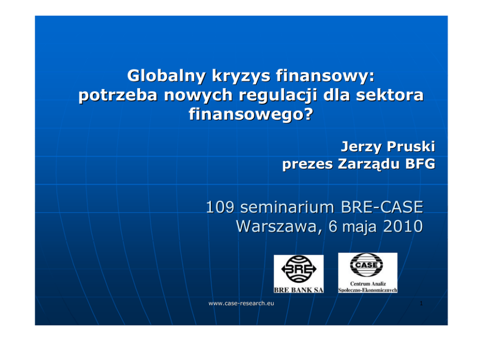 Globalny kryzys finansowy: potrzeba nowych regulacji dla sektora finansowego? Jerzy Pruski prezes Zarządu BFG 109 seminarium BRE-CASE Warszawa, 6 maja 2010 www.casewww.case-research.eu 1 Kryzys finansowy 2008 r Przyczyny i zastosowane narzędzia antykryzysowe 2 Błędy w polityce makroekonomicznej Polityka makroekonomiczna Polityka pienięŜna Zbyt długie utrzymywanie stóp procentowych na coraz niŜszym poziomie Doktryna zakazująca kontroli cen aktywów finansowych, ale akcentująca konieczność eliminacji skutków załamania na rynkach aktywów finansowych Niedocenianie znaczenia agregatów pienięŜno-kredytowych Polityka kursowa RóŜnorodność systemów kursowych w poszczególnych regionach Polityka fiskalna Antycykliczna w okresie recesji i procykliczna w okresie oŜywienia Łącznie zbyt ekspansywna polityka fiskalna i narastanie długu publicznego Powstanie globalnych nierównowag 3 Błędy w polityce nadzorczo-regulacyjnej Polityka nadzorczo-regulacyjna Ocena ryzyka Akceptowanie zbyt niskich wymogów kapitałowych i płynnościowych Monitoring Brak postrzegania i reakcji na błędy w modelach biznesowych sektora prywatnego Efektywność Niska skuteczność Procykliczność Niska efektywność w zakresie prewencji Ryzyko pokusy naduŜycia 4 Błędy sektora prywatnego Sektor prywatny Zorientowanie na krótkoterminowy zysk Utrata perspektywy długoterminowej Niedoszacowanie ryzyka Model biznesowy Stymulowanie przyspieszonego obrotu – model „oryginate and distribute” Stymulowane zwiększonej dostępności produktów – kredyty dla „sub-prime” Ekspansja długoterminowych aktywów finansowanych krótkoterminowym pieniądzem Finansowanie rozwoju działalności Sekurytyzacja Rozwój instrumentów pochodnych Zarządzanie ryzykiem Niedocenianie znaczenia zobowiązań pozabilansowych „Stadne zachowania” 5 Instrumenty uŜyte dla zwalczania kryzysu Skala interwencji Instrumenty wsparcia Mierzona liczbą interwencji narastająco W okresie lipiec 2007 – lipiec 2009 Rosnące deficyty budŜetowe W zakresie polityki monetarnej i płynności Instrumenty stabilizacyjne Wykup aktywów Gwarancje Rekapitalizacja Wsparcie płynności. Zmiany stóp Upadek Lehman Brothers 14-09-2008 Redukcja bazowych stóp procentowych Wsparcie płynnościowe System gwarancji Wykup aktywów Rekapitalizacja Do upadku Lehman Brothers działania antykryzysowe prowadziły jedynie banki centralne Na działania antykryzysowe wydatkowano wysokie kwoty ze źródeł publicznych 6 Skala działań interwencyjnych – wymiar uŜytych środków finansowych Wsparcie dla sektora finansowego oraz innych sektorów Stan na lipiec 2009 jako % PKB z 2008 r. Skala działań interwencyjnych Kraj Rekapitalizacja Wykup aktywów Gwarancje Wsparcie płynnościowe Finansowanie rządowe up-front Kraje wysoko rozwinięte Gwarancje Rekapitalizacja Wykup aktywów Razem jako % Dochodu Narodowego Kraje rozwijające się w G-20 Liczba interwencji Realizacja interwencji antykryzysowych wymaga znaczących środków finansowych: - w krajach wysoko rozwiniętych wsparcie antykryzysowe pochłonęło ok. 30% PKB - w gwarancje, rekapitalizację i wykup aktywów w strefie Euro zaangaŜowano blisko 20% PKB. 7 Skuteczność narzędzi antykryzysowych Polityka pienięŜna 8 ObniŜki stóp procentowych - USA Zmiana PKB i stopa referencyjna (%) 5,0% PKB (lewa oś) 9,00 Stopa referencyjna 4,0% 8,00 3,0% 7,00 Niskie stopy procentowe były ustalane: - na coraz dłuŜsze okresy, - na coraz niŜszym poziomie 6,00 2,0% 5,00 1,0% Pobudzanie konsumpcji i inwestycji w coraz krótszym okresie 4,00 0,0% 3,00 -1,0% 2,00 -2,0% 1,00 2009 2008 2007 2006 2005 2004 2003 2002 2001 2000 1999 1998 1997 1996 1995 1994 1993 1992 1991 1990 -3,0% 0,00 Konsumpcja (bln USD) Inwestycje (bln USD) 7% 10,0 6% 9,5 5% 9,0 4% 8,5 3% 8,0 2% 7,5 2,4 2,2 10% 2,0 0% 1,8 1,6 -10% 1,4 1,2 -20% 1,0 2009 2008 2007 2006 2005 2004 2003 2002 2001 2000 1999 1998 1997 1996 1995 1994 1993 1992 0,8 1991 -30% 1990 2009 2008 2007 2006 2005 2004 2003 2002 2001 2000 1999 1998 5,0 1997 -3% 1996 5,5 1995 -2% 1994 6,0 1993 -1% 1992 6,5 1991 7,0 0% 1990 1% Źródło: BEA, Reuters. 9 Dynamiczny wzrost akcji kredytowej - USA Kredyty - wolumen (bln USD) i dynamika (%) Wolumen (prawa skala) Stopa referencyjna Dynamika Ogółem Przedsiębiorstwa 0,7 1% -20% Nieruchomości 2009 2008 2007 2010 1% 0% 2010 2009 2008 2007 0,3 2006 0% 4% 2% 2005 2010 2009 2008 2007 2006 2005 2004 2003 2002 2001 2000 1999 1998 1997 1996 0,7 1995 -5% 1% 0,6 0,4 2004 1,2 5% 3% 2003 0% 0,7 0,5 2002 2% 2001 1,7 2000 3% 1999 4% 1998 2,2 5% 8% S t o p a 6% 1997 5% r e f e r e n c y j n a 1996 2,7 10% 1994 9% 7% 1995 6% 1993 1,0 0,8 1994 15% 1992 0% 0,9 1993 7% 3,2 S t o p a 1992 8% 1991 3,7 20% 9% 1 20% 2 3 4 15% 5 6 7 10% 8 9 5% # # # 0% # # # -5% # # -10% # # # 1990 4,2 1991 0,5 r e f e r e n c y j n a Konsumpcyjne 25% 1990 2006 -25% 2005 0% 2% -15% 2004 1% 2010 2009 2008 2007 2006 2005 2004 2003 2002 2001 2000 1999 1998 1997 1996 1995 1994 1993 1992 1991 1,0 1990 -10% 3% -10% 2003 2,0 0,9 2002 2% -5% 4% -5% 2001 3,0 1,1 0% S t o p a 6% 5% 5% 2000 3% 1,3 10% 1999 4% 7% 15% 1998 4,0 c 0% 8% 1997 5% r e f e r e n c y j n a 9% 1,5 20% 1996 5,0 25% 1995 6% 5% 1,7 1994 7% 6,0 30% 1993 8% S t o p a 1992 7,0 10% 9% 1991 8,0 1990 15% 1 2 3 4 5 6 7 8 9 # # # # # # # # # # # Źródło: FED. 10 r e f e r e n c y j n a ObniŜki stóp procentowych – Strefa euro Zmiana PKB i stopa referencyjna (%) 6 Stopa referencyjna Stosowano politykę obniŜania stóp procentowych w celu pobudzenia gospodarki – kolejne obniŜki ustalane były na coraz niŜszym poziomie. 5 PKB (lewa oś) 4,5 4 4 3,5 2 Efekty stymulacji konsumpcji i inwestycji były krótkotrwałe. 3 0 2,5 2 -2 1,5 -4 1 0,5 2009 2008 2007 2006 2005 2004 2003 2002 2001 2000 -6 0 Konsumpcja (bln EUR) Inwestycje (bln EUR) 5% 7,5 10% 2,00 8% 7,0 1,85 6% 4% 4% 1,70 6,5 2% 6,0 1,55 0% -2% 3% 5,5 5,0 1,40 -4% -6% 1,25 -8% 2009 2008 2007 2006 2005 2004 2003 2002 2001 2000 1999 1,10 1998 -10% 1997 200