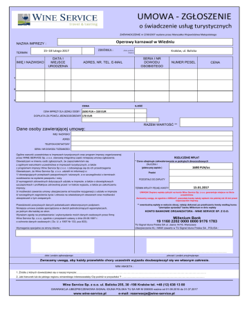 UMOWA - ZGŁOSZENIE o świadczenie usług turystycznych ZAŚWIADCZENIE nr Z/36/2007 wydane przez Marszałka Województwa Małopolskiego Operowy karnawał w Wiedniu NAZWA IMPREZY : TERMIN ZBIÓRKA : 15–18 lutego 2017 IMIĘ I NAZWISKO DATA I MIEJSCE URODZENIA Kraków, ul. Balicka (data, godzina, miejsce) ADRES, NR. TEL. E-MAIL SERIA I NR DOWODU OSOBISTEGO NUMER PESEL CENA 1 2 3 CENA ILOŚĆ CENA IMPREZY DLA JEDNEJ OSOBY 2690 PLN + 550 EUR DOPŁATA ZA POKÓJ JEDNOOSOBOWY 170 EUR RAZEM WARTOŚĆ ** Dane osoby zawierającej umowę: IMIĘ I NAZWISKO ADRES TELEFON KONTAKTOWY SERIA I NR DOWODU TOŻSAMOŚCI Ogólne warunki uczestnictwa w imprezach turystycznych oraz program imprezy organizowanej przez WINE SERVICE Sp. z o.o. stanowią integralną część niniejszej umowy-zgłoszenia. Oświadczam w imieniu osób zgłoszonych, że zapoznałem/am się z ogólnymi warunkami uczestnictwa w imprezach turystycznych, a także z programem imprezy Wine Service Sp z o.o. i zobowiązuję się do ich przestrzegania Oświadczam, że Wine Service Sp. z o.o. udzielił mi informacji o: 1/ obowiązujących przepisach paszportowych i wizowych, a w szczególności o terminach oczekiwania na wydanie paszportu i wizy 2/ wymaganich zdrowotnych dotyczących udziału w imprezie, a także o obowiązkowych szczepionkach i profilaktyce zdrowotnej przed i w trakcie wyjazdu, a także po zakończeniu imprezy. 3/ możliwości zawarcia umowy ubezpieczenia od kosztów rezyganacji z udziału w imprezie 4/ szczególnych zagrożenia życia i zdrowia na odwiedzanych obszarach oraz możliwości ubezpieczeń z tym związanych. ROZLICZENIE WPŁAT * Cena obejmuje zakwaterowanie w pokojach dwuosobowych ZALICZKA I (płatna przy zapisie ) 1690 PLN/os Przelot POZOSTAŁO DO ZAPŁATY TERMIN WPŁATY PEŁNEJ KWOTY 15.01.2017 UWAGA! Dopiero wpłata zaliczki na konto Wine Service Sp. z o.o. gwarantuje miejsce na liście uczestników. Zwracamy uwagę, że zgodnie z OWUwIT, pozostałą kwotę należy wpłacić nie później niż 35 dni przed rozpoczęciem imprezy. Prawdziwość powyższych danych poświadczam własnoręcznym podpisem. Niniejsza umowa została sporządzona w dwóch jednobrzmiących egzemplarzach, po jednym dla każdej ze stron. ** ewentualną wpłatę w walucie obcej, należy dokonać po przeliczeniu kwoty według kursu "pieniądze sprzedaż" banku Millenium w dniu wpłaty KONTO BANKOWE ORGANIZATORA - WINE SERVICE SP. Z O.O. Wyrażam zgodę na przetwarzanie i wykorzystanie moich danych osobowych przez firmę Wine Service Sp. z.o.o, zgodnie z przepisami ustawy z dnia 29.08.1997 r. o ochronie danych osobowych ( Dz. U. z 1997 Nr 133, poz 833). Millenium Bank 19 1160 2202 0000 0000 9176 1783 TU Signal Iduna Polska SA ul. Jasna 14/16, Warszawa Ubezpieczenie KL i NNW zawarto w TU Signal Iduna Polska SA , POLISA : Wymagania specjalne ze strony klienta : ……………………………………………………………… ……………………………….….……....…...…………….…………………… data i podpis zgłaszającego pieczęć i podpis przyjmującego Zwracamy uwagę, aby każdy przewlekle chory uczestnik wyjazdu doubezpieczył się we własnym zakresie. MINI ANKIETA : 1. Źródła z których dowiedziałeś się o naszej imprezie:…………………………………………………………………..…………………………………………………………………… 2. Jaki kierunek lub do jakiego regionu winiarskiego interesowałaby Cię podróż w przyszłości ? ……….…...…………………………………………………………...…………… Wine Service Sp. z o.o. ul. Balicka 255, 30 -198 Kraków tel. +48 (12) 638 13 80 GWARANCJA UBEZPIECZENIOWA SIGNAL IDUNA POLSKA TU SA NR M 206505 ważna od 01.08.2016 do 31.07.2017 www.wine-service.pl e-mail: [email protected]