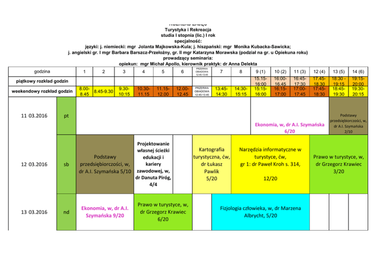 ROZKŁAD ZAJĘĆ Turystyka i Rekreacja studia I stopnia (lic.) I rok specjalność: języki: j. niemiecki: mgr Jolanta Majkowska-Kula; j. hiszpański: mgr Monika Kubacka-Sawicka; j. angielski gr. I mgr Barbara Barszcz-Przełożny, gr. II mgr Katarzyna Morawska (podział na gr. u Opiekuna roku) prowadzący seminaria: opiekun: mgr Michał Apollo, kierownik praktyk: dr Anna Delekta godzina 1 2 3 4 5 6 PRZERWA OBIADOWA 12:45-13:45 7 8 9 (1) 10 (2) 11 (3) 12 (4) 13 (5) 14 (6) 14:3015:15 15.1516:00 15:1516:00 16:0016.45 16:1517:00 16:4517:30 17:0017:45 17.4518.30 17:4518:30 18:30 19:15 18:4519:30 19:1520:00 19:3020:15 piątkowy rozkład godzin weekendowy rozkład godzin 11 03.2016 8.008.45-9.30 8.45 9.3010:15 10.3011.15 11.1512.00 12.0012.45 PRZERWA OBIADOWA 12:45-13:45 13:4514:30 pt Ekonomia, w, dr A.I. Szymańska 6/20 12 03.2016 13 03.2016 sb nd Projektowanie własnej ścieżki Podstawy edukacji i kariery przedsiębiorczości, w, dr A.I. Szymańska 5/10 zawodowej, w, dr Danuta Piróg, 4/4 Ekonomia, w, dr A.I. Szymańska 9/20 Prawo w turystyce, w, dr Grzegorz Krawiec 6/20 Kartografia turystyczna, ćw, dr Łukasz Pawlik 5/20 Narzędzia informatyczne w turystyce, ćw, gr 1: dr Paweł Kroh s. 314, 12/20 Fizjologia człowieka, w, dr Marzena Albrycht, 5/20 Podstawy przedsiębiorczości, w, dr A.I. Szymańska 2/10 Prawo w turystyce, w, dr Grzegorz Krawiec 3/20 1 04.2016 2 04.2016 Geografia turystyczna, w, dr F. Mróz, 4/20 pt sb 3 04.2016 nd 8 04.2016 pt (L) Podstawy rekreacji, w, Socjologiczne podstawy mgr Patrycja Litwicka turystyki, w, dr P. Cuka 11/20 3/10 cz Podstawy rekreacji, w, mgr Patrycja Litwicka 15/20 sb (L) Kartografia turystyczna, cw, dr Łukasz Pawlik 12/20 10 04.2016 nd (L) Narzędzia informatyczne w turystyce, ćw, gr 1: dr Paweł Kroh s. 314, 16/20 22 04.2016 pt (L) 9 04.2016 23 04.2016 sb (L) Geografia turystyczna, ćw, dr F. Mróz, 4/20 Kartografia turystyczna, w, dr Łukasz Pawlik 7/7 Kartografia turystyczna, ćw, dr Łukasz Pawlik 8/20 Podstawy przedsiębiorczości, w, dr A.I. Szymańska 9/10 Ekonomia, w, dr A.I. Szymańska 12/20 Geografia Geografia turystyczna, turystyczna, ćw, w, dr F. Mróz, 7/20 dr F. Mróz, 6/20 Prawo w turystyce, w, dr Grzegorz Krawiec 10/20 15:15-17:30 Język angielski 18:00-20:15 drugi język 15:15-17:30 Język angielski 18:00-20:15 drugi język Ekonomia, cw, dr A.I. Szymańska 4/10 Socjologiczne podstawy turystyki, w, dr P. Cuka 6/10 cz Podstawy przedsiębior czości, w, dr A.I. Szymańska 10/10 15:15-17:30 Język angielski 18:00-20:15 drugi język 15:15-17:30 Język angielski 18:00-20:15 drugi język 24 04.2016 nd (L) 7 05.2016 sb 8 05.2016 nd 20 05.2016 pt (L) 21 05.2016 22 05.2016 sb (L) nd (L) Socjologiczne podstawy turystyki, w, dr P. Cuka 10/10 cz Geografia turystyczna, ćw, dr F. Mróz, 12/20 Geografia turystyczna, ćw, dr F. Mróz, 10/20 Ekonomia, w, dr A.I. Szymańska 16/20 Geografia turystyczna, w, dr F. Mróz, 15/20 12:20-14:40 drugi język Ekonomia, cw, dr A.I. Szymańska 7/10 Prawo w Geografia turystyczna, turystyce, w, dr ćw, dr F. Mróz, 13/20 Grzegorz Narzędzia informatyczne w turystyce, ćw, d gr 1: dr Paweł Kroh s. 314, 12:20-14:40 drugi język 15:00-17:15 Język angielski Geografia turystyczna, w, dr F. Mróz, 9/20 Kartografia turystyczna, cw, dr Łukasz Pawlik 16/20 Prawo w turystyce, w, dr Grzegorz Krawiec 13/20 Prawo w turystyce, w, dr Grzegorz Krawiec 18/20 15:15-17:30 Język angielski 18:00-20:15 drugi język 15:15-17:30 Język angielski 18:00-20:15 drugi język 15:00-17:15 Język angielski Fizjologia człowieka, w, dr Marzena Albrycht, 8/20 20/20 10 06.2016 pt (L) 15:15-17:30 Język angielski 18:00-20:15 drugi język 11 06.2016 sb (L) 12 06.2016 nd (L) 17 06.2016 pt 18 06.2016 sb 19 06.2016 nd 1 07.2016 pt 2 07.2016 sb Geografia Geografia Geografia turystyczna, turystyczna, ćw, turystyczna, ćw, w, dr F. Mróz, 18/20 dr F. Mróz, dr F. Mróz, 15/20 17/20 Fizjologia człowieka, w, dr Marzena Albrycht, 13/20 15:15-17:30 Język angielski 18:00-20:15 drugi język Pierwsza pomoc przedmedyczna, ćw, mgr Paweł Kramarz Podstawy rekreacji, w, mgr Patrycja Litwicka 20/20 Geografia Geografia turystyczna, turystyczna, w, cw, dr F. Mróz,20/20 dr F. Mróz, 20/20 Fizjologia człowieka, w, dr Marzena Albrycht, 16/20 Kartografia turystyczna, cw, dr Łukasz Pawlik 20/20 Fizjologia człowieka, w, dr Marzena Albrycht, 20/20 Fizjologia człowieka, w, dr Marzena Albrycht, ZALICZENIE Ekonomia, w, dr A.I. Szymańska 20/20 Ekonomia, cw, dr A.I. Szymańska 10/10 Pierwsza pomoc przedmedyczna, ćw, mgr Paweł Kramarz 3 07.2016 nd godziny kontaktowe zajęć w grupach W A Ziółkowsk Historia a-Weiss architektury i Kamila, dr sztuki 20 Albrycht Marzena, dr 20 Fizjologia człowieka Ekologia i Okupny ochrona Daniel, dr środowiska Krawiec Prawo w Grzegorz, turystyce dr Szymańs ka Anna Ekonomia Irena, dr 20 K 10 10 20 20 10 1L S P punkty ECTS E/ZO raze m nazwa kursu Elearni ng kod kursu 30 E 5 20 ZO 2 30 ZO 3 20 ZO 2 30 E 5 moodle Ochrona własności intelektualnej 10 10 1 Rachwał Tomasz, dr Podstawy przedsiębiorczo ści 10 10 1 Rettinger Podstawy Renata, dr turystyki Litwicka Podstawy Patrycja, rekreacji mgr Mróz Francisze Historia turystyki k, dr 10 10 20 E 5 20 20 ZO 2 10 10 2 Delekta Anna, dr Socjologiczne Wójtowicz podstawy Mirosław, turystyki dr Kroh Paweł, dr 20 Narzędzia informatyczne w turystyce 20 20 ZO 2 20 ZO 3 Information tools in tourism Mróz Geografia Francisze turystyczna k, dr Przyrodnicze Dolnicki podstawy Piotr, dr turystyki Cuka SpołecznoPeter, dr ekonomiczne hab., prof. podstawy UP turystyki Pawlik Kartografia Łukasz turystyczna Kramarz Paweł 20 20 40 E 5 20 10 30 E 4 10 10 20 E 3 7 20 27 E 4 Pierwsza pomoc przedmedyczna Historia cywilizacji Wilczyński History of Witold civilization Historia gospodarcza 10 10 10 1 10 2 IG (SNJO) Język angielski B2-C2 – 1* 30 30 2 IG (SNJO) Język obcy 2 A1C2 – 1 ** 30 30 2 Kozłowsk a M., dr Apollo M, Obóz turystyki aktywnej*** mgr 2226.06.201 6 40 rodzaj zajęć 3 kurs odbędzie