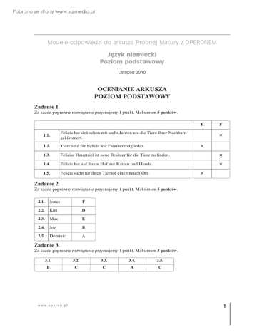 Pobrano ze strony www.sqlmedia.pl Modele odpowiedzi do arkusza Próbnej Matury z OPERONEM J´zyk niemiecki Poziom podstawowy Listopad 2010 OCENIANIE ARKUSZA POZIOM PODSTAWOWY Zadanie 1. Za każde poprawne rozwiązanie przyznajemy 1 punkt. Maksimum 5 punktów. R 1.1. Felicia hat sich schon mit sechs Jahren um die Tiere ihrer Nachbarn gekümmert. 1.2. Tiere sind für Felicia wie Familienmitglieder. 1.3. Felicias Hauptziel ist neue Besitzer für die Tiere zu finden. 1.4. Felicia hat auf ihrem Hof nur Katzen und Hunde. 1.5. Felicia sucht für ihren Tierhof einen neuen Ort. F Zadanie 2. Za każde poprawne rozwiązanie przyznajemy 1 punkt. Maksimum 5 punktów. 2.1. Jonas F 2.2. Kim D 2.3. Max E 2.4. Joy B 2.5. Dominic A Zadanie 3. Za każde poprawne rozwiązanie przyznajemy 1 punkt. Maksimum 5 punktów. 3.1. 3.2. 3.3. 3.4. 3.5. B C C A C w w w. o p e r o n . p l 1 Pobrano ze strony www.sqlmedia.pl Język niemiecki. Poziom podstawowy Próbna Matura z OPERONEM i „Gazetą Wyborczą” Zadanie 4. Za każde poprawne rozwiązanie przyznajemy 1 punkt. Maksimum 6 punktów. 4.1. 4.2. 4.3. 4.4. 4.5. 4.6. D B C C C A Zadanie 5. Za każde poprawne rozwiązanie przyznajemy 1 punkt. Maksimum 7 punktów. 5.1. 5.2. 5.3. 5.4. 5.5. 5.6. 5.7. F C H A D E G Zadanie 6. Za każde poprawne rozwiązanie przyznajemy 1 punkt. Maksimum 7 punktów. R 6.1. E-Bikes sind kleine Autos mit elektrischen Motoren. 6.2. In Deutschland werden immer mehr E-Bikes verkauft. 6.3. Man kann sich die E-Bikes in ganz Deutschland ausleihen. 6.4. In Großstädten sind die E-Bikes am populärsten. 6.5. Die E-Bikes sind besonders bei älteren Menschen und Familien beliebt. 6.6. Mit E-Bikes kann man im Gebirge leichter fahren. 6.7. Junge Menschen finden das Design von E-Bikes schrecklich. F Zadanie 7. Krótka forma użytkowa. Maksimum 5 punktów. Sprawdza egzaminator zgodnie z kryteriami podanymi w aneksie do Informatora o egzaminie maturalnym od 2008 roku. Język niemiecki (www.cke.edu.pl). Zadanie 8. Dłuższa forma użytkowa. Maksimum 10 punktów. Sprawdza egzaminator zgodnie z kryteriami podanymi w aneksie do Informatora o egzaminie maturalnym od 2008 roku. Język niemiecki (www.cke.edu.pl). w w w. o p e r o n . p l 2