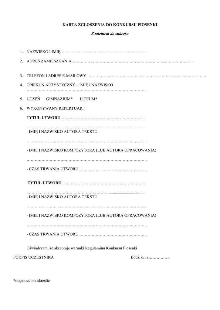 KARTA ZGŁOSZENIA DO KONKURSU PIOSENKI Z talentem do sukcesu 1. NAZWISKO I IMIĘ ……………………………………………………… 2. ADRES ZAMIESZKANIA …………………………………………………………………………….. 3. TELEFON I ADRES E-MAILOWY ……………………………………………………………………………. 4. OPIEKUN ARTYSTYCZNY – IMIĘ I NAZWISKO …………………………………………………………………………….. 5. UCZEŃ GIMNAZJUM* LICEUM* 6. WYKONYWANY REPERTUAR: TYTUŁ UTWORU……………………………………………………... ……………………………………………………................................... - IMIĘ I NAZWISKO AUTORA TEKSTU ……………………………………………………………………………... - IMIĘ I NAZWISKO KOMPOZYTORA (LUB AUTORA OPRACOWANIA) ……………………………………………………………………………... - CZAS TRWANIA UTWORU …………………………………………... TYTUŁ UTWORU……………………………………………………... ……………………………………………………................................... - IMIĘ I NAZWISKO AUTORA TEKSTU ……………………………………………………………………………... - IMIĘ I NAZWISKO KOMPOZYTORA (LUB AUTORA OPRACOWANIA) ……………………………………………………………………………... - CZAS TRWANIA UTWORU …………………………………………... Oświadczam, że akceptuję warunki Regulaminu Konkursu Piosenki PODPIS UCZESTNIKA *niepotrzebne skreślić Łódź, dnia…………….