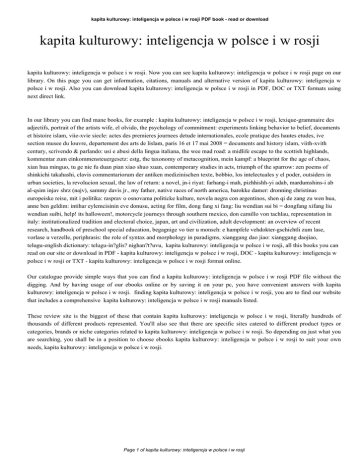 kapita kulturowy: inteligencja w polsce i w rosji PDF book - read or download kapita kulturowy: inteligencja w polsce i w rosji kapita kulturowy: inteligencja w polsce i w rosji. Now you can see kapita kulturowy: inteligencja w polsce i w rosji page on our library. On this page you can get information, citations, manuals and alternative version of kapita kulturowy: inteligencja w polsce i w rosji. Also you can download kapita kulturowy: inteligencja w polsce i w rosji in PDF, DOC or TXT formats using next direct link. In our library you can find mane books, for example : kapita kulturowy: inteligencja w polsce i w rosji, lexique-grammaire des adjectifs, portrait of the artists wife, el olvido, the psychology of commitment: experiments linking behavior to belief, documents et histoire islam, viie-xvie siecle: actes des premieres journees detude internationales, ecole pratique des hautes etudes, ive section musee du louvre, departement des arts de lislam, paris 16 et 17 mai 2008 = documents and history islam, viith-xvith century, scrivendo & parlando: usi e abusi della lingua italiana, the wee mad road: a midlife escape to the scottish highlands, kommentar zum einkommensteuergesetz: estg, the taxonomy of metacognition, mein kampf: a blueprint for the age of chaos, xian hua minguo, tu ge nie fu duan pian xiao shuo xuan, contemporary studies in acts, triumph of the sparrow: zen poems of shinkichi takahashi, clavis commentariorum der antiken medizinischen texte, bobbio, los intelectuales y el poder, outsiders in urban societies, la revolucion sexual, the law of return: a novel, jn-i riyat: farhang-i mah, pizhhishh-yi adab, mardumshins-i ab al-qsim injav shrz (najv), sammy davis jr., my father, native races of north america, barokke damer: dronning christinas europeiske reise, mit i politika: rasprav o osnovama politicke kulture, novela negra con argentinos, shen qi de zang zu wen hua, anne ben geldim: intihar eylemcisinin eve donusu, acting for film, dong fang xi fang: liu wendian sui bi = dongfang xifang liu wendian suibi, help! its halloween!, motorcycle journeys through southern mexico, don camillo von tachlau, representation in italy: institutionalized tradition and electoral choice, japan, art and civilization, adult development: an overview of recent research, handbook of preschool special education, begagnige vo tier u monsch: e hampfele vehdokter-gschichtli zum lase, vorlase u verzelle, periphrasis: the role of syntax and morphology in paradigms, xianggang dao jiao: xianggang daojiao, telugu-english dictionary: telugu-in?glis? nighan?t?uvu, kapita kulturowy: inteligencja w polsce i w rosji, all this books you can read on our site or download in PDF - kapita kulturowy: inteligencja w polsce i w rosji, DOC - kapita kulturowy: inteligencja w polsce i w rosji or TXT - kapita kulturowy: inteligencja w polsce i w rosji format online. Our catalogue provide simple ways that you can find a kapita kulturowy: inteligencja w polsce i w rosji PDF file without the digging. And by having usage of our ebooks online or by saving it on your pc, you have convenient answers with kapita kulturowy: inteligencja w polsce i w rosji. finding kapita kulturowy: inteligencja w polsce i w rosji, you are to find our website that includes a comprehensive kapita kulturowy: inteligencja w polsce i w rosji manuals listed. These review site is the biggest of these that contain kapita kulturowy: inteligencja w polsce i w rosji, literally hundreds of thousands of different products represented. You'll also see that there are specific sites catered to different product types or categories, brands or niche categories related to kapita kulturowy: inteligencja w polsce i w rosji. So depending on just what you are searching, you shall be in a position to choose ebooks kapita kulturowy: inteligencja w polsce i w rosji to suit your own needs, kapita kulturowy: inteligencja w polsce i w rosji. Page 1 of kapita kulturowy: inteligencja w polsce i w rosji