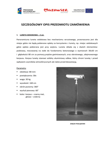 SZCZEGÓŁOWY OPIS PRZEDMIOTU ZAMÓWIENIA 1. LUNETA WIDOKOWA – 2 szt. Panoramiczna luneta widokowa bez mechanizmu wrzutowego, przeznaczona jest dla miejsc gdzie nie będą pobierane opłaty za korzystanie z lunety, np. miejsc widokowych gdzie opłata pobierana jest przy wejściu. Luneta składa się z dwóch elementów: podstawy, mocowanej na stałe do fundamentu betonowego o wymiarach 30x30 cm i głębokości 80 cm za pomocą prętów gwintowanych, oraz obrotowego, zdejmowanego korpusu. Korpus lunety stanowi solidny aluminiowy odlew, który chroni lunetę i przed wpływem czynników atmosferycznych ale także przed dewastacją. Parametry obiektyw: 80 mm powiększenia: 30x waga: 30 kg wysokość: 160 cm obrót poziomy: 360° wychył pionowy: 60° kolor: korpus – czarny mat, głowa – srebrna ZDIĘCIE POGLĄDOWE 2. TABLICA INFORMACYJNA – 1 szt. Duża tablica informacyjna o powierzchni wys. 110x130 cm szer. Można na niej umieszczać ogłoszenia, mapy, czy inne informacje, np. rozkłady jazdy. Tablica wykonana jest z blachy stalowej ocynkowanej i zawieszona pomiędzy dwoma słupami z rur stalowych, wykończonych żeliwnymi odlewami. Dodatkowo wyposażona jest w dodatkową poprzeczkę, zawieszoną przy samej ziemi, dzięki czemu może ona być umieszczona w jednym ciągu z ogrodzeniem. Tablica zamocowana jest do fundamentu betonowego o wymiarach 30x30 cm i głębokości 70 cm poprzez zabetonowanie nóg tablicy w fundamencie. ZDIĘCIE POGLĄDOWE 3. TABLICA INFORMACYJNA – 3 szt. Duża tablica informacyjna o powierzchni wys. 110x130 cm szer. Można na niej umieszczać ogłoszenia, mapy, czy inne informacje, np. rozkłady jazdy. Tablica wykonana jest z blachy stalowej ocynkowanej i zawieszona pomiędzy dwoma słupami z rur stalowych, wykończonych żeliwnymi odlewami. Tablica zamocowana jest do fundamentu betonowego o wymiarach 30x30 cm i głębokości 70 cm poprzez zabetonowanie nóg tablicy w fundamencie. ZDIĘCIE POGLĄDOWE 4. ZADASZENIE STOŁU I ŁAW – 2 szt. Nad stołem okrągłym z ławami należy ustawić zadaszenie konstrukcji stalowej malowanej proszkowo na kolor czarny, pokrycie gont bitumiczny w kolorystyce do ustalenia na płycie OSB zamocowanej do konstrukcji zadaszenia. Zadaszenie osadzone w stopie fundamentowej betonowej o wymiarach 100x100 cm i wysokości 80 cm. Krawędzie okapu obrobione blachą stalową powlekaną. Spód płyty OSB zabezpieczona lakierobejcą. Wysokość okapu od podłoża min. 210 cm, szerokość 400 cm, spadek 20%. ZDIĘCIE POGLĄDOWE 5. STÓŁ OKRĄGŁY Z ŁAWAMI – 2 komplety Stół wykonany ze stali malowanej proszkowo w kolorze czarnym(nogi i krawędzie mebli), blat stołu i siedziska ław wykonane z listew drewna liściastego grubości 32 mm, powierzchnia gładka pomalowana lakierobejcą zabezpieczającą. W celu zamocowania zestawu do podłoża należy wykonać fundamenty betonowe o wymiarach 30x50 cm i głębokości 80 cm po dwa na każdą ławę i cztery do mocowania stołu. ZDIĘCIE POGLĄDOWE 6. STOJAKI NA ROWERY – 8 szt. Stojak rowerowy w kształcie odwróconej litery U, pozwalające na przypięcie roweru kilkoma sposobami. Styl stojaka retro, wyróżnia się słupkiem z pięknie rzeźbionym wykończeniem. Stojak wykonany został ze stali czarnej, malowany na kolor palety czarny. Stojak zamocowany jest do fundamentów betonowych o wymiarach 30x30 cm i głębokości 80 cm umieszczonego pod każdą z nóg zakotwionych w fundamencie. Wymiary: wysokość od powierzchni ziemi – 100 cm wysokość z odcinkiem kotwiącym – 140 cm długość – 111 cm kolorystyka - czarny mat ZDIĘCIE POGLĄDOWE 7. KOSZ NA ŚMIECI – 4 szt. Kosz metalowy o poj. 50L z elementem osłony prze deszczem (pokrywa) na słupku pojedynczym. Zamykany na zamek zatrzaskowy. Kolor czarny, słupek kosza osadzony w fundamencie o wymiarach 30x30 cm i głębokości 70 cm umieszczonego pod słupkiem stalowym. ZDIĘCIA POGLĄDOWE