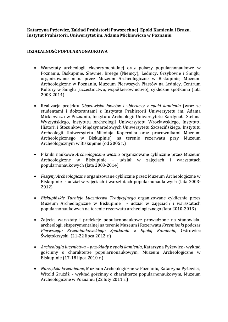 Katarzyna Pyżewicz, Zakład Prahistorii Powszechnej Epoki Kamienia i Brązu, Instytut Prahistorii, Uniwersytet im. Adama Mickiewicza w Poznaniu DZIAŁALNOŚĆ POPULARNONAUKOWA Warsztaty archeologii eksperymentalnej oraz pokazy popularnonaukowe w Poznaniu, Biskupinie, Sławnie, Breege (Niemcy), Lednicy, Grzybowie i Śmiglu, organizowane m.in. przez Muzeum Archeologiczne w Biskupinie, Muzeum Archeologiczne w Poznaniu, Muzeum Pierwszych Piastów na Lednicy, Centrum Kultury w Śmiglu (uczestnictwo, współkierownictwo), cykliczne spotkania (lata 2003-2014) Realizacja projektu Obozowisko łowców i zbieraczy z epoki kamienia (wraz ze studentami i doktorantami z Instytutu Prahistorii Uniwersytetu im. Adama Mickiewicza w Poznaniu, Instytutu Archeologii Uniwersytetu Kardynała Stefana Wyszyńskiego, Instytutu Archeologii Uniwersytetu Wrocławskiego, Instytutu Historii i Stosunków Międzynarodowych Uniwersytetu Szczecińskiego, Instytutu Archeologii Uniwersytetu Mikołaja Kopernika oraz pracownikami Muzeum Archeologicznego w Biskupinie) na terenie rezerwatu przy Muzeum Archeologicznym w Biskupinie (od 2005 r.) Pikniki naukowe Archeologiczna wiosna organizowane cyklicznie przez Muzeum Archeologiczne w Biskupinie - udział w zajęciach i warsztatach popularnonaukowych (lata 2003-2014) Festyny Archeologiczne organizowane cyklicznie przez Muzeum Archeologiczne w Biskupinie - udział w zajęciach i warsztatach popularnonaukowych (lata 20032012) Biskupińskie Turnieje Łucznictwa Tradycyjnego organizowane cyklicznie przez Muzeum Archeologiczne w Biskupinie - udział w zajęciach i warsztatach popularnonaukowych na terenie rezerwatu archeologicznego (lata 2010-2013) Zajęcia, warsztaty i prelekcje popularnonaukowe prowadzone na stanowisku archeologii eksperymentalnej na terenie Muzeum i Rezerwatu Krzemionki podczas Pierwszego Krzemionkowskiego Spotkania z Epoką Kamienia, Ostrowiec Świętokrzyski (21-22 lipca 2012 r.) Archeologia łucznictwa – przykłady z epoki kamienia, Katarzyna Pyżewicz - wykład gościnny o charakterze popularnonaukowym, Muzeum Archeologiczne w Biskupinie (17-18 lipca 2010 r.) Narzędzia krzemienne, Muzeum Archeologiczne w Poznaniu, Katarzyna Pyżewicz, Witold Grużdź, - wykład gościnny o charakterze popularnonaukowym, Muzeum Archeologiczne w Poznaniu (22 luty 2011 r.) Łucznictwo eksperymentalne, Katarzyna Pyżewicz - wykład gościnny o charakterze popularnonaukowym, Muzeum Archeologiczne w Biskupinie (16-17 lipca 2011 r.) O strzałkach krzemiennych – o funkcji, zróżnicowaniu i wykonywaniu grocików krzemiennych, Katarzyna Pyżewicz - wykład gościnny o charakterze popularnonaukowym, Muzeum Archeologiczne w Biskupinie (14 lipca 2012 r.) Drapacze, ciosaki i inne, czyli narzędzia krzemienne - pokaz realizowany podczas Weekendu z archeologią w Muzeum Archeologiczne w Poznaniu (29 września 2012 r.) O funkcji, zróżnicowaniu i wykonywaniu grocików krzemiennych, Katarzyna Pyżewicz, Witold Grużdź - wykład gościnny o charakterze popularnonaukowym, Muzeum Archeologiczne w Biskupinie (13 lipca 2013 r.) Zajęcia, warsztaty i prelekcje popularnonaukowe prowadzone na stanowisku archeologii eksperymentalnej na terenie Muzeum i Rezerwatu Krzemionki podczas II Krzemionkowskiego Spotkania z Epoką Kamienia (20-21 lipca 2013 r.) O traseologii słów kilka - poprowadzenie warsztatów z analiz mikroskopowych zabytków krzemiennych w ramach spotkań Koła Naukowego Studentów Archeologii UAM (7 kwietnia 2014 r.) Człowiek w epoce lodowcowej, Katarzyna Pyżewicz - wykład o charakterze popularnonaukowym wygłoszony w ramach XVII Festiwalu Nauki i Sztuki na Wydziale Historycznym UAM (9 kwietnia 2014 r.) Współorganizacja na Wydziale Historycznym UAM Nocy Naukowców i Poznańskiego Festiwalu Nauki i Sztuki (lata 2014-2015)