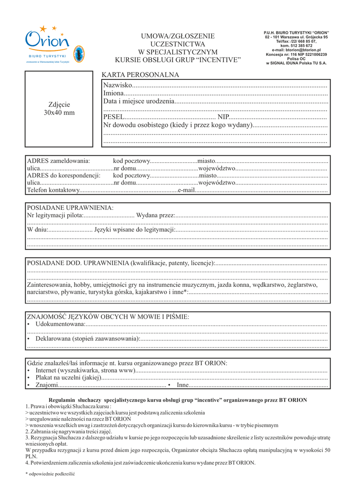 IZBA ST RY TU YKI WAR SZA W S KA C HA Zdjęcie 30x40 mm O F TO U W SA RISM W AR zrzeszone w Warszawskiej Izbie Turystyki M BE R UMOWA/ZGŁOSZENIE UCZESTNICTWA W SPECJALISTYCZNYM KURSIE OBSŁUGI GRUP “INCENTIVE” P.U.H. BIURO TURYSTYKI “ORION” 02 - 101 Warszawa ul. Grójecka 95 Tel/fax: /22/ 668 85 07, kom. 512 385 672 e-mail: [email protected] Koncesja nr: 116 NIP 5221006239 Polisa OC w SIGNAL IDUNA Polska TU S.A. KARTA PEROSONALNA Nazwisko............................................................................................................. Imiona.................................................................................................................. Data i miejsce urodzenia...................................................................................... ............................................................................................................................. PESEL................................................... NIP....................................................... Nr dowodu osobistego (kiedy i przez kogo wydany).......................................... ............................................................................................................................. ............................................................................................................................. ADRES zameldowania: kod pocztowy.............................miasto..................................................................... ulica.............................................nr domu......................................województwo........................................................ ADRES do korespondencji: kod pocztowy..............................miasto.................................................................... ulica.............................................nr domu......................................województwo........................................................ Telefon kontaktowy............................................................e-mail................................................................................. POSIADANE UPRAWNIENIA: Nr legitymacji pilota:............................... Wydana przez:............................................................................................. ....................................................................................................................................................................................... W dniu:........................... Języki wpisane do legitymacji:............................................................................................. ....................................................................................................................................................................................... ....................................................................................................................................................................................... POSIADANE DOD. UPRAWNIENIA (kwalifikacje, patenty, licencje):.................................................................... ....................................................................................................................................................................................... ....................................................................................................................................................................................... Zainteresowania, hobby, umiejętności gry na instrumencie muzycznym, jazda konna, wędkarstwo, żeglarstwo, narciarstwo, pływanie, turystyka górska, kajakarstwo i inne*:..................................................................................... ....................................................................................................................................................................................... ZNAJOMOŚĆ JĘZYKÓW OBCYCH W MOWIE I PIŚMIE: Udokumentowana:................................................................................................................................................... ....................................................................................................................................................................................... Deklarowana (stopień zaawansowania):.................................................................................................................. ....................................................................................................................................................................................... Gdzie znalazłeś/łaś informacje nt. kursu organizowanego przez BT ORION: Internet (wyszukiwarka, strona www)..................................................................................................................... Plakat na uczelni (jakiej).......................................................................................................................................... Znajomi.................................................................. • Inne..................................................................................... Regulamin słuchaczy specjalistycznego kursu obsługi grup “incentive” organizowanego przez BT ORION 1. Prawa i obowiązki Słuchacza kursu : > uczestnictwo we wszystkich zajęciach kursu jest podstawą zaliczenia szkolenia > uregulowanie należności na rzecz BT ORION > wnoszenia wszelkich uwag i zastrzeżeń dotyczących organizacji kursu do kierownika kursu - w trybie pisemnym 2. Zabrania się nagrywania treści zajęć. 3. Rezygnacja Słuchacza z dalszego udziału w kursie po jego rozpoczęciu lub uzasadnione skreślenie z listy uczestników powoduje utratę wniesionych opłat. W przypadku rezygnacji z kursu przed dniem jego rozpoczęcia, Organizator obciąża Słuchacza opłatą manipulacyjną w wysoko
