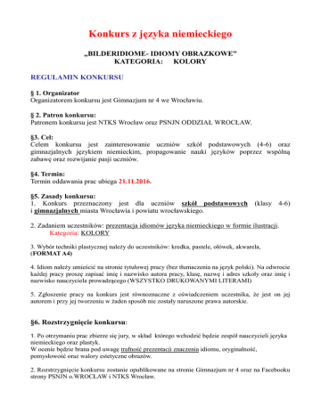 Konkurs z języka niemieckiego „BILDERIDIOME- IDIOMY OBRAZKOWE” KATEGORIA: KOLORY REGULAMIN KONKURSU § 1. Organizator Organizatorem konkursu jest Gimnazjum nr 4 we Wrocławiu. § 2. Patron konkursu: Patronem konkursu jest NTKS Wrocław oraz PSNJN ODDZIAŁ WROCŁAW. §3. Cel: Celem konkursu jest zainteresowanie uczniów szkół podstawowych (4-6) oraz gimnazjalnych językiem niemieckim, propagowanie nauki języków poprzez wspólną zabawę oraz rozwijanie pasji uczniów. §4. Termin: Termin oddawania prac ubiega 21.11.2016. §5. Zasady konkursu: 1. Konkurs przeznaczony jest dla uczniów szkół podstawowych (klasy 4-6) i gimnazjalnych miasta Wrocławia i powiatu wrocławskiego. 2. Zadaniem uczestników: prezentacja idiomów języka niemieckiego w formie ilustracji. Kategoria: KOLORY 3. Wybór techniki plastycznej należy do uczestników: kredka, pastele, ołówek, akwarela, (FORMAT A4) 4. Idiom należy umieścić na stronie tytułowej pracy (bez tłumaczenia na język polski). Na odwrocie każdej pracy proszę zapisać imię i nazwisko autora pracy, klasę, nazwę i adres szkoły oraz imię i nazwisko nauczyciela prowadzącego (WSZYSTKO DRUKOWANYMI LITERAMI) 5. Zgłoszenie pracy na konkurs jest równoznaczne z oświadczeniem uczestnika, że jest on jej autorem i przy jej tworzeniu w żaden sposób nie zostały naruszone prawa autorskie. §6. Rozstrzygnięcie konkursu: 1. Po otrzymaniu prac zbierze się jury, w skład którego wchodzić będzie zespół nauczycieli języka niemieckiego oraz plastyk. W ocenie będzie brana pod uwagę trafność prezentacji znaczenia idiomu, oryginalność, pomysłowość oraz walory estetyczne obrazów. 2. Rozstrzygnięcie konkursu zostanie opublikowane na stronie Gimnazjum nr 4 oraz na Facebooku strony PSNJN o.WROCŁAW i NTKS Wrocław. 5. Na zwycięzców czekają nagrody rzeczowe wraz z dyplomami dla laureatów. 6. Uczestnicy konkursu wyrażają zgodę na publikację imienia i nazwiska oraz nazwy szkoły na Facebooku PSNJN o. Wrocław, NTKS Wrocław oraz na stronie organizatora. Koordynator Marta Obuszko