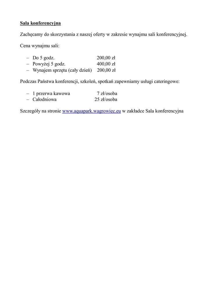 Sala konferencyjna Zachęcamy do skorzystania z naszej oferty w zakresie wynajmu sali konferencyjnej. Cena wynajmu sali: – Do 5 godz. – Powyżej 5 godz. – Wynajem sprzętu (cały dzień) 200,00 zł 400,00 zł 200,00 zł Podczas Państwa konferencji, szkoleń, spotkań zapewniamy usługi cateringowe: – 1 przerwa kawowa – Całodniowa 7 zł/osoba 25 zł/osoba Szczegóły na stronie www.aquapark.wagrowiec.eu w zakładce Sala konferencyjna