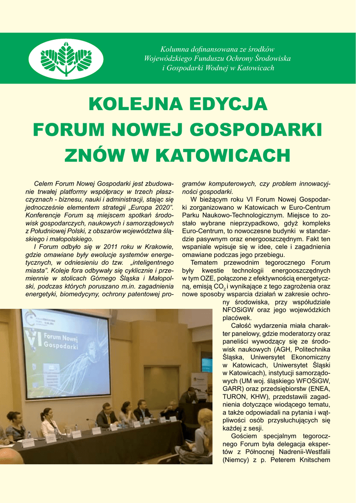 Kolumna dofinansowana ze środków Wojewódzkiego Funduszu Ochrony Środowiska i Gospodarki Wodnej w Katowicach Kolejna edycja Forum Nowej Gospodarki znów w Katowicach Celem Forum Nowej Gospodarki jest zbudowanie trwałej platformy współpracy w trzech płaszczyznach - biznesu, nauki i administracji, stając się jednocześnie elementem strategii „Europa 2020”. Konferencje Forum są miejscem spotkań środowisk gospodarczych, naukowych i samorządowych z Południowej Polski, z obszarów województwa śląskiego i małopolskiego. I Forum odbyło się w 2011 roku w Krakowie, gdzie omawiane były ewolucje systemów energetycznych, w odniesieniu do tzw. „inteligentnego miasta”. Koleje fora odbywały się cyklicznie i przemiennie w stolicach Górnego Śląska i Małopolski, podczas których poruszano m.in. zagadnienia energetyki, biomedycyny, ochrony patentowej pro- gramów komputerowych, czy problem innowacyjności gospodarki. W bieżącym roku VI Forum Nowej Gospodarki zorganizowano w Katowicach w Euro-Centrum Parku Naukowo-Technologicznym. Miejsce to zostało wybrane nieprzypadkowo, gdyż kompleks Euro-Centrum, to nowoczesne budynki w standardzie pasywnym oraz energooszczędnym. Fakt ten wspaniale wpisuje się w idee, cele i zagadnienia omawiane podczas jego przebiegu. Tematem przewodnim tegorocznego Forum były kwestie technologii energooszczędnych w tym OZE, połączone z efektywnością energetyczną, emisją CO2 i wynikające z tego zagrożenia oraz nowe sposoby wsparcia działań w zakresie ochrony środowiska, przy współudziale NFOSiGW oraz jego wojewódzkich placówek. Całość wydarzenia miała charakter panelowy, gdzie moderatorzy oraz paneliści wywodzący się ze środowisk naukowych (AGH, Politechnika Śląska, Uniwersytet Ekonomiczny w Katowicach, Uniwersytet Śląski w Katowicach), instytucji samorządowych (UM woj. śląskiego WFOŚiGW, GARR) oraz przedsiębiorstw (ENEA, TURON, KHW), przedstawili zagadnienia dotyczące wiodącego tematu, a także odpowiadali na pytania i wątpliwości osób przysłuchujących się każdej z sesji. Gościem specjalnym tegorocznego Forum była delegacja ekspertów z Północnej Nadrenii-Westfalii (Niemcy) z p. Peterem Knitschem - Sekretarzem Stanu ds. Ochrony Klimatu, Środowiska i Spraw Konsumenckich na czele. Zaproszenie niemieckiej delegacji nie było przypadkowe, gdyż właśnie ten region naszych zachodnich sąsiadów jest zbliżony pod względem problemów środowiskowych, rozwoju przemysłu i infrastruktury z Górnym Śląskiem. W swoim wystąpieniu inauguracyjnym, po części oficjalnej otwarcia, której dokonał marszałek woj. śląskiego - Mirosław Sekuła, p. Knitsch przedstawił, z racji swojej funkcji, swój punkt widzenia dotyczący emisji CO2 i przebieg prac jakie są obecnie prowadzone w celu jej redukcji. Wg prelegenta, całość zagadnienia sprowadza się do bardziej efektywnego i skuteczniejszego spalania produktów węglopochodnych i innych, ograniczając tym samym ich wprowadzanie do atmosfery. Plan badawczy zakłada redukcję stężenia dwutlenku węgla w niedalekiej przyszłości o ⅓ w stosunku do obecnej sytuacji. Kolejne wystąpienia związane były z efektywnością wykorzystania energetycznego surowców niskoemisyjnych w relacji kosztów jej wytwarzania, w stosunku do ceny końcowej za energię elektryczną, którą trzeba będzie zapłacić. W obecnym kształcie realiów stwierdzono, niestety, że koszt wytwarzania energii przy użyciu niekonwencjonalnych surowców jest wysoki i bez wsparcia polityki energetycznej rządu, skutkować będzie wzrostem cen dla odbiorcy zarówno masowego jak i indywidualnego. W nawiązaniu do kolejnego tematu panelowego, jakim była gospodarka niskoemisyjna na poziomie gmin, wiele uwagi poświęcono kwestii rozwoju świadomości jej mieszkańców, poprzez odpowiednie zajęcia edukacyjne, których forma, treść oraz siła przekazu uzależniona jest od forum słuchaczy (dzieci, młodzież dorośli, mieszkańcy miast czy wsi). Tylko wzrost wiedzy spowoduje zmianę powszechnie panującego podejścia do prezentowanej kwestii, inicjując tym samym zmianę działań w zakresie ogrzewania mieszkań, segregacji odpadów itp. na bardziej nowoczesne i mniej inwazyjne dla środowiska. Wprowadzanie jakichkolwiek zmian w zakresie nowoczesności energetycznej i redukcji emisji szkodliwych substancji do otoczenia, wymaga wielu nakładów inwestycyjnych, a przede wszystkim finansowych. Jak pozyskać potrzebne środki, komu się one należą i na jaki cel mogą być wykorzystane - temu służyła kolejna sesja panelowa na tegorocznym Forum. Ekspert NFOŚiGW, przedstawił uczestnikom ofertę działań Funduszu w zakresie problemów szerszej popularyzacji nowoczesności energetycznej dla podmiotów gospodarczych, instytucji publicznych, a także indywidualnego „Kowalskiego”. Dla idei rozwijania innowacyjnych technologii, promowania zachowań proekologicznych oraz edukacji mieszkańców, zorganizowano, również na terenie Euro-Centrum - Piknik Rodzinny, łącząc tradycję śląską śpiewu i tańca z pokazami nowoczesnych urządzeń i dokonań naukowych. Kulminacyjnym punktem VI Forum był występ znanego Zespołu Pieśni i Tańca „Śląsk”. Treści zawarte w publikacji nie stanowią oficjalnego stanowiska organów Wojewódzkiego Funduszu Ochrony Środowiska i Gospodarki Wodnej w Katowicach