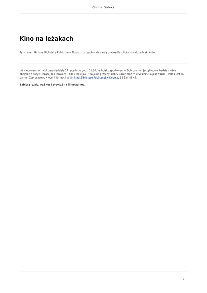 Gmina Dobrcz Kino na leżakach Tym razem Gminna Biblioteka Publiczna w Dobrczu przygotowała niezłą gratkę dla miłośników dużych ekranów. Już niebawem, w najbliższą niedzielę 17 lipca br. o godz. 21:30, na boisku sportowym w Dobrczu - ul. Jarzębinowa, będzie można obejrzeć z pozycji leżącej (na leżakach), filmy takie jak - "Za jakie grzechy, dobry Boże" oraz "Nietykalni". Co jest ważne - wstęp jest za darmo. Zapraszamy, więcej informacji W Gminnej Bibliotece Publicznej w Dobrczu 52 324 41 42. Zabierz leżak, weź koc i przyjdź na filmową noc. 1