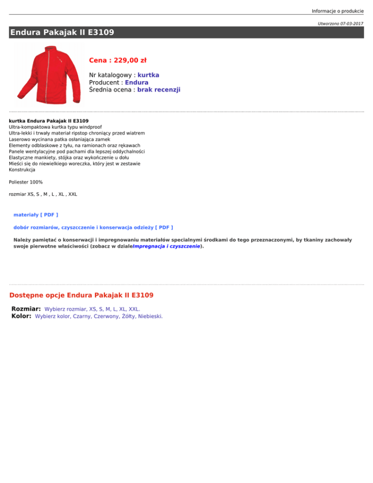 Informacje o produkcie Utworzono 07-03-2017 Endura Pakajak II E3109 Cena : 229,00 zł Nr katalogowy : kurtka Producent : Endura Średnia ocena : brak recenzji kurtka Endura Pakajak II E3109 Ultra-kompaktowa kurtka typu windproof Ultra-lekki i trwały materiał ripstop chroniący przed wiatrem Laserowo wycinana patka osłaniająca zamek Elementy odblaskowe z tyłu, na ramionach oraz rękawach Panele wentylacyjne pod pachami dla lepszej oddychalności Elastyczne mankiety, stójka oraz wykończenie u dołu Mieści się do niewielkiego woreczka, który jest w zestawie Konstrukcja Poliester 100% rozmiar XS, S , M , L , XL , XXL materiały [ PDF ] dobór rozmiarów, czyszcczenie i konserwacja odzieży [ PDF ] Należy pamiętać o konserwacji i impregnowaniu materiałów specialnymi środkami do tego przeznaczonymi, by tkaniny zachowały swoje pierwotne właściwości (zobacz w dzialeImpregnacja i czyszczenie). Dostępne opcje Endura Pakajak II E3109 Rozmiar: Wybierz rozmiar, XS, S, M, L, XL, XXL. Kolor: Wybierz kolor, Czarny, Czerwony, Żółty, Niebieski.