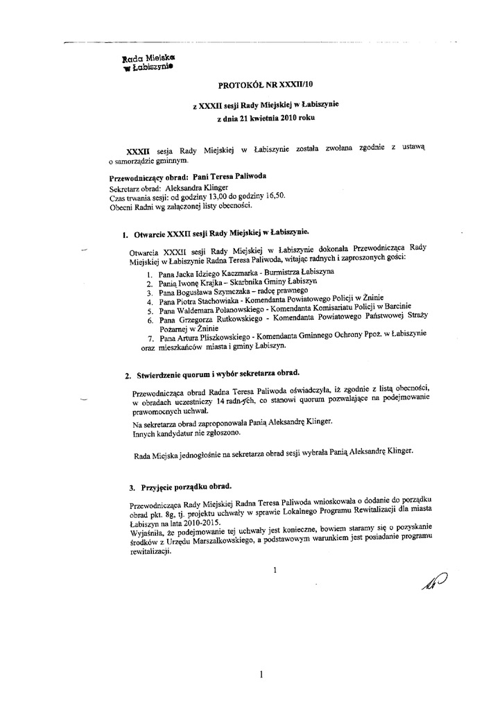 1 Przewodnicząca obrad poddała pod głosowanie zgłoszony wniosek w sprawie włączenia projektu uchwały do porządku obrad sesji. Rada Miejska jednogłośnie przyjęła wniosek. Nie wniesiono innych uwag do porządku obrad. Rada Miejska jednogłośnie przyjęła przedstawiony porządek obrad XXXII sesji Rady Miejskiej w Łabiszynie. 3. Przyjęcie protokółu z obrad XXXI sesji Rady Miejskiej w Łabiszynie. Radni nie wnieśli uwag do protokółu Nr XXXI/10 sesji Rady Miejskiej z dnia 24 lutego 2010 r., przyjmując go jednogłośnie. 4. Informacja o stanie bezpieczeństwa i porządku publicznego w Gminie Łabiszyn: - sprawozdanie Komendanta Powiatowego Policji w Żninie Pan Piotr Stachowiak - Komendant Powiatowy Policji w Żninie poinformował, że w Posterunku Policji w Łabiszynie nie ma wakatów. Jednocześnie podkreślił, że łabiszyńscy policjanci, mając duże doświadczenie, pracują w Komisariacie Policji w Barcinie w wydziale kryminalno - dochodzeniowym. Stwierdził, że spadła przestępczość, głównie rozboje i kradzieże. Równocześnie wzrosła wykrywalność, która wynosi 4 na 5 zdarzeń, a znaczący wpływ ma stosowanie nowoczesnych urządzeń, co również umożliwiło wykrycie sprawcy napadu na jubilera w Łabiszynie. Oznajmił, że w 2009 r. miało miejsce ponad 500 zatrzymań i wydano 12 tys. mandatów, główną przyczyną był nieprawidłowy ruch drogowy, w tym po spożyciu alkoholu. Podziękował za dotychczasową pomoc łabiszyńskiego samorządu. Podkreślił pomoc w postaci sfinansowania kosztów dla funkcjonariuszy prewencji z Bydgoszczy, którzy latem wspierają Gminę Łabiszyn. Wyjaśnił, że Komendant Wojewódzki Policji, bardzo pozytywnie widzi współpracę z Łabiszynem. Ogólnie wyniki w Łabiszynie znacznie poprawiły się, szczególnie w zakresie kradzieży samochodów i włamań. Natomiast na drogi kierowane są fotoradary i wideoradary. Radna Izabela Borzych stwierdziła, ze przeanalizowała otrzymane wcześniej sprawozdanie policji za 2009 r. i niepokoi ją przestępczość wśród małoletnich, w tym 13latków. Ponadto zauważyła ile złego i przemocy jest w rodzinach, w których założono tzw. Niebieskie Karty. Jednocześnie wskazała, że widoczne są pozytywne efekty działalności policji. Podziękowała za patrole w Lubostroniu, przede wszystkim pod kątem przestrzegania szybkości jazdy przez kierowców oraz posiadania przez przedsiębiorców aktualnych decyzji na sprzedaż alkoholu w sklepach i lokalach. Radna Aleksandra Zielińska przypomniała, że gmina Łabiszyn od wielu lat wnioskuje o zainstalowanie oświetlenia przy przejściu dla pieszych na ul. Barcińskiej lecz podobno jest to bardzo kosztowne. Równocześnie pytała jak zachować bezpieczeństwo, chyba jeżdżąc rowerem po chodniku. Zakupienie radaru nie zapewnia całkowitego bezpieczeństwa dla pieszych. Wnioskowała o pomoc policji w zlikwidowaniu dzikich wysypisk w lasach lub pomoc w zmobilizowaniu służby leśnej. 2 Radny Zenon Mikuła stwierdził, ze statystycznie wyniki policji za 2009 r. są dobre. Jednakże zbliża się lato i ponownie wróci problem z grzybiarzami, którzy pozostawiają w lasach ogromny brud, a także parkują tam samochody. Policja powinna konsekwentnie egzekwować zakaz parkowania samochodów w lasach. Komendant Powiatowy Policji w Żninie Pan Piotr Stachowiak stwierdził, że policja również jest zaniepokojona przestępczością wśród nieletnich. Poinformował, że w tym celu powołano specjalna grupę operacyjną zajmującą się, m.in. chuligaństwem, włamaniami, bójkami i rozbojami. Wyjaśnił, że jest wrogiem spożywania alkoholu pod sklepami, bowiem występują prawne uwarunkowania dotyczące kulturalnego picia alkoholu. Przyznał, że przemoc w rodzinach wzrasta, a zwłaszcza w środowiskach patologicznych, zagrożonych alkoholizmem oraz nieporadnych życiowo. Sytuacja taka wpływa na systematyczne rozwijanie działalności „Niebieskiej Karty”. Odnośnie ustawienia świateł na przejściu dla pieszych na ul. Barcińskiej wyjaśnił, że zadanie to nie dotyczy policji. Natomiast zobowiązał się do udzielenia pomocy poprzez wnioskowanie w Zarządzie Dróg Wojewódzkich o przyspieszenie działań w tym zakresie. Obiecał, że będą w lasach wspólne patrole policji i służby leśnej, co zaowocuje wzrostem wniosków o ukaranie za parkowanie w lesie, gdzie obowiązuje zakaz parkowania. Ponadto podejmowane są skuteczne interwencje w przypadku picia alkoholu pod sklepem oraz awanturnictwa. Przewodnicząca Rady Miejskiej Radna Teresa Paliwoda podziękowała za wypowiedź i współpracę. Jednocześnie wnioskowała o całodobowe dyżury w Łabiszynie. Komendant Powiatowy Policji w Żninie Pan Piotr Stachowiak odpowiedział, że dyżury całodobowe pełnione będą tylko okresowo. - sprawozdanie z ochrony p.pożarowej i zagrożeń pożarowych w Gminie Pan Grzegorz Rutkowski - Komendant Powiatowy Państwowej Straży Pożarnej w Żninie przedstawił informację o działalności straży pożarnej na obszarze powiatu. Stwierdził, że w 2009 r. było mniej interwencji niż w roku poprzednim. Natomiast już w 2010 r. nastąpił 50% wzrost interwencji, na co wpłynęła bardzo śnieżna zima, ale na szczęście nie było podtopień - zanotowano tylko kilkanaście interwencji. Dokonał porównania pory letniej w okresie dwóch lat i potwierdził, że najwięcej interwencji jest w lipcu i sierpniu, i to głównie są interwencje dotyczące lasów. Łabiszyńskie lasy stanowią I klasę zagrożenia pożarowego. Poinformował, że współpracuje z dwiema jednostkami Ochotniczej Straży Pożarnej znajdującymi się na terenie Gminy Łabiszyn, które dość często są wykorzystywane do działań na szczeblu powiatu. Jednostki OSP w Łabiszynie rozwijają się prawidłowo i są systematycznie dosprzętawiane, nawet w nowe samochody, które zapewniają lepszy sposób gaszenia. Również w 2010 r. OSP Łabiszyn została wzbogacona o nowej g