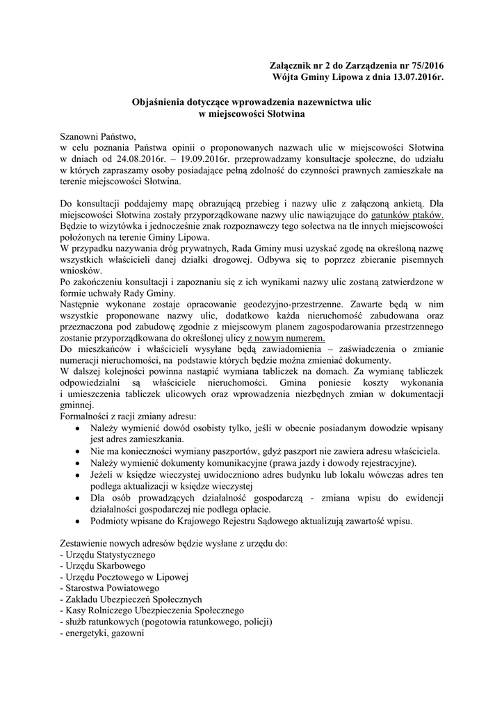 Załącznik nr 2 do Zarządzenia nr 75/2016 Wójta Gminy Lipowa z dnia 13.07.2016r. Objaśnienia dotyczące wprowadzenia nazewnictwa ulic w miejscowości Słotwina Szanowni Państwo, w celu poznania Państwa opinii o proponowanych nazwach ulic w miejscowości Słotwina w dniach od 24.08.2016r. – 19.09.2016r. przeprowadzamy konsultacje społeczne, do udziału w których zapraszamy osoby posiadające pełną zdolność do czynności prawnych zamieszkałe na terenie miejscowości Słotwina. Do konsultacji poddajemy mapę obrazującą przebieg i nazwy ulic z załączoną ankietą. Dla miejscowości Słotwina zostały przyporządkowane nazwy ulic nawiązujące do gatunków ptaków. Będzie to wizytówka i jednocześnie znak rozpoznawczy tego sołectwa na tle innych miejscowości położonych na terenie Gminy Lipowa. W przypadku nazywania dróg prywatnych, Rada Gminy musi uzyskać zgodę na określoną nazwę wszystkich właścicieli danej działki drogowej. Odbywa się to poprzez zbieranie pisemnych wniosków. Po zakończeniu konsultacji i zapoznaniu się z ich wynikami nazwy ulic zostaną zatwierdzone w formie uchwały Rady Gminy. Następnie wykonane zostaje opracowanie geodezyjno-przestrzenne. Zawarte będą w nim wszystkie proponowane nazwy ulic, dodatkowo każda nieruchomość zabudowana oraz przeznaczona pod zabudowę zgodnie z miejscowym planem zagospodarowania przestrzennego zostanie przyporządkowana do określonej ulicy z nowym numerem. Do mieszkańców i właścicieli wysyłane będą zawiadomienia – zaświadczenia o zmianie numeracji nieruchomości, na podstawie których będzie można zmieniać dokumenty. W dalszej kolejności powinna nastąpić wymiana tabliczek na domach. Za wymianę tabliczek odpowiedzialni są właściciele nieruchomości. Gmina poniesie koszty wykonania i umieszczenia tabliczek ulicowych oraz wprowadzenia niezbędnych zmian w dokumentacji gminnej. Formalności z racji zmiany adresu: Należy wymienić dowód osobisty tylko, jeśli w obecnie posiadanym dowodzie wpisany jest adres zamieszkania. Nie ma konieczności wymiany paszportów, gdyż paszport nie zawiera adresu właściciela. Należy wymienić dokumenty komunikacyjne (prawa jazdy i dowody rejestracyjne). Jeżeli w księdze wieczystej uwidoczniono adres budynku lub lokalu wówczas adres ten podlega aktualizacji w księdze wieczystej Dla osób prowadzących działalność gospodarczą - zmiana wpisu do ewidencji działalności gospodarczej nie podlega opłacie. Podmioty wpisane do Krajowego Rejestru Sądowego aktualizują zawartość wpisu. Zestawienie nowych adresów będzie wysłane z urzędu do: - Urzędu Statystycznego - Urzędu Skarbowego - Urzędu Pocztowego w Lipowej - Starostwa Powiatowego - Zakładu Ubezpieczeń Społecznych - Kasy Rolniczego Ubezpieczenia Społecznego - służb ratunkowych (pogotowia ratunkowego, policji) - energetyki, gazowni