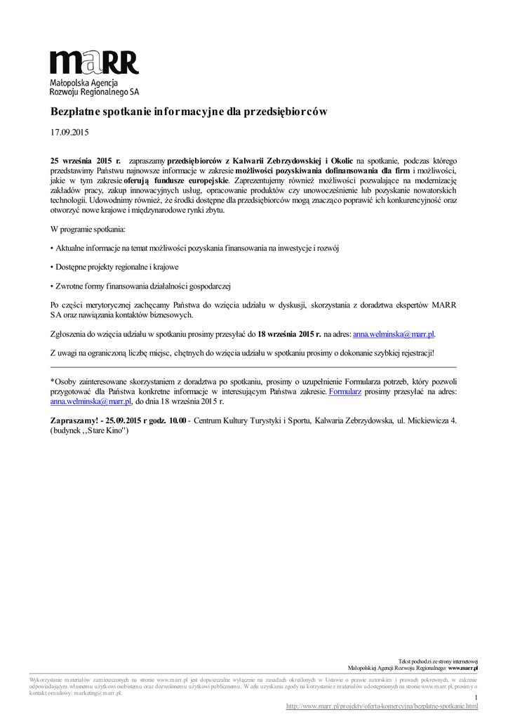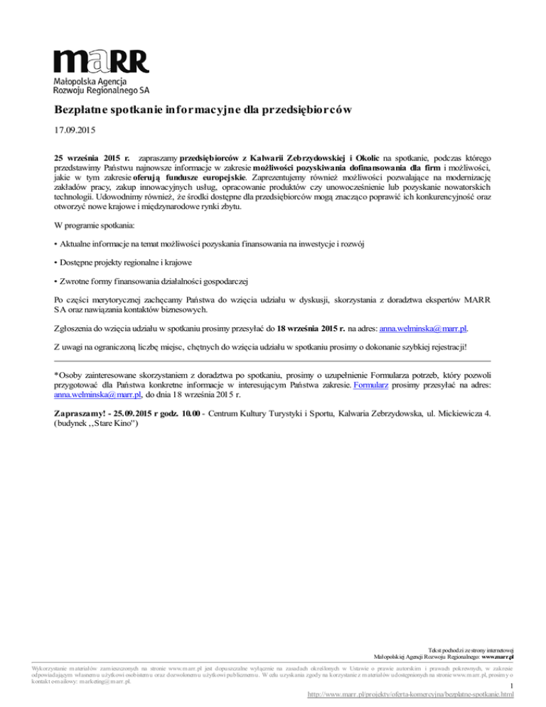 Bezpłatne spotkanie informacyjne dla przedsiębiorców 17.09.2015 25 września 2015 r. zapraszamy przedsiębiorców z Kalwarii Zebrzydowskiej i Okolic na spotkanie, podczas którego przedstawimy Państwu najnowsze informacje w zakresie możliwości pozyskiwania dofinansowania dla firm i możliwości, jakie w tym zakresie oferują fundusze europejskie. Zaprezentujemy również możliwości pozwalające na modernizację zakładów pracy, zakup innowacyjnych usług, opracowanie produktów czy unowocześnienie lub pozyskanie nowatorskich technologii. Udowodnimy również, że środki dostępne dla przedsiębiorców mogą znacząco poprawić ich konkurencyjność oraz otworzyć nowe krajowe i międzynarodowe rynki zbytu. W programie spotkania: • Aktualne informacje na temat możliwości pozyskania finansowania na inwestycje i rozwój • Dostępne projekty regionalne i krajowe • Zwrotne formy finansowania działalności gospodarczej Po części merytorycznej zachęcamy Państwa do wzięcia udziału w dyskusji, skorzystania z doradztwa ekspertów MARR SA oraz nawiązania kontaktów biznesowych. Zgłoszenia do wzięcia udziału w spotkaniu prosimy przesyłać do 18 września 2015 r. na adres: [email protected]. Z uwagi na ograniczoną liczbę miejsc, chętnych do wzięcia udziału w spotkaniu prosimy o dokonanie szybkiej rejestracji! *Osoby zainteresowane skorzystaniem z doradztwa po spotkaniu, prosimy o uzupełnienie Formularza potrzeb, który pozwoli przygotować dla Państwa konkretne informacje w interesującym Państwa zakresie. Formularz prosimy przesyłać na adres: [email protected], do dnia 18 września 2015 r. Zapraszamy! - 25.09.2015 r godz. 10.00 - Centrum Kultury Turystyki i Sportu, Kalwaria Zebrzydowska, ul. Mickiewicza 4. (budynek ,,Stare Kino'') Tekst pochodzi ze strony internetowej Małopolskiej Agencji Rozwoju Regionalnego: www.marr.pl Wykorzystanie m ateriałów zam ieszczonych na stronie www.m arr.pl jest dopuszczalne wyłącznie na zasadach określonych w Ustawie o prawie autorskim i prawach pokrewnych, w zakresie odpowiadającym własnem u użytkowi osobistem u oraz dozwolonem u użytkowi publicznem u. W celu uzyskania zgody na korzystanie z m ateriałów udostępnionych na stronie www.m arr.pl, prosim y o kontakt e-m ailowy: m arketing@m arr.pl. 1 http://www.marr.pl/projekty/oferta-komercyjna/bezplatne-spotkanie.html