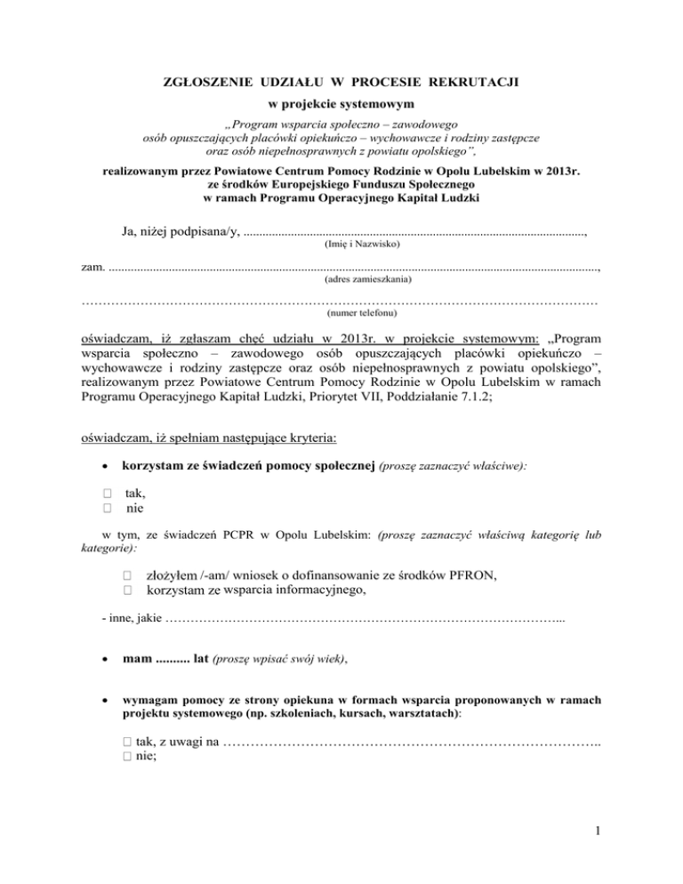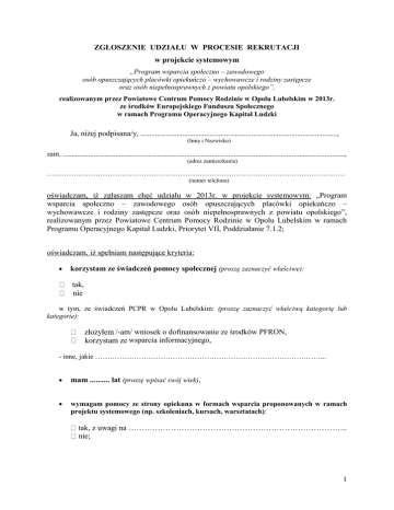 ZGŁOSZENIE UDZIAŁU W PROCESIE REKRUTACJI w projekcie systemowym „Program wsparcia społeczno – zawodowego osób opuszczających placówki opiekuńczo – wychowawcze i rodziny zastępcze oraz osób niepełnosprawnych z powiatu opolskiego”, realizowanym przez Powiatowe Centrum Pomocy Rodzinie w Opolu Lubelskim w 2013r. ze środków Europejskiego Funduszu Społecznego w ramach Programu Operacyjnego Kapitał Ludzki Ja, niżej podpisana/y, ............................................................................................................, (Imię i Nazwisko) zam. ..........................................................................................................................................................., (adres zamieszkania) …………………………………………………………………………………………………………… (numer telefonu) oświadczam, iż zgłaszam chęć udziału w 2013r. w projekcie systemowym: „Program wsparcia społeczno – zawodowego osób opuszczających placówki opiekuńczo – wychowawcze i rodziny zastępcze oraz osób niepełnosprawnych z powiatu opolskiego”, realizowanym przez Powiatowe Centrum Pomocy Rodzinie w Opolu Lubelskim w ramach Programu Operacyjnego Kapitał Ludzki, Priorytet VII, Poddziałanie 7.1.2; oświadczam, iż spełniam następujące kryteria: korzystam ze świadczeń pomocy społecznej (proszę zaznaczyć właściwe): tak, w tym, ze świadczeń PCPR w Opolu Lubelskim: (proszę zaznaczyć właściwą kategorię lub kategorie): /-am/ wniosek o dofinansowanie ze środków PFRON, wsparcia informacyjnego, - inne, jakie …………………………………………………………………………………... mam .......... lat (proszę wpisać swój wiek), wymagam pomocy ze strony opiekuna w formach wsparcia proponowanych w ramach projektu systemowego (np. szkoleniach, kursach, warsztatach): tak, z uwagi na ……………………………………………………………………….. nie; 1 mój status na rynku pracy (proszę zaznaczyć 1 właściwą kategorię): nie pracuję – jestem zarejestrowana/-y w Powiatowym Urzędzie Pracy jako osoba bezrobotna, nie pracuję – jestem zarejestrowana/-y w Powiatowym Urzędzie Pracy jako osoba poszukująca pracy, nie pracuję – nie jestem zarejestrowana/-y w Powiatowym Urzędzie Pracy, pracuję lub prowadzę własną działalność gospodarczą, posiadam aktualne orzeczenie o stopniu równoważne*(proszę zaznaczyć właściwe): niepełnosprawności lub orzeczenie , , , …………………………………………………………………………... po raz pierwszy ubiegam się o uczestnictwo w projekcie systemowym: (proszę zaznaczyć właściwą kategorię, w przypadku udziału w projekcie systemowym proszę podkreślić rok lub lata): , (byłem/-am uczestnikiem projektu w roku 2008) (byłem/-am uczestnikiem projektu w roku 2009) (byłem/-am uczestnikiem projektu w roku 2010), (byłem/-am uczestnikiem projektu w roku 2011), (byłem/-am uczestnikiem projektu w roku 2012), oświadczam, iż wyrażam zgodę na przetwarzanie w/w danych osobowych do celów procesu rekrutacji do projektu „Program wsparcia społeczno – zawodowego osób opuszczających placówki opiekuńczo – wychowawcze i rodziny zastępcze oraz osób niepełnosprawnych z powiatu opolskiego”, zostałem/am poinformowany/-a, że podanie danych jest dobrowolne oraz mam prawo dostępu do treści swoich danych i ich poprawiania – zgodnie z przepisami ustawy z dnia 29.08.1997 o ochronie danych osobowych (tj. Dz. U. z 2002 r. Nr 101, poz. 926, z późn. zm.). ................................................................................ (data i czytelny podpis osoby niepełnosprawnej) *zgodne z ustawą z 27 sierpnia 1997 r. o rehabilitacji zawodowej i społecznej oraz zatrudnianiu osób niepełnosprawnych (tj. Dz. U. z 2011r. Nr 127 poz. 721 z późniejszymi zmianami). 2 PLANOWANE FORMY WSPARCIA W RAMACH PROJEKTU SYSTEMOWEGO: Proszę określić stopień Pani/Pana zainteresowania poniższymi formami wsparcia w projekcie systemowym zaplanowanymi w 2013r. poprzez zakreślenie odpowiedniej cyfry w każdym punkcie: „3” oznacza „najbardziej zainteresowana/-y”, „2” oznacza „średnio zainteresowana/-y” „1” oznacza „najmniej zainteresowana/-y” „0”oznacza „nie zainteresowany”: 1. Szkolenie kosmetyczne. 0 1 2 3 2. Szkolenie w zakresie fotografii cyfrowej (fotografia i edycja zdjęć). 0 1 2 3 3. Warsztaty zdobienia przedmiotów użytkowych – decoupage. 0 1 2 3 0 1 2 3 4. Szkolenie z rękodzieła. 5. Kurs komputerowy w stopniu podstawowym. 0 1 2 3 6. Kurs komputerowy w stopniu zaawansowanym. 0 1 2 3 2 3 7. Warsztaty taneczne (dla osób chętnych) 0 1 3