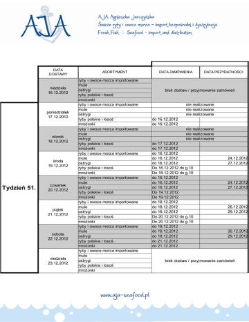 DATA DOSTAWY niedziela 16.12.2012 poniedziałek 17.12.2012 wtorek 18.12.2012 środa 19.12.2012 Tydzień 51. czwartek 20.12.2012 piątek 21.12.2012 sobota 22.12.2012 niedziela 23.12.2012 ASORTYMENT ryby i owoce morza importowane mule ostrygi ryby polskie i łosoś mrożonki ryby i owoce morza importowane mule ostrygi ryby polskie i łosoś mrożonki ryby i owoce morza importowane mule ostrygi ryby polskie i łosoś mrożonki ryby i owoce morza importowane mule ostrygi ryby polskie i łosoś mrożonki ryby i owoce morza importowane mule ostrygi ryby polskie i łosoś mrożonki ryby i owoce morza importowane mule ostrygi ryby polskie i łosoś mrożonki ryby i owoce morza importowane mule ostrygi ryby polskie i łosoś mrożonki ryby i owoce morza importowane mule ostrygi ryby polskie i łosoś mrożonki DATA ZAMÓWIENIA DATA PRZYDATNOŚCI brak dostaw / przyjmowanie zamówień nie realizowane nie realizowane nie realizowane do 16.12.2012 do 16.12.2012 nie realizowane nie realizowane nie realizowane do 17.12.2012 do 17.12.2012 do 16.12.2012 do 16.12.2012 do 16.12.2012 Do 18.12.2012 do g.10 Do 18.12.2012 do g.10 do 16.12.2012 do 16.12.2012 do 16.12.2012 Do 19.12.2012 Do 19.12.2012 do 18.12.2012 do 18.12.2012 do 18.12.2012 Do 20.12.2012 do g.10 Do 20.12.2012 do g.10 do 18.12.2012 do 18.12.2012 do 18.12.2012 do 21.12.2012 do 21.12.2012 24.12.2012 27.12.2012 24.12.2012 27.12.2012 26.12.2012 29.12.2012 26.12.2012 29.12.2012 brak dostaw / przyjmowanie zamówień Tydzień 52. poniedziałek 24.12.2012 nie czynne wtorek 25.12.2012 nie czynne środa 26.12.2012 nie czynne czwartek 27.12.2012 piątek 28.12.2012 sobota 29.12.2012 niedziela 30.12.2012 ryby i owoce morza importowane mule ostrygi ryby polskie i łosoś mrożonki ryby i owoce morza importowane mule ostrygi ryby polskie i łosoś mrożonki ryby i owoce morza importowane mule ostrygi ryby polskie i łosoś mrożonki ryby i owoce morza importowane mule ostrygi ryby polskie i łosoś mrożonki brak dostaw / przyjmowanie zamówień nie realizowane nie realizowane nie realizowane Do 27.12.2012 Do 27.12.2012 brak dostaw / przyjmowanie zamówień Do 27.12.2012 Do 27.12.2012 Do 27.12.2012 do 28.12.2012 do 28.12.2012 4.01.2013 7.01.2013 poniedziałek 31.12.2012 nie czynne wtorek 01.01.2013 nie czynne środa 02.01.2013 Tydzień 1. czwartek 03.01.2013 piątek 04.01.2013 ryby i owoce morza importowane mule ostrygi ryby polskie i łosoś mrożonki ryby i owoce morza importowane mule ostrygi ryby polskie i łosoś mrożonki ryby i owoce morza importowane mule ostrygi ryby polskie i łosoś mrożonki sobota 05.01.2013 niedziela 06.01.2013 brak dostaw / przyjmowanie zamówień nie realizowane nie realizowane nie realizowane do 02.01.2013 do 02.01.2013 nie realizowane nie realizowane nie realizowane do 03.01.2013 do 03.01.2013 nie czynne ryby i owoce morza importowane mule ostrygi ryby polskie i łosoś mrożonki brak dostaw / przyjmowanie zamówień