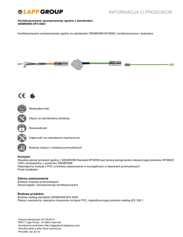 INFORMACJA O PRODUKCIE Konfekcjonowane serwoprzewody zgodne z standardem SIEMENS® 6FX 5002Konfekcjonowane serwoprzewody zgodne ze standardem SIEMENS® 6FX5002, konfekcjonowane i testowane Wodoodporność Złącze ze standardową obudową Niezawodność Odporność na uszkodzenia mechaniczne Budowa maszyn i instalacji przemysłowych Korzyści Wysokiej jakości przewód zgodny z SIEMENS® Standard 6FX5002 jest tańszą wersją bardzo elastycznego przewodu 6FX8002 100% kompatybilny z systemem SIEMENS® Olejoodporna izolacja z PVC umożliwia zastosowanie w szczególności w obszarach przemysłowych Fixed installation Zakres zastosowania Budowa instalacji przemysłowych Serwonapędy i serwoprzewody konfekcjonowane Budowa produktu Budowa według standardu SIEMENS® 6FX 5002 Płaszcz zewnętrzny: specjalna mieszanka na bazie PVC, niepodtrzymujący płomieni według IEC 332.1 Ostania aktualizacja (07.03.2017) ©2017 Lapp Group - all rights reserved. Zarządzanie produktem http://lapppoland.lappgroup.com Aktualne dane w pliku Dane techniczne. PN 0456 / 02_03.16 INFORMACJA O PRODUKCIE Konfekcjonowane serwoprzewody zgodne z standardem SIEMENS® 6FX 5002- Uwaga Maksymalna długość przewodów musi być zgodna z zaleceniami producentów napędów Dane techniczne odpowiadają zastosowaniu przewodów Budowa produktu Więcej wykonań i długości na zapytanie Dane techniczne Klasyfikacja: ETIM 5.0 Class-ID: EC000104 Opis klasy ETIM 5.0: Przewód sterowniczy Certyfikaty: Przewody zasilające: rejestracja VDE UL/CSA AWM Style 2570 Przewody sygnałowe: UL/CSA AWM Style 2502 Budowa żyły: Linka z cienkich drucików z czystej miedzi zgodnie z VDE 0295, klasa 6/IEC 60228, klasa 6 Minimalny promień gięcia: Połączenie nieruchome: 5 x średnica zewnętrzna Do połączeń ruchomych: 12 x zewnętrzna średnica Napięcie nominalne: Przewody sygnałowe: 30 V AC (IEC)30 V AC/DC (UL/CSA) Przewody zasilające: - Żyły zasilające: 1000 V (UL/CSA) 600/1000 V (IEC) - Żyły sterownicze: 1000 V (UL/CSA) 30 V AC (IEC) Zakres temperatury: Połączenia nieruchome: od -20°C do +80°C Połączenia ruchome: od 0°C do +60°C Wskazówka Wszystkie podane wartości dotyczące produktów są wartościami nominalnymi (o ile nie wskazano inaczej). Inne wartości, takie jak np. tolerancje mogą być przedstawione na zamówienie (jeżeli są dostępne i przeznaczone do publikacji). Nazwy produktów firmy Siemens (6FX5002/5008, 6FX7002/7008, 6FX8002/8008) są zarejestrowanymi znakami towarowymi firmy Siemens AG i służą tylko do celów porównawczych. DESINA® jest zastrzeżoną marką Związku Niemieckich Fabryk Obrabiarek Numer katalogowy odnosi się do oryginalnych produktów firmy LAPP Fotografie nie mogą być używane do wymiarowania oraz nie stanowią szczegółowego odwzorowania przedstawionych produktów. * Podane ceny to ceny netto bez podatku VAT i dodatkowych opłat. Sprzedaż klientom biznesowym. Ostania aktualizacja (07.03.2017) ©2017 Lapp Group - all rights reserved. Zarządzanie produktem http://lapppoland.lappgroup.com Aktualne dane w pliku Dane techniczne. PN 0456 / 02_03.16 Powered by TCPDF (www.tcpdf.org) Długość [m] Oznaczenie według standardu SIEMENS® Oznaczenie przewodu według SIEMENS® Indeks miedzi [kg/1000 sztuk] Inne długości Konfekcjonowane przewody do systemów transmisji sygnałów 74305559 10 6FX5002-2AD00-1BA0 6FX5008-1BD41 630 Inne odcinki na zapytanie 74305659 10 6FX5002-2AD04-1BA0 6FX5008-1BD41 630 Inne odcinki na zapytanie 74305859 10 6FX5002-2CA11-1BA0 6FX5008-1BD21 770 Inne odcinki na zapytanie 74306159 10 6FX5002-2CA34-1BA0 6FX5008-1BD51 690 Inne odcinki na zapytanie 74306659 10 6FX5002-2CF01-1BA0 6FX5008-1BD41 630 Inne odcinki na zapytanie 74307159 10 6FX5002-2EQ14-1BA0 6FX5008-1BD51 690 Inne odcinki na zapytanie 70430151 10 6FX5002-2DC20-1BA0 6FX2008-1DC00 370 Inne odcinki na zapytanie 74308259 10 6FX5002-5CA31-1BA0 6FX5008-1BB21 1320 Inne odcinki na zapytanie 74308559 10 6FX5002-5CA41-1BA0 6FX5008-1BB31 1950 Inne odcinki na zapytanie 74308659 10 6FX5002-5CA51-1BA0 6FX5008-1BB41 2800 Inne odcinki na zapytanie 70430004 10 6FX5002-5CS11-1BA0 6FX5008-1BB21 1940 Inne odcinki na zapytanie 74309159 10 6FX5002-5DA05-1BA0 6FX5008-1BA11 1430 Inne odcinki na zapytanie 74309960 10 6FX5002-5DA31-1BA0 6FX5008-1BA21 1940 Inne odcinki na zapytanie 74313361 10 6FX5002-5DA41-1BA0 6FX5008-1BA31 2720 Inne odcinki na zapytanie 74313661 10 6FX5002-5DA51-1BA0 6FX5008-1BA41 3510 Inne odcinki na zapytanie Konfekcjonowane serwoprzewody zgodne z standardem SIEMENS® 6FX 5002- Ostania aktualizacja (07.03.2017) ©2017 Lapp Group - all rights reserved. Zarządzanie produktem http://lapppoland.lappgroup.com Aktualne dane w pliku Dane techniczne. PN 0456 / 02_03.16 INFORMACJA O PRODUKCIE Powered by TCPDF (www.tcpdf.org) Numer katalogowy