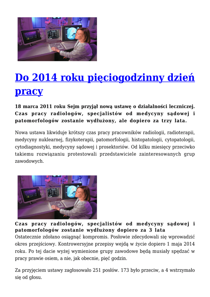 Do 2014 roku pięciogodzinny dzień pracy 18 marca 2011 roku Sejm przyjął nową ustawę o działalności leczniczej. Czas pracy radiologów, specjalistów od medycyny sądowej i patomorfologów zostanie wydłużony, ale dopiero za trzy lata. Nowa ustawa likwiduje krótszy czas pracy pracowników radiologii, radioterapii, medycyny nuklearnej, fizykoterapii, patomorfologii, histopatologii, cytopatologii, cytodiagnostyki, medycyny sądowej i prosektoriów. Od kilku miesięcy przeciwko takiemu rozwiązaniu protestowali przedstawiciele zainteresowanych grup zawodowych. Czas pracy radiologów, specjalistów od medycyny sądowej i patomorfologów zostanie wydłużony dopiero za 3 lata Ostatecznie zdołano osiągnąć kompromis. Posłowie zdecydowali się wprowadzić okres przejściowy. Kontrowersyjne przepisy wejdą w życie dopiero 1 maja 2014 roku. Po tej dacie wyżej wymienione grupy zawodowe będą musiały spędzać w pracy prawie osiem, a nie, jak obecnie, pięć godzin. Za przyjęciem ustawy zagłosowało 251 posłów. 173 było przeciw, a 4 wstrzymało się od głosu. I Konferencja Liczby-KomputeryŻycie. Relacja W dniach od 18 do 20 marca 2011 roku odbyła się na Uniwersytecie Jagiellońskim pierwsza konferencja studencka Liczby-Komputery-Życie. Obrady poświęcono zagadnieniom matematyczno-informatycznobiologicznym z jakimi spotykają się w swoich badaniach biofizycy, bioinformatycy czy biomatematycy. Podczas trzydniowej konferencji swoje dokonania przedstawiali naukowcy znajdujący się w różnych stadiach kariery naukowej, od studenta do profesora. Rozdźwięk w prezentacjach był spory. Jedne potrafiły zająć słuchaczy, inne były po prostu nudne. Podobnie przedstawiały się różnice pomiędzy doświadczonymi profesorami, a debiutującymi studentami. W prezentacjach, zwłaszcza matematycznych, często poruszane były czysto teoretyczne zagadnienia, pozbawione praktycznych wniosków. Być może matematycy się nie zgodzą, ale osobiście wolałabym dowiedzieć się w jaki sposób można te kosmiczne całki z prezentowanych slajdów wykorzystać, niż wysłuchać o jakie twierdzenia się opierają. W tym kontekście zastanawiał również brak podstaw wiedzy biologicznej u niektórych uczestników. Zadawane pytania w kompromitujący sposób obnażały niedouczenie w tym zakresie, zarówno słuchaczy jak i młodszych prelegentów; jakby zaprzeczali oni zasadności użycia modnego obecnie przedrostka bio (bioinformatyka, biomatematyka) przed faktycznym przedmiotem swoich zainteresowań. Czas pracy radiologów, specjalistów od medycyny sądowej i patomorfologów zostanie wydłużony dopiero za 3 lata Za największy sukces konferencji uważam osobisty udział profesora Janusza Bujnickiego, za którym po wykładzie z sali wyszła prawie połowa obecnych, by na korytarzu dyskutować z nim przez kolejne dwadzieścia minut. Prawdopodobnie trwałoby to znacznie dłużej, gdyby nie napięty grafik profesora, a także kolejne wystąpienie, które miało miejsce w tym samym czasie. Organizatorzy stanęli na wysokości zadania. Obyło się bez problemów technicznych, większych opóźnień czy innych utrudnień. Świetnym pomysłem okazały się stosy kanapek i ciastek oraz termosy z gorącą herbatą i kawą wnoszone na każdej przerwie, by w czasie spotkań posilić nie tylko duszę, ale i ciało. Jedyne co organizatorom się nie udało, to dobór konferansjerów. Wiele osób zwróciło uwagę na ich nieprofesjonalne zachowanie. Do gadżetów, które otrzymał każdy uczestnik, dołączona została krótka ankieta. Dzięki niej uda się zapewne wyłapać niedociągnięcia, choć startując już z tak wysokiego poziomu, trudno będzie o poprawę. Z niecierpliwością czekam na kolejną konferencję z cyklu Liczby-Komputery-Życie. Jeśli wierzyć zapowiedziom, odbędzie się ona za rok. Myślę, że warto będzie się na niej pojawić, choćby na jeden dzień. III Kongres Współczesnej Onkologii – „Nowotwory wyzwaniem XXI wieku” Zapraszamy do udziału w III Kongresie Współczesnej Onkologii z serii NOWOTWORY WYZWANIEM XXI WIEKU, który odbędzie się w Poznaniu w dniach od 14 do 16 kwietnia 2011 roku. Organizatorami Kongresu są: • czasopismo Współczesna Onkologia • wydawnictwo Termedia • Zakład Immunologii Nowotworów, Katedra Biotechnologii Medycznej Uniwersytetu Medycznego w Poznaniu Udział w tym wydarzeniu zapowiedziały światowe sławy onkologii: Marek Los – światowy ekspert od nowotworowych komórek macierzystych i apoptozy Pere Gascon – szef oddziału onkologii i koordynator naukowy w Institut Clinic de Malaties Hematologiques i Oncològiques (IC MHO) w Barcelonie Claudine Kieda – współodkrywczyni mechanizmów przeciwnowotworowych, ekspert terapii antyangiogennej Pravin Sehgal – współodkrywca interleukiny 6 (Nowy Jork) Mark Ratain – jeden z najważniejszych na świecie specjalistów w zakresie onkologii spersonalizowanej Alessandro Testori – przewodniczący grupy czerniaka, EORTC (Europejskiej Organizacji na rzecz Badań i Leczenia Raka) ekspert w dziedzinie elektrochemioterapii Christoph Zieliński – światowej sławy ekspert w dziedzinie nowotworów, koordynator wielu programów onkologicznych prowadzonych na świecie Strona www Kongresu: http://konferencje.termedia.pl/?III_Kongres_Wspolczesnej_Onkologii_-_strona_glo wna&e=76&p=856 Program Kongresu Czwartek, 14 kwietnia 2011 r. 10.00–12.40 PANEL DYSKUSYJNY Nic o nas bez nas – rzetelne partnerstwo z udziałem Polskiej Koalicji Organizacji Pacjentów Onkologicznych 12.40–13.00 Przerwa na kawę 13.00–14.30 SESJA 1. SKOJARZONE LECZENIE RAKA WĄTROBOWOKOMÓRKOWEGO W DOBIE LEKÓW UKIERUNKOWANYCH MOLEKULARNIE Przewodniczący: A. Deptała, M. Wojtukiewicz 13.00–13.20 Morfologiczno-molekularne podłoże rozwoju raka wątrobowokomórkowego A. Nasierowska-Guttmejer (Warszawa) 13.20–13.40 Interdyscyplinarne podejście do leczenia raka wątrobowokomórkowego P. Małkowski (Warszawa) 13.4