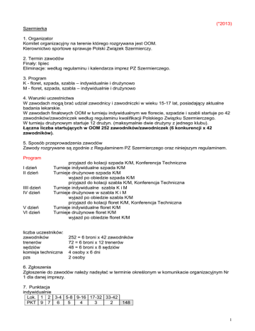 (*2013) Szermierka 1. Organizator Komitet organizacyjny na terenie którego rozgrywana jest OOM. Kierownictwo sportowe sprawuje Polski Związek Szermierczy. 2. Termin zawodów Finały: lipiec Eliminacje: według regulaminu i kalendarza imprez PZ Szermierczego. 3. Program K - floret, szpada, szabla – indywidualnie i drużynowo M - floret, szpada, szabla – indywidualnie i drużynowo 4. Warunki uczestnictwa W zawodach mogą brać udział zawodnicy i zawodniczki w wieku 15-17 lat, posiadający aktualne badania lekarskie. W zawodach finałowych OOM w turnieju indywidualnym we florecie, szpadzie i szabli startuje po 42 zawodników/zawodniczek według regulaminu kwalifikacji Polskiego Związku Szermierczego. W turnieju drużynowym startuje 12 drużyn. (maksymalnie dwie drużyny z jednego klubu). Łączna liczba startujących w OOM 252 zawodników/zawodniczek (6 konkurencji x 42 zawodników). 5. Sposób przeprowadzenia zawodów Zawody rozgrywane są zgodnie z Regulaminem PZ Szermierczego oraz niniejszym regulaminem. Program I dzień II dzień IIII dzień IV dzień V dzień VI dzień przyjazd do kolacji szpada K/M, Konferencja Techniczna Turnieje indywidualne szpada K/M Turnieje drużynowe szpada K/M wyjazd po obiedzie szpada K/M przyjazd do kolacji szabla K/M, Konferencja Techniczna Turnieje indywidualne szabla K i M Turnieje drużynowe w szabla K i M wyjazd po obiedzie szabla K/M przyjazd do kolacji floret K/M, Konferencja Techniczna Turnieje indywidualne floret K/M Turnieje drużynowe floret K/M wyjazd po obiedzie floret K/M liczba uczestników: zawodników trenerów sędziów komisja techniczna pzs 252 = 6 broni x 42 zawodników 72 = 6 broni x 12 trenerów 48 = 6 broni x 8 sędziów 4 osoby x 6 dni 2 osoby 6. Zgłoszenia Zgłoszenie do zawodów należy nadsyłać w terminie określonym w komunikacie organizacyjnym Nr 1 dla danej imprezy. 7. Punktacja indywidualnie Lok. 1 2 3-4 5-8 9-16 17-32 33-42 PKT 9 7 6 5 4 3 2 148 1 drużynowo Lok. 1 2 PKT 9 7 3 6 4 5 5 4 6 3 7-8 2 9-12 1 42 D. System ocen Szermierka I. Młodzieżowe Mistrzostwa Polski K/M - 21-23 lata 1. Program K - floret, szpada, szabla – indywidualnie i drużynowo M - floret, szpada, szabla – indywidualnie i drużynowo 2. Punktacja indywidualnie Lok. 1 2 3-4 5-8 9-16 PKT 25 21 18 12 5 170 drużynowo Lok. 1 2 3 4 5-6 PKT 25 20 15 10 4 78 dopuszcza się start jednego zawodnika 20-letniego w drużynie. II. Mistrzostwa Polski Juniorów K/M – 18-20 lat 1. Program K - floret, szpada, szabla – indywidualnie i drużynowo M - floret, szpada, szabla – indywidualnie i drużynowo 2. Punktacja indywidualnie Lok. 1 2 3-4 5-8 9-16 17-32 33-48 PKT 15 12 10 7 4 2 1 155 drużyny Lok. 1 2 3 4 5 6 7 8 9-12 PKT 15 12 10 8 7 6 5 4 3 79 dopuszcza się start jednego zawodnika 17-letniego w drużynie III. Olimpiada Młodzieży - Mistrzostwa Polski Juniorów młodszych K/M – 15-17 lat 1. Program K - floret, szpada, szabla – indywidualnie i drużynowo M - floret, szpada, szabla – indywidualnie i drużynowo 2. Punktacja indywidualnie Lok. 1 2 3-4 5-8 9-16 17-32 33-42 PKT 9 7 6 5 4 3 2 148 drużynowo Lok. 1 2 3 4 5 6 7-8 9-12 PKT 9 7 6 5 4 3 2 1 42 dopuszcza się start jednego zawodnika 14-letniego w drużynie lista PZ Szermierczego IV. Międzywojewódzkie Mistrzostwa Młodzików K/M – 12-14 lat 1. Program K - floret, szpada, szabla – indywidualnie i drużynowo M - floret, szpada, szabla – indywidualnie i drużynowo 2 indywidualnie Lok. 1 2-4 5-8 9-16 17-32 PKT 3 2 1 1 1 37 drużynowo Lok. 1 2 3-4 5-8 PKT 3 2 1 1 11 Strefy floret 2013 WLP MAZ DŚL ŁDZ KPM A – WLP-ZPM B – MAZ-PDL C – DŚL-ŚL-OPO-MŁP D – ŁDZ-PKR E – POM-KPM-WM szpada A – WLP-ZPM B – MAZ-POM-KPM-WM C – DŚL-LBU D – MŁP-PKR-ŁDZ E – ŚL-OPO 2013 WLP MAZ DŚL PKR ŚL szabla A – WLP-ZPM B – MAZ-PDL C – DŚL-ŚL-OPO D – MŁP-PKR-ŁDZ E – KPM-WM 2013 ZPM MAZ ŚL ŁDZ WM Uwaga: do punktacji zalicza się tylko zawodników w wieku: Młodzieżowe Mistrzostwa Polski Mistrzostwa Polski Juniorów Olimpiada Młodzieży Międzywojewódzkie Mistrzostwa Młodzików do punktacji zalicza się: w kategorii młodzieżowca i juniora w kategorii juniora młodszego i młodzika E. Roczniki młodzieżowcy juniorzy juniorzy młodsi młodzicy 21-23 lata 18-20 lat 15-17 lat 12-14 lat 3 konkurencje 2 konkurencje 21-23 lata (w 2013 roku urodzeni 01.01.1990 – 31.12.1992) 18-20 lat (w 2013 roku urodzeni 01.01.1993 – 31.12.1995) 15-17 lat (w 2013 roku urodzeni 01.01.1996 – 31.12.1998) 12-14 lat (w 2013 roku urodzeni 01.01.1999 – 31.12.2001) Przypominamy: - w zawodach uczestniczą kluby posiadające licencję wydaną przez właściwy polski związek, - zawodnicy muszą posiadać licencję wydaną przez właściwy związek, 3 - w przypadku braku licencji klubowej – punkty naliczane będą dla gminy, - komunikat z zawodów powinien zawierać: rok urodzenia zawodnika, numer licencji zawodnika oraz pełną nazwę klubu, wykaz członków komisji sędziowskiej wraz z ich nr licencji i być podpisany przez sędziego głównego z podaniem jego nr licencji - komunikat z zawodów należy przesłać na adres Polskiej Federacji Sportu Młodzieżowego w ciągu 14 dni po zawodach, - wnioski o przyznanie premii punktowej, wnioski o podział punktów powinny wpłynąć od pzs do Komisji Sportu PFSM najpóźniej w terminie do dnia 31 października danego roku (decyduje data stempla pocztowego), - uwagi dotyczące wprowadzonych danych, w szczególności nazw klubów i przyznanych punktów powinny wpływać na bieżąco do PFSM a najpóźniej w terminie do dnia 10 listopada danego roku, - prosimy o zapoznanie się z częścią ogólną regulaminu współzawodnictwa, gdzie podane są zasady uczestnictwa i oceny wyników we wszystkich dyscyplinach systemu, - na stronie internetowej PFSM (www.sportmlodziezowy.pl) umieszczane są średnio co dwa tygodnie wyniki współzawodnictwa, - od 2010 roku w Młodzieżowych Mistrzostwach Polski w konkurencjach indywidualnych, gdzie liczba ostate