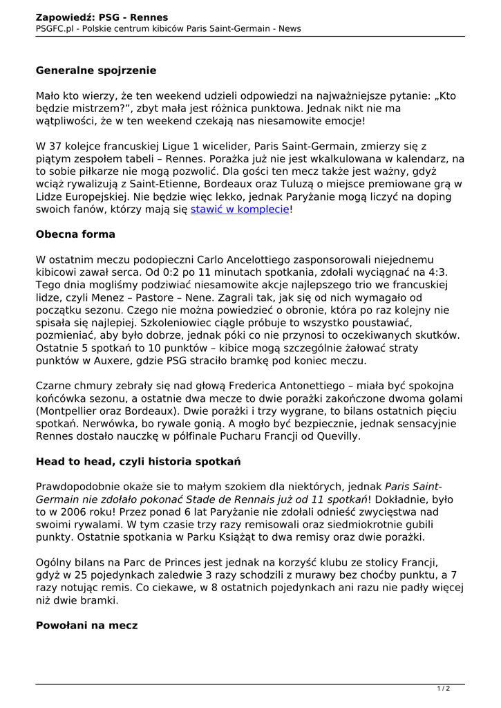 Zapowiedź: PSG - Rennes PSGFC.pl - Polskie centrum kibiców Paris Saint-Germain - News Generalne spojrzenie Mało kto wierzy, że ten weekend udzieli odpowiedzi na najważniejsze pytanie: „Kto będzie mistrzem?”, zbyt mała jest różnica punktowa. Jednak nikt nie ma wątpliwości, że w ten weekend czekają nas niesamowite emocje! W 37 kolejce francuskiej Ligue 1 wicelider, Paris Saint-Germain, zmierzy się z piątym zespołem tabeli – Rennes. Porażka już nie jest wkalkulowana w kalendarz, na to sobie piłkarze nie mogą pozwolić. Dla gości ten mecz także jest ważny, gdyż wciąż rywalizują z Saint-Etienne, Bordeaux oraz Tuluzą o miejsce premiowane grą w Lidze Europejskiej. Nie będzie więc lekko, jednak Paryżanie mogą liczyć na doping swoich fanów, którzy mają się stawić w komplecie! Obecna forma W ostatnim meczu podopieczni Carlo Ancelottiego zasponsorowali niejednemu kibicowi zawał serca. Od 0:2 po 11 minutach spotkania, zdołali wyciągnać na 4:3. Tego dnia mogliśmy podziwiać niesamowite akcje najlepszego trio we francuskiej lidze, czyli Menez – Pastore – Nene. Zagrali tak, jak się od nich wymagało od początku sezonu. Czego nie można powiedzieć o obronie, która po raz kolejny nie spisała się najlepiej. Szkoleniowiec ciągle próbuje to wszystko poustawiać, pozmieniać, aby było dobrze, jednak póki co nie przynosi to oczekiwanych skutków. Ostatnie 5 spotkań to 10 punktów – kibice mogą szczególnie żałować straty punktów w Auxere, gdzie PSG straciło bramkę pod koniec meczu. Czarne chmury zebrały się nad głową Frederica Antonettiego – miała być spokojna końcówka sezonu, a ostatnie dwa mecze to dwie porażki zakończone dwoma golami (Montpellier oraz Bordeaux). Dwie porażki i trzy wygrane, to bilans ostatnich pięciu spotkań. Nerwówka, bo rywale gonią. A mogło być bezpiecznie, jednak sensacyjnie Rennes dostało nauczkę w półfinale Pucharu Francji od Quevilly. Head to head, czyli historia spotkań Prawdopodobnie okaże sie to małym szokiem dla niektórych, jednak Paris SaintGermain nie zdołało pokonać Stade de Rennais już od 11 spotkań! Dokładnie, było to w 2006 roku! Przez ponad 6 lat Paryżanie nie zdołali odnieść zwycięstwa nad swoimi rywalami. W tym czasie trzy razy remisowali oraz siedmiokrotnie gubili punkty. Ostatnie spotkania w Parku Książąt to dwa remisy oraz dwie porażki. Ogólny bilans na Parc de Princes jest jednak na korzyść klubu ze stolicy Francji, gdyż w 25 pojedynkach zaledwie 3 razy schodzili z murawy bez choćby punktu, a 7 razy notując remis. Co ciekawe, w 8 ostatnich pojedynkach ani razu nie padły więcej niż dwie bramki. Powołani na mecz 1/2 Zapowiedź: PSG - Rennes PSGFC.pl - Polskie centrum kibiców Paris Saint-Germain - News PSG: Douchez, Sirigu, Aréola - Alex, Armand, Ceara, Tiéné, Z.Camara, Jallet, Lugano, Sakho, Maxwell - Chantôme, Pastore, Moh.Sissoko, Nenê, Menez, Matuidi, Bodmer Hoarau, Luyindula, Gameiro. Rennes: Costil, Ab.Diallo – Kana-Biyik, Boye, Théophile-Catherine, Mavinga, Danzé, Apam – Brahimi, T.Doumbia, Féret, M’Vila, Tettey, Pajot – Kembo-Ekoko, Pitroipa, Hadji, Montaño. Notowania bukmacherów O dziwo, bukmacherzy mocno wierzą w ekipę Carlo Ancelottiego. Biorąc pod uwagę rangę spotkania, kurs na zwycięstwo gospodarzy jest dosyć niski, zaledwie 1.57. Stawiając 100 zł na gościu dzisiejszego pojedynku, w razie wygranej, zarobilibyśmy ponad pół tysiąca, a dokładnie 575 zł. Typ redakcji Wierzymy nie tylko w zwycięstwo nad Rennes, ale także w mistrzostwo. Aby tego dokonać, Nene oraz Pastore jutro zaprowadzą piłkę do bramki strzeżonej przez Benoit Costila. PSG 2:0 Rennes. Gdzie obejrzeć? Transmisję znajdziecie także na stronie naszego partnera - MeczeNaZywo.pl , wystarczy, że klikniecie tutaj! Autor: kublu 2/2 Powered by TCPDF (www.tcpdf.org)