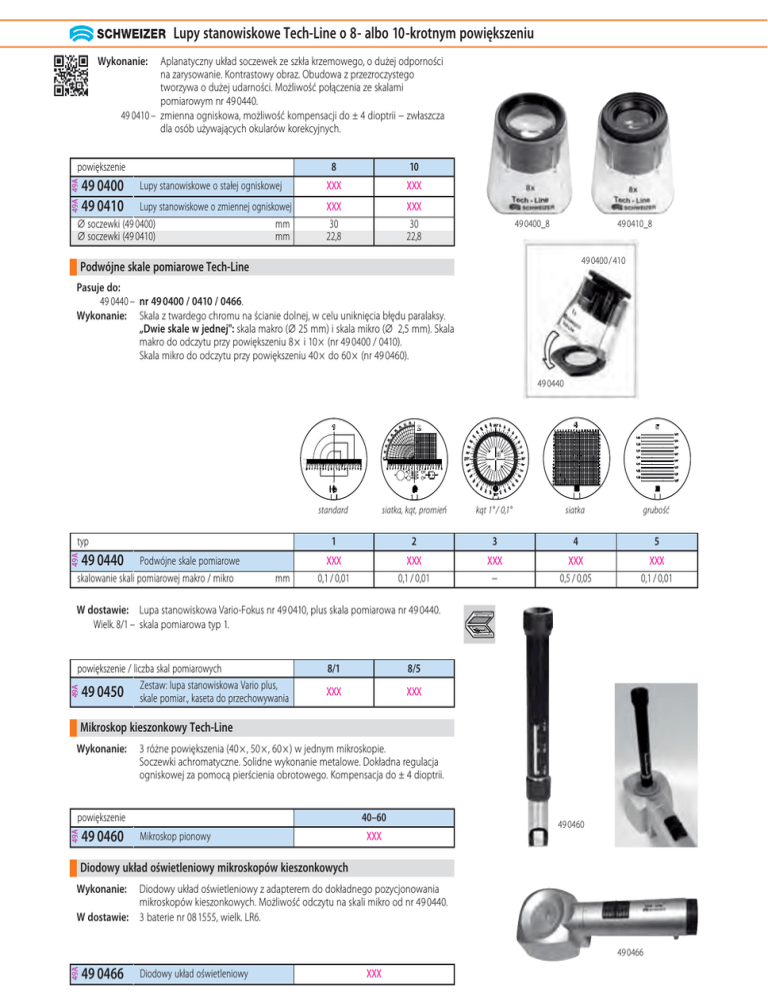 Lupy stanowiskowe Tech-Line o 8- albo 10-krotnym powiększeniu Wykonanie: Aplanatyczny układ soczewek ze szkła krzemowego, o dużej odporności na zarysowanie. Kontrastowy obraz. Obudowa z przezroczystego tworzywa o dużej udarności. Możliwość połączenia ze skalami pomiarowym nr 49 0440. 49 0410 – zmienna ogniskowa, możliwość kompensacji do ± 4 dioptrii − zwłaszcza dla osób używających okularów korekcyjnych. 49A 49A powiększenie 49 0400 49 0410 Lupy stanowiskowe o stałej ogniskowej Lupy stanowiskowe o zmiennej ogniskowej mm ⌀ soczewki (49 0400) ⌀ soczewki (49 0410) mm 8 10 XXX XXX XXX 30 22,8 XXX 30 22,8 49 0400_8 49 0410_8 49 0400 / 410 Podwójne skale pomiarowe Tech-Line Pasuje do: 49 0440 – nr 49 0400 / 0410 / 0466. Wykonanie: Skala z twardego chromu na ścianie dolnej, w celu uniknięcia błędu paralaksy. „Dwie skale w jednej": skala makro (⌀ 25 mm) i skala mikro (⌀ 2,5 mm). Skala makro do odczytu przy powiększeniu 8× i 10× (nr 49 0400 / 0410). Skala mikro do odczytu przy powiększeniu 40× do 60× (nr 49 0460). 49 0440 standard 49A typ 49 0440 Podwójne skale pomiarowe skalowanie skali pomiarowej makro / mikro mm siatka, kąt, promień kąt 1° / 0,1° siatka grubość 1 2 3 4 5 XXX 0,1 / 0,01 XXX 0,1 / 0,01 XXX − XXX 0,5 / 0,05 XXX 0,1 / 0,01 W dostawie: Lupa stanowiskowa Vario-Fokus nr 49 0410, plus skala pomiarowa nr 49 0440. Wielk. 8/1 – skala pomiarowa typ 1. 49A powiększenie / liczba skal pomiarowych lupa stanowiskowa Vario plus, 49 0450 Zestaw: skale pomiar., kaseta do przechowywania 8/1 8/5 XXX XXX Mikroskop kieszonkowy Tech-Line Wykonanie: 3 różne powiększenia (40×, 50×, 60×) w jednym mikroskopie. Soczewki achromatyczne. Solidne wykonanie metalowe. Dokładna regulacja ogniskowej za pomocą pierścienia obrotowego. Kompensacja do ± 4 dioptrii. 40–60 49A powiększenie 49 0460 Mikroskop pionowy XXX 49 0460 Diodowy układ oświetleniowy mikroskopów kieszonkowych Wykonanie: W dostawie: Diodowy układ oświetleniowy z adapterem do dokładnego pozycjonowania mikroskopów kieszonkowych. Możliwość odczytu na skali mikro od nr 49 0440. 3 baterie nr 08 1555, wielk. LR6. 49A 49 0466 49 0466 Diodowy układ oświetleniowy XXX