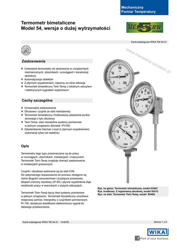 Mechaniczny Pomiar Temperatury Termometr bimetaliczne Model 54, wersja o dużej wytrzymałości Karta katalogowa WIKA TM 54.01 ww w.m Zastosowanie Uniersalne termometry do stosowania w urządzeniach mechanicznych, zbiornikach, rurociągach i konstrukcji aparatury Automatyzacja obiektów Z płynnym wypełnieniem, odporny na silne wibracje Termometr bimetaliczny Twin-Temp z lokalnym odczytem i elektrycznym sygnałem wyjściowym era ser w.s zcz eci n.p Cechy szczególne Uniwersalne zastosowanie Obudowa i czujnik ze stali nierdzewnej Termometr bimetaliczny możliwością ustawiania punktu zerowego z tyłu obudowy Twin-Temp: dwa niezależne systemy pomiarowe w jednym urządzeniu (bimetal i Pt100) Zatwierdzenie German Lioyd (z płynnym wypełnieniem, wykonanie tylne lub radialne) Opis Termometry tego typu przeznaczone są do pracy w rurociągach, zbiornikach, instalacjach i maszynach. Termometr Twin-Temp znajduje również zastosowanie w instalacjach grzewczych. Czujnik i obudowa wykonane są ze stali CrNi. Do optymalnego dopasowania do procesu dostępne są różne długości zanurzeniowe i przyłącza procesowe. Stopień ochrony obudowy (IP 65) i płynne wypełnienie daje możliwość pracy w warunkach o dużych wibracjach. Termometr Twin-Temp łączy dwa systemy pomiarowe w jednym urządzeniu. Termometr bimetaliczny umożliwia miejscowy pomiar, intergralny z czujnikiem pomiarowym Pt 100, dostarcza dodatkowo elektroniczny sygnał do dalszego przetworzenia. Karta katalogowa WIKA TM 54.01 · 10/2005 Rys. na górze: Termometr bimetaliczny, model A5402 Rys. środkowy: Z regulowaną obudową, model S5412 Rys. na dole: Termometr Twin-Temp, model R5462 Strona 1 z 6 l Cechy standardowe Obudowa, pokrywa, czujnik, przyłącze procesowe Stal CrNi System pomiarowy Sprężyna bimetaliczna (i Pt100 w Twin-Temp) Średnica obudowy 63, 80, 100 Kolano z tyłu obudowy Aluminium, tylko dla przyłączy dolnych Podzielnia Aluminium matowe, czarna skala Forma budowy złącza S standardowe (przyłącze gwintowe, stałe) 1 czujnik gładki (bez gwintu) 2 złącze ruchome z gwintem zewnętrznym 3 ruchome złącze z gwintem wewnętrznym 4 złącze zaciskowe (przesuwne na czujniku) 5 złącze ruchome z uszczelką Przyłącze procesowe A54XX tylne (axial) R54XX dolne (radialne) S54XX tylne, z regulowaną obudową (nie dla Twin-Temp) Klasa dokładności Mechaniczne: 1 wg DIN EN 13 190 Elektryczne (dla Twin-Temp): B wg DIN IEC 751 3-przewodowy Zakres roboczy temperatury Stały: zakres pomiarowy (DIN EN 13 190) Pomiar chwilowy (max. 24 h): zakres wskazań (DIN EN 13 Zakres pomiarowy, wskazań1), błąd graniczny (DIN EN 13 190) Wartość elementrana działki zg ze standardem WIKA Szyba Szkło przemysłowe Wskazówka Czarne aluminium, nastawna Dopuszczalne przeciążenie czujnika Max. 25 bar, statyczne Dopuszczalna temperatura otocznia dla osłony +60 °C max. (inne na zapytanie) Stopień ochrony obudowy IP 65 (EN 60 529 / IEC 529) Opcjonalnie Zakres wskazań °F, °C/°F (podwójna skala) Płynne wypełnienie max. 250°C (na czujnik) Zatwierdzenie GL dla wykonania z płynnym wypełnieniem, nie dla wykonania z regulowaną obudową i wersji Twin-Temp. (dopuszczalne wibracje 25 ... 200 Hz, 5 g) Szyba wielowarstwowa bezpieczna, akrylowa Zakres wskazań w °C Zakres pomiarowy Wartość elementarna w °C działki w °C Błąd graniczny ± °C -30 ... +50 -20 ... +60 0 ... 60 0 ... 80 0 ... 100 0 ... 120 0 ... 160 0 ... 200 0 ... 250 0 ... 300 2) 0 ... 400 2) 0 ... 500 2) -20 ... +40 -10 ... +50 +10 ... +50 +10 ... +70 +10 ... +90 +10 ... +110 +20 ... +140 +20 ... +180 +30 ... +220 +30 ... +270 +50 ... +350 +50 ... +450 1 1 1 1 1 2 2 2 2,5 5 5 5 0,5 0,5 0,5 0,5 1 1 1 2 2 2 5 5 1) Zakres pomiarowy jest na podzielni za pomocą dwóch trókątnych oznaczeń. Granica błędu dla danego zakresu zgodna jest z DIN EN 13 190 . 2 Nie dla Twin-Temp Modele Wykonanie Średnica 63 80 Model 54 tylny A5400 A5401 dolny R5440 R5441 Model 54, regulowana obudowa S5410 S5411 Model 54, Twin-Temp tylny A5450 A5451 dolny R5460 R5461 100 A5402 R5442 S5412 A5452 R5462 Forma budowa złącza S 1 2 3 x x - x x x x x x x x x x - - x x x - - 4 5 x x x x x x x x - x ... możliwe formy budowy złącza Strona 2 z 6 Karta katalogowa WIKA TM 54.01 · 10/2005 Wymiary w mm 3073050U Forma budowy złącza S, standardowe (przyłącze gwintowe, stałe) Standardowa długość zanurzeniowa l1: 100, 160, 200, 250 mm Średnica Przyłącze procesowe Wymiary w mm NS G i SW d4 Ød 63, 80, 100 G 1/2 B 14 27 26 6; 8; 10 G 3/4 B 16 32 32 6; 8; 10 1/2 NPT 19 22 - 6; 8; 10 3/4 NPT 20 30 - 6; 8; 10 Legenda: G Gwint zewnętrzny i Długość gwintu Ø d4 Średnica uszczelki SW Pod klucz Ø d Średnica czujnika 3073050V Forma budowy złącza 1, czujnik gładki (bez gwintu) Standardowa długość zanurzeniowa l:100, 140, 160, 200, 240, 290 mm Średnica Wymiary w mm NS d6 Ød 63, 80, 100 18 6; 8; 10 Legenda: Ø d6 Średnica przyłącza Ø d Średnica czujnika 3073050W Forma budowy złącza 2, przyłącze ruchome, gwint zew. Standardowa długość zanurzeniowa l1: 140, 180, 230 mm Średnica Przyłącze procesowe Wymiary w mm NS G i SW Ød 63, 80, 100 G 1/2 B 20 27 6; 8; 10 M18 x 1,5 12 24 6; 8; 10 Legenda: G Gwint zewnętrzny i Długość gwintu SW Pod klucz Ø d Średnica czujnika 3073050X Forma budowy złącza 3, przyłącze ruchome, gwint wew. Standardowa długość zanurzeniowa l1: 126, 186, 226, 276 mm Średnica Przyłącze procesowe Wymiary w mm NS G i SW Ød 63, 80, 100 G 1/2 8,5 27 6; 8; 10 G 3/4 10,5 32 6; 8; 10 M20 x 1,5 13,5 32 6; 8; 10 Legenda: G1 Gwint wewnętrzny i Długość gwintu SW Pod klucz Ø d Średnica czujnika Karta katalogowa WIKA TM 54.01 · 10/2005 Strona 3 z 6 Forma budowy złącza 4, złącze zaciskowe (przesuwne na czujniku) Długość zanurzeniowa l1 = różna Długość L = l1 + 40 mm Średnica Przyłącze procesowe Wymiary w mm NS G i SW d4 Ød 63, 80, 100 G 1/2 B 14 27 26 6; 8; 10 G 3/4 B 16 32 32 6; 8; 10 1/2 NPT 19 22 - 6; 8; 10 3/4 NPT 20 30 - 6; 8; 10 3