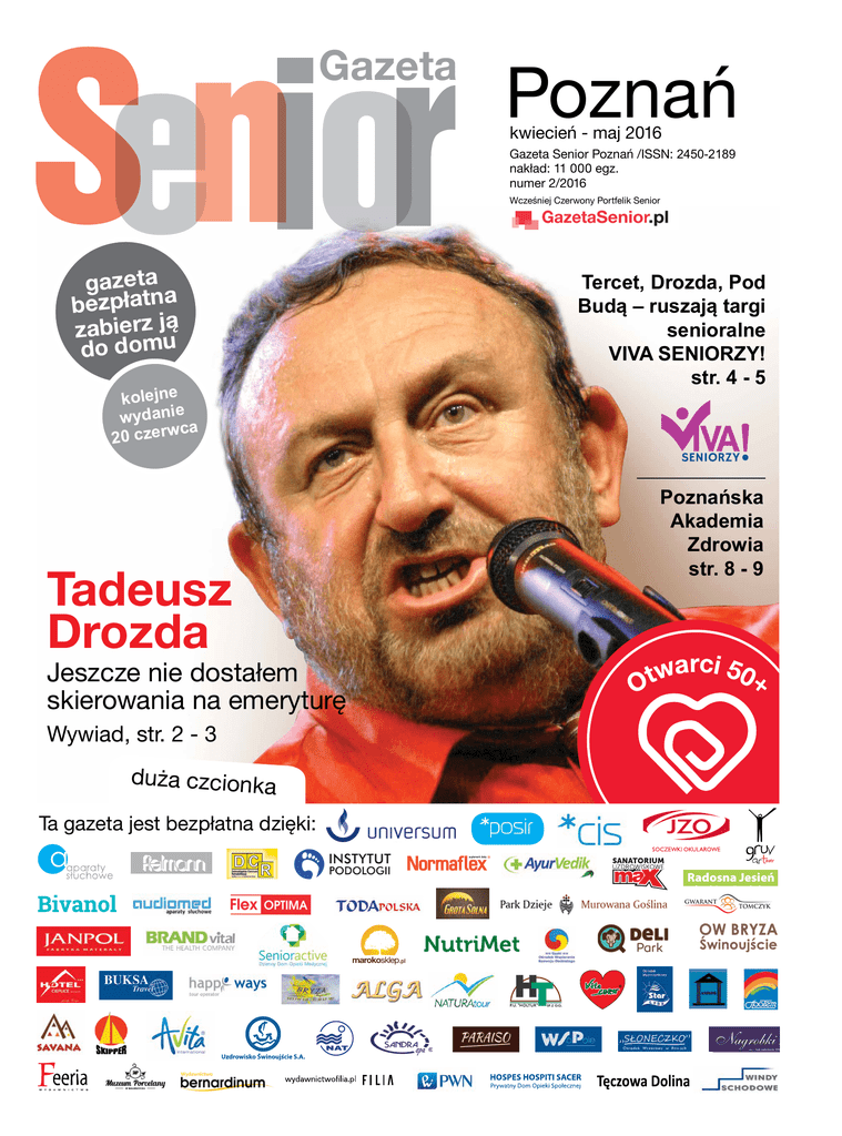 Gazeta Poznań 1 kwiecień - maj 2016 Gazeta Senior Poznań /ISSN: 2450-2189 nakład: 11 000 egz. numer 2/2016 Wcześniej Czerwony Portfelik Senior gazeta bezpłatna zabierz juą do dom Tercet, Drozda, Pod Budą – ruszają targi senioralne VIVA SENIORZY! str. 4 - 5 kolejne wydanie ca 20 czerw Poznańska Akademia Zdrowia str. 8 - 9 Tadeusz Drozda Jeszcze nie dostałem skierowania na emeryturę Wywiad, str. 2 - 3 Filia_POZ_kwi_maj_gotowy_poprawiony.pdf 1 2016-04-02 18:27:47 duża czcionka Ta gazeta jest bezpłatna dzięki: 2016 Radosna Jesień C w Przybrodzie za Przeźmierowem M Y CM MY CY CMY K tel. 61 819 38 62 kom. 697 528 113 Pensjonat Radosna Jesień ul. Kaźmierska 25, 62-090 Przybroda [email protected] ZAPEWNIAMY: CZYNNE CODZIENNIE OD 10 DO 16 W ŚRODY OD 10 DO 18 PORCELANA EUROPEJSKA PORCELANA ŚLĄSKA opiekę lekarza rodzinnego i lekarzy specjalistów, rehabilitację, pranie odzieży, pokoje 2-osobowe z łazienkami, pełne wyżywienie – z uwzględnieniem diety wg zaleceń lekarza, tereny spacerowe, opiekę duszpasterską, organizację czasu wolnego poprzez programy kulturalno-oświatowe, usługi fryzjersko-kosmetyczne 2 Rozmowa z Gwiazdą Drodzy Czytelnicy, cieszę się, że mogę oddać w Wasze ręce to wyjątkowe, wiosenne wydanie. Znajdziecie w nim mnóstwo informacji na temat wydarzeń, tych mniejszych i większych, wobec których nie możecie przejść obojętnie. Wiosenny sezon otwierają Targi Viva Seniorzy. To kumulacja gwiazd, atrakcyjnych spotkań i cennych warsztatów. Nie może Was na nich zabraknąć. Z tej okazji, specjalnie dla Was, rozmowa z Tadeuszem Drozdą, z którym będzie można pośmiać się także w czasie występów gwiazd w ramach programu, który przygotowali organizatorzy imprezy. Zespół Targów i Centrum Inicjatyw Senioralnych z Poznania spisali się na medal i to wszystko z myślą o Was. Zapraszamy przy tej okazji do odwiedzenia stoiska Gazety Senior. Dla pierwszych gości przygotowaliśmy prezenty niespodzianki zgodnie z zasadą, coś dla ciała i coś dla ducha. Anna Dymna po raz kolejny dzieli się z Wami swoimi refleksjami. Ten cykl polecam szczególnie. Pamiętajcie również o jej wspaniałych, ale niepełnosprawnych umysłowo podopiecznych z fundacji "Mimo wszystko". Wy też możecie im pomóc. Pani Krystyna Bandera pisze i publikuje cudne wiersze, a Pan Ryszard Chwaliński kolekcjonuje banknoty i monety. Hobby to dla naszych bohaterów źródło turbodoładowania w zmaganiach z codziennością, która niesie swoje dobre ale i gorsze chwile. Mam nadzieję, że będzie to dla Was inspiracja do rozwijania swoich pasji na emeryturze, jeżeli jeszcze tego nie robicie. www.gazetasenior.pl / dwumiesiecznik bezpłatny Jeszcze nie dostałem skierowania na emeryturę Jeden z najbardziej znanych satyryków w kraju. Założyciel wrocławskiego kabaretu Elita. Z wykształcenia inżynier elektryk, z zamiłowania i pracy zawodowej komik, aktor, konferansjer. Miłośnik dobrej kuchni i golfa. Od roku na emeryturze, choć jak mówi, kwoty z ZUS są tak nikłe, że nie zauważa zmiany w swoim statusie zawodowym… W rozmowie z Magdą Wieteską Tadeusz Drozda opowiada o swoim życiu zawodowym i prywatnym. Znajdziecie również mnóstwo ciekawostek z rynku. Dowiecie się, po jakie produkty warto sięgnąć i z jakich usług możecie skorzystać. Wszystko, aby za rozsądne pieniądze rozwiązać Wasze codzienne problemy, a czasem po prostu odpocząć i dobrze się zabawić. A dla tych którzy chcą się wyrwać gdzieś dalej bogata giełda ofert turystycznych. Tu każdy znajdzie coś dla siebie. Zadanie dla Was do czasu kolejnego wydania. Myślcie o sobie dobrze, dbajcie o siebie, śmiejcie się do rozpuku minimum raz dziennie i korzystajcie z dobrej pogody, która już nadeszła. Czasem trzeba się trochę zmusić, żeby wyjść z domu, ale warto. Widzimy się za dwa miesiące, może ciut starsi, ale dzięki tym zabiegom szczęśliwsi. Magda Wieteska: Jak minął Panu ostatni rok? Tadeusz Drozda: Tak, jak napisałem o tym na swojej stronie internetowej, uspokajając moich fanów, że nie jest ze mną źle. Rodzinnie sytuacja jest stabilna, nie przybyło mi wnuków ani zięciów. Jedna córka jeszcze stanu wolnego. Zawodowo też stabilizacja, nie udało mi się wrócić do telewizji publicznej, ale przygarnęła mnie SUPERSTACJA, gdzie co tydzień się mądrzę w programie „Drozda na weekend”. Linda Matus redaktor naczelna MediaSenior.pl agencja marketingowa skupiająca ekspertów marketingu 50+. Potrzebujesz wsparcia w swoich działaniach marketingowych kierowanych do seniorów? Dopiero zaczynasz działać w tym sektorze. Zapraszamy do współpracy firmy, organizacje pozarządowe, samorządy. Gazeta Senior Poznań ISSN 2450-2189, nr 2/2016 Wcześniej „Czerwony Portfelik Senior” (Z seniorami od 2011r.) ul. T. Kościuszki 35C, 50-011 Wrocław tel. 505 151 952 Listy elektroniczne (e-mail) kierujcie na adres: [email protected] Znajdziecie nas również w internecie (wydanie elektroniczne) www.gazetasenior.pl M.W.: Z wykształcenia jest Pan inżynierem elektrykiem. Czy pracował Pan kiedykolwiek w wyuczonym zawodzie? T.D.: Niestety, Polska jest krajem, gdzie niemal nikt nie pracuje w wyuczonym zawodzie. Byłem jakiś czas kierownikiem technicznym jednej z firm estradowych, ale to miało niewiele wspólnego ze studiami. oraz na Facebook’u www.facebook.com/GazetaSenior Prenumerata Wszelkie pytania dotyczące prenumeraty kierujcie pod numer tel. 505 151 952 Marta udzieli Wam wyczerpującej odpowiedzi Reklama Zainteresowanych zamieszczeniem reklamy prosimy o kontakt z Krzysztofem pod numerem tel. 533 301 662 M.W.: Kabaret Elita, który założył Pan wraz z Janem Kaczmarkiem, w latach 70-tych i 80-tych święcił największe triumfy, a znany jest i występuje do dziś. Skąd wziął się pomysł na taki akurat rodzaj rozrywki? Bo nie jest tajemnicą, że zdawał Pan, i to dwa razy, do szkoły teatralnej... T.D.: Do szkoły teatralnej mnie nie przyjęto, 