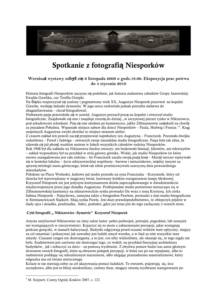 Spotkanie z fotografią Niesporków WernisaŜ wystawy odbył się 6 listopada 2009 o godz.18.00. Ekspozycja prac potrwa do 4 stycznia 2010 Historia fotografii Niesporków zaczyna się podobnie, jak historia malarstwa członków Grupy Janowskiej: Ewalda Gawlika, czy Teofila Ociepki. Na Śląsku rozpoczynał się szalony i pogmatwany wiek XX, Augustyn Niesporek pracował na kopalni Giesche, wydając ładunki dynamitu. W jego sercu rozkwitała jednak potrzeba niełatwa do zbagatelizowania – chciał fotografować. Niebawem pasja przerodziła się w zawód, Augustyn porzucił pracę na kopalni i otworzył studio fotograficzne. Znajdowało się ono i znajduje zresztą do dzisiaj „w szczytowej pierzei rynku w Nikiszowcu, pod arkadowymi schodami. Pną się one ukośnie po kamieniczce, jakby Zillmannowie zatęsknili na chwilę za pejzaŜem Południa. Wspaniałe miejsce zabaw dla dzieci Niesporków – Paula, Hedwig i Franza.”1. Krąg znajomych Augustyna zwykł określać to miejsce mianem atelier. Z czasem zakład ten powoli zaczął przejmować najmłodszy syn Augustyna – Franciszek. Pozostała dwójka rodzeństwa – Paweł i Jadwiga – otworzyli swoje niezaleŜne studia fotograficzne. Pasja była tak silna, Ŝe zdawała się juŜ płynąć wartkim nurtem w Ŝyłach wszystkich członków rodziny Niesporków. Rok 1948 był dla zakładu na Nikiszowcu bardzo owocny, nie brakowało fantazji, klientów, ani rekwizytów – zakład wyposaŜony był na przykład w strój galowy górnika. Widać, jak studio Niesporków (w które znowu zaangaŜowana jest cała rodzina – bo Franciszek zaraŜa swoją pasją Ŝonę – Marię) mocno wpisywało się w kontekst lokalny – Ŝycie nikiszowieckiej wspólnoty - barwne i nietuzinkowe, między innymi za sprawą mitologii stanu górniczego, która tak silnie przenicowywała szarzyznę dnia powszedniego mieszkańców. PołoŜone na Placu Wolności, kultowe juŜ studio przeszło na syna Franciszka – Krzysztofa. który od dziecka był wprowadzany w magiczny świat, kreowany krótkim rozognieniem lampy błyskowej. Krzysztof Niesporek nie jest jedynym kontynuatorem dzieła zapoczątkowanego w dwudziestoleciu międzywojennym przez jego dziadka Augustyna. Profesjonalne studio portretowe mieszczące się w Zillmannowskiej kamienicy na nikiszowieckim rynku prowadzi On wraz z Ŝoną Krystyną. Ich córka Sabina Niesporek – Najuchowa, zamęŜna takŜe z fotografem Pawłem, prowadzi z nim studio fotograficzne w Siemianowicach Śląskich. Mają synka Pawła. Jest duŜe prawdopodobieństwo, Ŝe chłopczyk pójdzie w ślady ojca i dziadka, pradziadka, babci, prababci, gdyŜ juŜ teraz jest do tego zachęcany z wszech stron. Cykl fotografii „ Nikiszowiec -Symetrie" Krzysztof Niesporek Artysta ustylizował Nikiszowiec na istny salon luster: pełen podwojeń, potrojeń, pogrubień, lub zawęŜeń nie występujących w rzeczywistości. Kojarzyć się to moŜe z zaburzeniami percepcji, jakie występują podczas gorączki, w stanach halucynacji. Budynki odgrywają przed oczami widzów teatr optyczny, mający za cel omamiać i pokazywać jak zawodny jest ludzki zmysł wzroku, a w ślad za nim wszystkie inne zmysły. Czasami czegoś nie dostrzegamy, a to jest, coś niby widzieliśmy, ale okazuje się, Ŝe tego nigdy nie było. Szaleństwem jest zarówno nie dostrzegać tego, co wokół, na przykład finezyjnej architektury budynków, jak i zobaczyć za duŜo – za pomocą wyobraźni. Z obydwu postaw budzi nas autor głośnym dzwonem swoich fotografii, które są obrazem pułapek percepcji, w które raz po raz wpadamy, albo to nadmiernie poddając się odrealnionym marzeniom, albo ulegając przesadnemu materializmowi, który odgradza nas od świata mistycznego. KolaŜe te nie stawiają sobie za cel ukazywania postaci ludzkich. Te owszem, pojawiają się, lecz szczątkowo, albo jest to bliŜej nieokreślony, ciemny tłum, mogący zresztą wyobraŜać następowanie po 1 M. Szejnert, Czarny Ogród, Kraków 2007, s. 122 sobie pokoleń, albo grupki górników, których uwiecznienie moŜe mieć takŜe sens czysto symboliczny. Górnik jest bowiem kimś, kto pracuje w podziemiach, kaŜdy człowiek nosi w sobie takie podziemia: niejasne wspomnienia, zamazane dzieciństwo, smaki, głosy, widoki. Gości teŜ postać kobieca, jest zmysłowa i tajemnicza, ma w sobie coś z wiedźmy. Pesymistyczny i mroczny krajobraz nieba nadaje jej wizerunkowi jeszcze więcej niezwykłości. W przedburzowym powietrzu wisi lęk i niepewność. Surowy, ceglany labirynt bloków przypomina las, w którym łatwo o zgubienie drogi i taka trudność w odnalezieniu jej… Uliczki dwoją się i troją w oczach, wszystko zaczyna być jednakowe, choć przecieŜ tak bardzo róŜne, unikatowe. Cykl tych fotografii jest tak malarski, Ŝe bardzo łatwo daje się porównać z dziełami plastycznymi. Przychodzą mi do głowy obrazy Tomasza Sętowskiego, w których architektura jest dzikim, uczłowieczonym stworem, nieco zmechanizowanym. Budynki nietuzinkowo poprzyklejane do siebie przez fotografika Niesporka są Ŝywe i zaskakujące na podobnej zasadzie. Artysta gwałci teŜ stylistykę architektoniczną osiedla, zbliŜając ją raz to do gotyckich budowli warownych i sakralnych, raz do renesansowych kruŜganków, innym razem buduje klimat miejscowości nadmorskich z grafiką smukłych wieŜyczek i latarń morskich. Po dłuŜszej chwili obcowania z tymi wizjami tracimy juŜ pewność, czy te cechy naprawdę zaklęte są w tych murach i Niesporek je tylko wydobył? Nieogarniona pozostaje przestrzeń obraŜonego, pochmurnego nieba. Podobnie jest na płótnach Sętowskiego, gdzie bujny przestwór niebieski poraŜa swym bezmiarem. Ten zapierający dech widok jest dopełniany jest przez budynki przybierające formę upiornych zamczysk, tajemne drzwi w arkadowych przedsionkach. Klimat duchoty rodem z „Procesu” Kafki, niemal widzimy jak na wpół obłąkany Józef K. próbuje zgłębić i oswoić któreś z tajemnych 