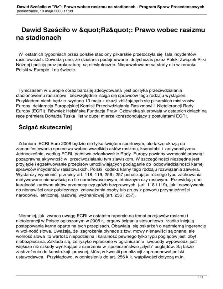 Dawid Sześciło w "Rz": Prawo wobec rasizmu na stadionach - Program Spraw Precedensowych poniedziałek, 19 maja 2008 11:08 Dawid Sześciło w "Rz": Prawo wobec rasizmu na stadionach W ostatnich tygodniach przez polskie stadiony piłkarskie przetoczyła się fala incydentów rasistowskich. Dowodzą one, że działania podejmowane dotychczas przez Polski Związek Piłki Nożnej i policję oraz prokuraturę są nieskuteczne. Niepowetowane są straty dla wizerunku Polski w Europie i na świecie. Tymczasem w Europie coraz bardziej zdecydowana jest polityka przeciwdziałania stadionowemu rasizmowi i bezwzględnie ściga się sprawców tego rodzaju wystąpień. Przykładem niech będzie wydana 13 maja z okazji zbliżających się piłkarskich mistrzostw Europy deklaracja Europejskiej Komisji Przeciwdziałania Rasizmowi i Nietolerancji Rady Europy (ECRI). Również Helsińska Fundacja Praw Człowieka skierowała w ostatnich dniach na ręce premiera Donalda Tuska list w dużej mierze korespondujący z postulatami ECRI. Ścigać skuteczniej Zdaniem ECRI Euro 2008 będzie nie tylko świętem sportowym, ale także okazją do zamanifestowania sprzeciwu wobec wszelkich aktów rasizmu, ksenofobii i antysemityzmu. Jednocześnie, według ECRI, państwa członkowskie Rady Europy powinny wzmocnić prawną i pozaprawną aktywność w przeciwdziałaniu tym zjawiskom. W szczególności niezbędne jest przyjęcie i egzekwowanie przepisów umożliwiających pociąganie do odpowiedzialności karnej sprawców incydentów rasistowskich. Polski kodeks karny tego rodzaju rozwiązania zawiera. Wystarczy wymienić przepisy art. 118, 119, 256 i 257 penalizujące różnego typu zachowania motywowane nienawiścią na tle narodowościowym, etnicznym czy rasowym. Przewidują one karalność zarówno aktów przemocy czy gróźb bezprawnych (art. 118 i 119), jak i nawoływanie do nienawiści oraz publicznego znieważania osoby lub grupy z powodu przynależności narodowej, etnicznej, rasowej, wyznaniowej (art. 256 i 257). Niemniej, jak zwraca uwagę ECRI w ostatnim raporcie na temat przejawów rasizmu i nietolerancji w Polsce ogłoszonym w 2005 r., organy ścigania stosunkowo rzadko inicjują postępowania karne oparte na tych przepisach. Obawiają się oskarżeń o nadmierną ingerencję w wol-ność słowa. Uważają, że zagrożenia płynące z tzw. mowy nienawiści są znane, ale wolność słowa to wartość niepodzielna i karalność pewnego tylko typu poglądów jest zbyt niebezpieczna. Zakłada się, że ryzyko wplecione w ograniczanie swobody wypowiedzi jest większe niż szkody wynikające z szerzenia w społeczeństwie „złych” poglądów. Są także zastrzeżenia do konstrukcji prawnej, którą w kwestii penalizacji zaproponował polski ustawodawca. Przykładowo, w odniesieniu do art. 256 k.k. wątpliwości dotyczą m.in. 1/2 Dawid Sześciło w "Rz": Prawo wobec rasizmu na stadionach - Program Spraw Precedensowych poniedziałek, 19 maja 2008 11:08 interpretacji znamienia określonego jako „nawoływanie do nienawiści”. Z tak skonstruowanego przepisu wynika, że penalizowane nie jest nawoływanie do określonego zachowania, ale do określonej emocji. Otwiera to duże pole do interpretacji, nieporozumień, a nawet nadużyć, które mogą doprowadzić do swoistego embarga na informacje dotykające tej sfery życia publicznego. Z drugiej strony nawet Trybunał w Strasburgu, zasadniczo krytyczny wobec prawnokarnej ingerencji w wolność wypowiedzi, dopuszcza jej stosowanie do przypadków siania nienawiści czy podżegania do przemocy (orzeczenie w sprawie Cumpana i Mazare przeciwko Rumunii z 17 grudnia 2004 r., skarga nr 3348/96). Nie tylko prawo ECRI wskazuje także na potrzebę inicjowania działań wykraczających poza sferę prawną. Mowa tu przede wszystkim o współpracy z klubami i federacjami piłkarskimi oraz mediami, a także wspieraniu kampanii budujących społeczną wrażliwość na problemy rasizmu i ksenofobii. Na uwagę zasługują tu m.in. międzynarodowa inicjatywa „Wykopmy rasizm ze stadionów” (Let’s kick out racism out of football) czy kampania Rady Europy „Wszyscy różni – wszyscy równi” (All Different – All Equal). Nie ma wątpliwości, że tego rodzaju „miękkie” środki oddziaływania mogą się okazać równie skuteczne jak działania prawne, a jednocześnie nie wzbudzają takich kontrowersji. Wreszcie, ECRI domaga się, by mecze piłkarskie, w trakcie których dochodzi do incydentów na tle rasistowskim, np. śpiewania obraźliwych pieśni czy wznoszenia rasistowskich okrzyków, były natychmiast przerywane. Podobne postanowienia zawierają już przepisy kodeksu dyscyplinarnego Międzynarodowej Federacji Piłkarskiej (FIFA). Autor jest prawnikiem w Programie Spraw Precedensowych Źródło : Rzeczpospolita Joomla SEF URLs by Artio 2/2