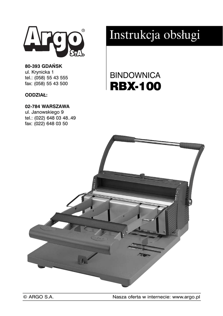 Instrukcja obsługi 80-393 GDAŃSK ul. Krynicka 1 tel.: (058) 55 43 555 fax: (058) 55 43 500 BINDOWNICA RBX-100 ODDZIAŁ: 02-784 WARSZAWA ul. Janowskiego 9 tel.: (022) 648 03 48..49 fax: (022) 648 03 50 © ARGO S.A. Nasza oferta w internecie: www.argo.pl BINDOWNICA RBX-100 Bindownica do oprawy drutowej ELEMENTY URZĄDZENIA 1. Rączka dźwigni dziurkującej 2. Ruchomy blat roboczy 3. Zagłębienie ułatwiające założenie kartek na grzbiet 4. Dźwignia dziurkująca 5. Obręcz przytrzymująca grzbiet podczas zakładania kartek 6. Obudowa przednia 7. Pokrywa boczna 8. Zagłębienie ułatwiające założenie kartek na grzbiet 9. Wskażnik grubości dokumentu 10. Listwa zaciskająca grzbiet 11. Skala poziomu zaciskania grzbietów 12. Regulacja poziomu zaciskania grzbietów 13. Rączka dźwigni bindującej 14. Dźwignia bindująca 15. Magnetyczna szczelina zaciskowa 16. Zatrzask umożliwiający ustawienie parametrów dziurkowania w zależności od skoku grzbietu (2:1 lub 3:1) 17. Boczny ogranicznik papieru 18. Przedni ogranicznik papieru 19. Szczeliny na ścinki 20. Podkładka 21. Elementy dziurkujące 22. Obudowa tylna 23. Pokretło przemieszczające blat 24. Gniazdo na pojedyńczy element dziurkujący 25. Śrubka zaciskajaca elementy dziurkujace w gnieździe Wyposażenie stanadardowe: 26. Podkładki 27. Elementy dziurkujące 28-30. Narzędzia (ułatwiające wymiane elementów dziurkujących, śrubokręty, pędzelek) © ARGO S.A. Nasza oferta w internecie: www.argo.pl DANE TECHNICZNE max ilość oprawianych kartek max ilość dziurkowanych kartek parametry grzbietów format papieru obsługa waga wymiary 220 (70-80 g) 100 (70-80g) skok skok 3:1 (33 oczka) lub 2:1 (22 oczka) rozmiar 4,8 mm (3/16'') aż do 25,4 mm (1'') do formatu A4 (210x 297 mm), letter size ręczna 22 kg 420 x 580 x 230 mm SPOSÓB UŻYTKOWANIA BINDOWNICY 1. Ustaw urządzenie na stabilnym podłożu. Wolna przestrzeń od tylnej ściany bindownicy powinna wynosić co najmniej 20 cm, natomiast z prawej strony 15 cm. Materiały eksploatacyjne do bindowania trzymaj w pobliżu stanowiska do bindowania. 2. Ustawienie odpowiedniego marginesu dziurkowania jest możliwe dzięki zastosowaniu jedenego z dwóch rodzajów podkładek ochronnych (20). Zastosowanie podkładki płaskiej (1) umożliwia ustawienie 4 mm marginesu, odpowiedniego dla dokumentów powyżej 55 kartek. W przypadku zastosowania podkładki ze ścianką (2) odległość dziurek od krawędzi kartki wynosi 2 mm i jest odpowiednia dla dokumentów o objętości do 55 kartek (grzbiety o średnicy do 8 mm). 3. Właściwy rozmiar grzbietu (skok, średnica) powinien zostać dobrany stosownie do wielkości oprawianego dokumentu. Do oprawy dokumentu składającego się z mniej niż 120 kartek stosuje się grzbiet o skoku 3:1, do dokumentu powyżej 120 kartek o skoku 2:1. 4. Wysunięcie do góry specjalnego zatrzasku (16) umożliwia obrócenie go, a przez to dostosowanie parametrów dziurkowania do zastosowanego skoku grzbietu. © ARGO S.A. Nasza oferta w internecie: www.argo.pl 5. Przed dziurkowaniem ustaw blat bindownicy specjalnym pokrętłem (23) w stabilnej pozycji zatrzasku (16). 6. Przed ułożeniem dokumentu na blacie bindownicy, jak również przed przesuwaniem blatu, rączka dźwigni dziurkującej (1) powinna znajdować się w pozycji pionowej (jest uniesiona). 7. Aby uniemożliwić przesuwanie się dokumentu na blacie, należy ustawić ograniczniki papieru (17, 18). 8. Dziurkowanie wykonuje się przez wolne naciśnięcie rączki (1) dźwigni dziurkującej, maksymalnie w kierunku blatu bindownicy. W celu uzyskania kompletnej ilości oworów w dokumencie, dziurkowanie wykonuje się w kilku etapach. W przypadku skoku 3:1, dziurkowanie wykonuje się trzy razy, zmieniając przy tym położenie blatu regulatorem (23), tak aby uzyskać zamknięcie się zatrzasku w kolejnych pozycjach. Sprężynka powinna dokładnie wpaść w zagłębienie przełącznika skoku (zatrzasku). W przypadku skoku 2:1 dziurkowanie wykonuje się dwukrotnie. 9. Umieszczenie dokumentu w szczelinie zaciskowej (15) umożliwia odczytanie ze skali wskaźnika (9) umieszczonego po prawej stronie szczeliny, właściwego rozmiaru grzbietu. 10. Zgodnie z zalecaną średnicą grzbietu (11), należy ustawić poziom zaciskania grzbietu (12). © ARGO S.A. Nasza oferta w internecie: www.argo.pl 11. Założenie grzbietu na przedziurkowane kartki papieru wykonuje się na dwa sposoby, w zależności od ilości kartek. Dokument poniżej 120 kartek należy ułożyć przedziurkowaną krawędzią w zagłebieniu (8), przycisnąć obręczą (5) i przykładając grzbiet wzdłuż linii dziurek nałożyć go na dokument. W przypadku dokumentów o objętości powyżej 120 kartek, najpierw należy umieścić grzbiet w zagłębieniu (3), przycisnąć obręczą (5) a następnie założyć kartki na grzbiet. 12. Następnie, tak przygotowany dokument należy wsunąć do końca szczeliny dociskowej (15). Upewnij się, że grzbiet dokładnie przylega do końca szczeliny zaciskowej oraz, że jest ułożony w pozycji umożliwiającej prawidłowe zamknięcie grzbietu Teraz pociągnij rączkę (13) dźwigni zaciskającej (14) ku dołowi. Metalowy grzbiet zostanie zamknięty. Przekręć ostania stronę okładki. Gotowe! © ARGO S.A. Nasza oferta w internecie: www.argo.pl KONSERWACJA Sposób wymiany elementów dziurkujących Elementy dziurkujące (21) należy wymieniać regularnie, tak aby zachować wymaganą jakość dziurkowania. 1. Odkręć śrubki mocujące pokrywę (6) 2. Korzystając z narzędzi (w wyposażeniu), odkręć śrubkę (25) znajdującą się z przodu gniazda (24) i wymień dotychczasowy element dziurkujący na nowy. Następnie przykręć śrubkę mocującą element dziurkujący w gnieździe i przykręć pokrywę bindownicy. Sposób mocowania i wymiany podkładki ochronnej 1. Z czasem, podczas użytkowania bindownicy, podkładka w miejscu styku z nożami wyrabia się. Aby zachować wymaganą jakość dziurkowania neleży przesuw