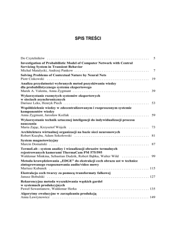 SPIS TREŚCI Do Czytelników . . . . . . . . . . . . . . . . . . . . . . . . . . . . . . . . . . . . . . . . . . . . . . . . . . . . . . . . Investigation of Probabilistic Model of Computer Network with Central Servicing System in Transient Behavior Michal Matalycki, Andrzej Pankow . . . . . . . . . . . . . . . . . . . . . . . . . . . . . . . . . . . . . . . . . Solving Problems of Contextual Nature by Neural Nets Piotr Ciskowski . . . . . . . . . . . . . . . . . . . . . . . . . . . . . . . . . . . . . . . . . . . . . . . . . . . . . . . . Analiza przydatności wybranych metod pozyskiwania wiedzy dla probabilistycznego systemu ekspertowego Marek A. Valenta, Anna Zygmunt . . . . . . . . . . . . . . . . . . . . . . . . . . . . . . . . . . . . . . . . . . Wykorzystanie rozmytych systemów ekspertowych w sieciach asynchronicznych Dariusz Leks, Henryk Piech . . . . . . . . . . . . . . . . . . . . . . . . . . . . . . . . . . . . . . . . . . . . . . . Współdzielenie wiedzy w zdecentralizowanym i rozproszonym systemie komponentów wiedzy Anna Zygmunt, Jarosław Koźlak . . . . . . . . . . . . . . . . . . . . . . . . . . . . . . . . . . . . . . . . . . . Wykorzystanie technik sztucznej inteligencji do indywidualizacji procesu nauczania Maria Zając, Krzysztof Wójcik . . . . . . . . . . . . . . . . . . . . . . . . . . . . . . . . . . . . . . . . . . . . Architektura wirtualnej organizacji na bazie sieci neuronowych Robert Kucęba, Adam Sokołowski . . . . . . . . . . . . . . . . . . . . . . . . . . . . . . . . . . . . . . . . . System magnetowizyjny Marcin Domański . . . . . . . . . . . . . . . . . . . . . . . . . . . . . . . . . . . . . . . . . . . . . . . . . . . . . . . TermoLab - system analizy i wizualizacji obrazów termalnych rejestrowanych kamerami ThermaCam PM 575/595 Waldemar Minkina, Sebastian Dudzik, Robert Bąbka, Walter Wild . . . . . . . . . . . . . . . Metoda krawędziowania „EDGE” do ekstrakcji cech obrazu ust w technice zintegrowanego rozpoznawania audio/video mowy Mariusz Kubanek . . . . . . . . . . . . . . . . . . . . . . . . . . . . . . . . . . . . . . . . . . . . . . . . . . . . . . . Ekstrakcja cech twarzy za pomocą transformaty falkowej Janusz Bobulski . . . . . . . . . . . . . . . . . . . . . . . . . . . . . . . . . . . . . . . . . . . . . . . . . . . . . . . . Rekurencyjna metoda wyszukiwania wąskich gardeł w systemach produkcyjnych Paweł Sewastianow, Waldemar Herka . . . . . . . . . . . . . . . . . . . . . . . . . . . . . . . . . . . . . . Algorytmy ewolucyjne w zarządzaniu produkcją Anna Ławrynowicz . . . . . . . . . . . . . . . . . . . . . . . . . . . . . . . . . . . . . . . . . . . . . . . . . . . . . 5 7 19 39 53 59 73 81 87 99 115 127 135 149 Ocena efektywności zastosowania algorytmów genetycznych do zadania transportowego Aleksandra Ptak, Henryk Piech . . . . . . . . . . . . . . . . . . . . . . . . . . . . . . . . . . . . . . . . . . . . Metody grupowania dokumentów tekstowych Marcin Gołębski, Robert Bembenik, Marcin Chrabąszcz . . . . . . . . . . . . . . . . . . . . . . . . Pierwiastki rozmyte równań przedziałowych Mariusz Gonera, Ludmiła Dymowa, Paweł Sewastianow . . . . . . . . . . . . . . . . . . . . . . . . Optymalizacja dystrybucji w warunkach niepewności probabilistycznej Marek Dolata, Aleksandra Ptak . . . . . . . . . . . . . . . . . . . . . . . . . . . . . . . . . . . . . . . . . . . . Badanie drżenia kończyn górnych z użyciem sprzętu komputerowego ze szczególnym uwzględnieniem tabletu Tomasz Lech . . . . . . . . . . . . . . . . . . . . . . . . . . . . . . . . . . . . . . . . . . . . . . . . . . . . . . . . . . DODATEK INFORMACYJNY . . . . . . . . . . . . . . . . . . . . . . . . . . . . . . . . . . . . . . . . . . Europejski standard możliwości kształcenia akademickiej Aleksandra Bednarska-Chłopaś . . . . . . . . . . . . . . . . . . . . . . . . . . . . . . . . . . . . . . . . . . . . Tytuł i stopnie naukowe w karierze akademickiej Tomasz Chłopaś . . . . . . . . . . . . . . . . . . . . . . . . . . . . . . . . . . . . . . . . . . . . . . . . . . . . . . . Kierunki i specjalności informatyczne Tomasz Chłopaś . . . . . . . . . . . . . . . . . . . . . . . . . . . . . . . . . . . . . . . . . . . . . . . . . . . . . . . Wykaz autorów . . . . . . . . . . . . . . . . . . . . . . . . . . . . . . . . . . . . . . . . . . . . . . . . . . . . . . . 169 179 197 205 213 223 225 237 245 256