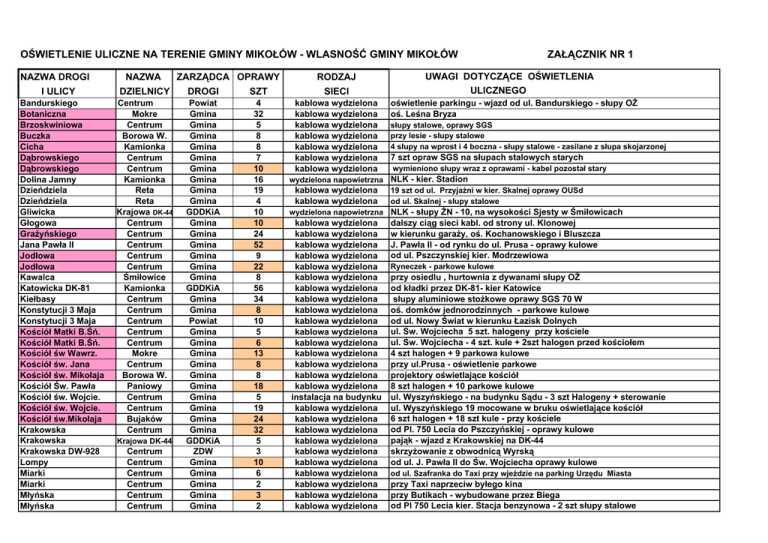 OŚWIETLENIE ULICZNE NA TERENIE GMINY MIKOŁÓW - WLASNOŚĆ GMINY MIKOŁÓW NAZWA DROGI I ULICY Bandurskiego Botaniczna Brzoskwiniowa Buczka Cicha Dąbrowskiego Dąbrowskiego Dolina Jamny Dzieńdziela Dzieńdziela Gliwicka Głogowa Grażyńskiego Jana Pawła II Jodłowa Jodłowa Kawalca Katowicka DK-81 Kiełbasy Konstytucji 3 Maja Konstytucji 3 Maja Kościół Matki B.Śń. Kościół Matki B.Śń. Kościół św Wawrz. Kościół św. Jana Kościół św. Mikołaja Kościół Św. Pawła Kościół św. Wojcie. Kościół św. Wojcie. Kościół św.Mikołaja Krakowska Krakowska Krakowska DW-928 Lompy Miarki Miarki Młyńska Młyńska NAZWA ZARZĄDCA OPRAWY RODZAJ DZIELNICY DROGI SZT SIECI Centrum Mokre Centrum Borowa W. Kamionka Centrum Centrum Kamionka Reta Reta Krajowa DK-44 Centrum Centrum Centrum Centrum Centrum Śmiłowice Kamionka Centrum Centrum Centrum Centrum Centrum Mokre Centrum Borowa W. Paniowy Centrum Centrum Bujaków Centrum Powiat Gmina Gmina Gmina Gmina Gmina Gmina Gmina Gmina Gmina GDDKiA Gmina Gmina Gmina Gmina Gmina Gmina GDDKiA Gmina Gmina Powiat Gmina Gmina Gmina Gmina Gmina Gmina Gmina Gmina Gmina Gmina GDDKiA ZDW Gmina Gmina Gmina Gmina Gmina 4 32 5 8 8 7 10 16 19 4 10 10 24 52 9 22 8 56 34 8 10 5 6 13 8 8 18 5 19 24 32 5 3 10 6 2 3 2 kablowa wydzielona kablowa wydzielona kablowa wydzielona kablowa wydzielona kablowa wydzielona kablowa wydzielona kablowa wydzielona Krajowa DK-44 Centrum Centrum Centrum Centrum Centrum Centrum ZAŁĄCZNIK NR 1 UWAGI DOTYCZĄCE OŚWIETLENIA ULICZNEGO oświetlenie parkingu - wjazd od ul. Bandurskiego - słupy OŻ oś. Leśna Bryza słupy stalowe, oprawy SGS przy lesie - słupy stalowe 4 słupy na wprost i 4 boczna - słupy stalowe - zasilane z słupa skojarzonej 7 szt opraw SGS na słupach stalowych starych wymieniono słupy wraz z oprawami - kabel pozostał stary wydzielona napowietrzna NLK - kier. Stadion 19 szt od ul. Przyjaźni w kier. Skalnej oprawy OUSd kablowa wydzielona od ul. Skalnej - słupy stalowe kablowa wydzielona wydzielona napowietrzna NLK - słupy ŻN - 10, na wysokości Sjesty w Śmiłowicach kablowa wydzielona kablowa wydzielona kablowa wydzielona kablowa wydzielona kablowa wydzielona kablowa wydzielona kablowa wydzielona kablowa wydzielona kablowa wydzielona kablowa wydzielona kablowa wydzielona kablowa wydzielona kablowa wydzielona kablowa wydzielona kablowa wydzielona kablowa wydzielona instalacja na budynku kablowa wydzielona kablowa wydzielona kablowa wydzielona kablowa wydzielona kablowa wydzielona kablowa wydzielona kablowa wydzielona kablowa wydzielona kablowa wydzielona kablowa wydzielona dalszy ciąg sieci kabl. od strony ul. Klonowej w kierunku garaży, oś. Kochanowskiego i Bluszcza J. Pawła II - od rynku do ul. Prusa - oprawy kulowe od ul. Pszczynskiej kier. Modrzewiowa Ryneczek - parkowe kulowe przy osiedlu , hurtownia z dywanami słupy OŻ od kładki przez DK-81- kier Katowice słupy aluminiowe stożkowe oprawy SGS 70 W oś. domków jednorodzinnych - parkowe kulowe od ul. Nowy Świat w kierunku Łazisk Dolnych ul. Św. Wojciecha 5 szt. halogeny przy kościele ul. Św. Wojciecha - 4 szt. kule + 2szt halogen przed kościołem 4 szt halogen + 9 parkowa kulowe przy ul.Prusa - oświetlenie parkowe projektory oświetlające kościół 8 szt halogen + 10 parkowe kulowe ul. Wyszyńskiego - na budynku Sądu - 3 szt Halogeny + sterowanie ul. Wyszyńskiego 19 mocowane w bruku oświetlające kościół 6 szt halogen + 18 szt kule - przy kościele od Pl. 750 Lecia do Pszczyńskiej - oprawy kulowe pająk - wjazd z Krakowskiej na DK-44 skrzyżowanie z obwodnicą Wyrską od ul. J. Pawła II do Św. Wojciecha oprawy kulowe od ul. Szafranka do Taxi przy wjeździe na parking Urzędu Miasta przy Taxi naprzeciw byłego kina przy Butikach - wybudowane przez Biega od Pl 750 Lecia kier. Stacja benzynowa - 2 szt słupy stalowe Młyńska Modrzewiowa Musioła Os. Norwida Nowy Świat Okrzei Oś Słowackiego Oś. 30 - Lecia Oś. 30-Lecia Oś. Kochanowsk. Oś. Mickiewicza Oś. Stolarska Oś. Stolarska Os. Słowackiego Oś.Podleska Oś.Stara Droga Parking B.Domek Plac - Harcerski Plac 750 lecia Plac Karpeckiego Planty Duże Planty Małe Planty Małe Podleska Pokoju Prusa Pułaskiego Rajcy Rolnicza Rynek Rynek Rynek Salwatory Słoneczna Staropodleska Stawowa Szkolna stadion św. Wojciecha św. Wojciecha św. Wojciecha Św. Wojciecha Torowa Wojaczka Centrum Centrum Centrum Centrum Centrum Centrum Centrum Centrum Centrum Centrum Centrum Centrum Centrum Centrum Centrum Centrum Centrum Centrum Centrum Centrum Centrum Centrum Centrum Centrum Centrum Centrum Kamionka Centrum Centrum Centrum Centrum Centrum Centrum Centrum Centrum Centrum Bujaków Centrum Centrum Centrum Centrum Centrum Centrum Gmina Gmina Gmina Gmina Powiat Gmina Gmina Gmina MSM Gmina Gmina Gmina Gmina Gmina Gmina Gmina Gmina Gmina Gmina Gmina Gmina Gmina Gmina Powiat Gmina Gmina Gmina Gmina Gmina Gmina Gmina Gmina Gmina Gmina Powiat Gmina Gmina Gmina Gmina Gmina Gmina Gmina Gmina 8 5 16 2 5 10 24 12 1 26 92 42 2 9 9 10 20 7 6 6 46 6 13 51 11 2 2 7 36 8 18 91 6 8 5 8 8 14 6 16 10 7 13 kablowa wydzielona kablowa wydzielona kablowa wydzielona kablowa wydzielona kablowa wydzielona kablowa wydzielona kablowa wydzielona kablowa wydzielona kablowa wydzielona kablowa wydzielona kablowa wydzielona kablowa wydzielona kablowa wydzielona 2 słupy stalowe przy CPN, pozostałe betonowe do Pszczyńskiej kablowa wydzielona kablowa wydzielona kablowa wydzielona kablowa wydzielona kablowa wydzielona kablowa wydzielona kablowa wydzielona kablowa wydzielona kablowa wydzielona wydziel. Napow./nN kablowa wydzielona kablowa wydzielona kablowa wydzielona przy Musioła przy blokach obok Cmentarza Żydowskiego od ul. Konst. 3 Maja parkingi przy Bialym Domku zasilanie i sterowanie z Domku Harcerskiego na pająku na pająku słupy stalowe oprawy SGS od ul. Podleskiej kierunek Św.Wojciecha na odcinku - oś. Norwida Butiki od ul. Konstytucji 3- Maja - słupy stożkowe aluminiowe od J.Pawła II 
