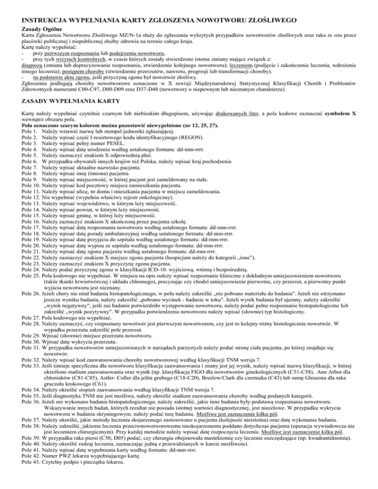 INSTRUKCJA WYPEŁNIANIA KARTY ZGŁOSZENIA NOWOTWORU ZŁOŚLIWEGO Zasady Ogólne Karta Zgłoszenia Nowotworu Złośliwego MZ/N-1a służy do zgłaszania wykrytych przypadków nowotworów złośliwych oraz raka in situ przez placówki publicznej i niepublicznej służby zdrowia na terenie całego kraju. Kartę należy wypełniać: przy pierwszym rozpoznaniu lub podejrzeniu nowotworu, przy tych wizytach kontrolnych, w czasie których zostały stwierdzone istotne zmiany mające związek z: diagnozą (zmiana lub doprecyzowanie rozpoznania, stwierdzenie kolejnego nowotworu); leczeniem (podjęcie i zakończenie leczenia, wdrożenie innego leczenia); postępem choroby (stwierdzenie przerzutów, nawrotu, progresji lub transformacji choroby). na podstawie aktu zgonu, jeśli przyczyną zgonu był nowotwór złośliwy. Zgłoszeniu podlegają choroby nowotworowe oznaczone w X rewizji Międzynarodowej Statystycznej Klasyfikacji Chorób i Problemów Zdrowotnych numerami C00-C97, D00-D09 oraz D37-D48 (nowotwory o niepewnym lub nieznanym charakterze). ZASADY WYPEŁNIANIA KARTY Kartę należy wypełniać czytelnie czarnym lub niebieskim długopisem, używając drukowanych liter, a pola kodowe zaznaczać symbolem X wewnątrz obszaru pola. Pola oznaczone szarym kolorem można pozostawić niewypełnione (nr 12, 25, 27). Pole 1. Należy wstawić nazwę lub stempel jednostki zgłaszającej. Pole 2. Należy wpisać część I resortowego kodu identyfikacyjnego (REGON). Pole 3. Należy wpisać pełny numer PESEL. Pole 4. Należy wpisać datę urodzenia według ustalonego formatu: dd-mm-rrrr. Pole 5. Należy zaznaczyć znakiem X odpowiednią płeć. Pole 6. W przypadku obywateli innych krajów niż Polska, należy wpisać kraj pochodzenia Pole 7. Należy wpisać aktualne nazwisko pacjenta. Pole 8. Należy wpisać imię (imiona) pacjenta. Pole 9. Należy wpisać miejscowość, w której pacjent jest zameldowany na stałe. Pole 10. Należy wpisać kod pocztowy miejsca zamieszkania pacjenta. Pole 11. Należy wpisać ulicę, nr domu i mieszkania pacjenta w miejscu zameldowania. Pole 12. Nie wypełniać (wypełnia właściwy rejestr onkologiczny). Pole 13. Należy wpisać województwo, w którym leży miejscowość. Pole 14. Należy wpisać powiat, w którym leży miejscowość. Pole 15. Należy wpisać gminę, w której leży miejscowość. Pole 16. Należy zaznaczyć znakiem X ukończoną przez pacjenta szkołę. Pole 17. Należy wpisać datę rozpoznania nowotworu według ustalonego formatu: dd-mm-rrrr. Pole 18. Należy wpisać datę porady ambulatoryjnej według ustalonego formatu: dd-mm-rrrr. Pole 19. Należy wpisać datę przyjęcia do szpitala według ustalonego formatu: dd-mm-rrrr. Pole 20. Należy wpisać datę wypisu ze szpitala według ustalonego formatu: dd-mm-rrrr. Pole 21. Należy wpisać datę zgonu pacjenta według ustalonego formatu: dd-mm-rrrr. Pole 22. Należy zaznaczyć znakiem X miejsce zgonu pacjenta (hospicjum należy do kategorii „inne”). Pole 23. Należy zaznaczyć znakiem X przyczynę zgonu pacjenta. Pole 24. Należy podać przyczynę zgonu w klasyfikacji ICD-10: wyjściową, wtórną i bezpośrednią. Pole 25. Pola kodowego nie wypełniać. W miejscu na opis należy wpisać rozpoznanie kliniczne z dokładnym umiejscowieniem nowotworu (także tkanki krwiotwórczej i układu chłonnego), precyzując czy chodzi umiejscowienie pierwotne, czy przerzut, a pierwotny punkt wyjścia nowotworu jest nieznany. Pole 26. Jeżeli chory nie miał badania histopatologicznego, w polu należy zakreślić „nie pobrano materiału do badania". Jeżeli nie otrzymano jeszcze wyniku badania, należy zakreślić „pobrano wycinek - badanie w toku". Jeżeli wynik badania był ujemny, należy zakreślić „wynik negatywny", jeśli zaś badanie potwierdziło występowanie nowotworu, należy podać pełne rozpoznanie histopatologiczne lub zakreślić „wynik pozytywny". W przypadku potwierdzenia nowotworu należy wpisać (słownie) typ histologiczny. Pole 27. Pola kodowego nie wypełniać. Pole 28. Należy zaznaczyć, czy rozpoznany nowotwór jest pierwszym nowotworem, czy jest to kolejny różny histologicznie nowotwór. W wypadku przerzutu zakreślić pole przerzut. Pole 29. Wpisać (słownie) miejsce przerzutu nowotworu. Pole 30. Wpisać datę wykrycia przerzutu. Pole 31. W przypadku nowotworów umiejscowionych w narządach parzystych należy podać stronę ciała pacjenta, po której znajduje się nowotwór. Pole 32. Należy wpisać kod zaawansowania choroby nowotworowej według klasyfikacji TNM wersja 7. Pole 33. Jeśli istnieje specyficzna dla nowotworu klasyfikacja zaawansowania i znany jest jej wynik, należy wpisać nazwę klasyfikacji, w której określono stadium zaawansowania oraz wynik (np. klasyfikacja FIGO dla nowotworów ginekologicznych (C51-C58), Ann Arbor dla chłoniaków (C81-C85), Astler- Coller dla jelita grubego (C18-C20), Breslow/Clark dla czerniaka (C43) lub sumę Gleasona dla raka gruczołu krokowego (C61). Pole 34. Należy określić stopień zaawansowania według klasyfikacji TNM wersja 7. Pole 35. Jeśli diagnostyka TNM nie jest możliwa, należy określić stadium zaawansowania choroby według podanych kategorii. Pole 36. Jeżeli nie wykonano badania histopatologicznego, należy zakreślić, jakie inne badania były podstawą rozpoznania nowotworu. Wskazywanie innych badań, których rezultat nie posiada istotnej wartości diagnostycznej, jest niecelowe. W przypadku wykrycia nowotworu w badaniu skryningowym, należy podać turę badania. Możliwe jest zaznaczenie kilku pól. Pole 37. Należy określić, jakie metody leczenia skojarzonego zastosowano u pacjenta (kolejność nieistotna) oraz datę wykonania badania. Pole 38. Należy zakreślić, jakiemu leczeniu przeciwnowotworowemu nieskojarzonemu poddano dotychczas pacjenta (operacja wywiadowcza nie jest leczeniem chirurgicznym). Przy każdej metodzie należy wpisać datę rozpoczęcia leczenia. Możliwe jest zaznaczenie kilku pól.