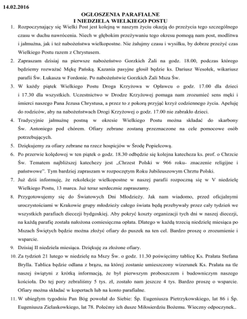 14.02.2016 OGŁOSZENIA PARAFIALNE I NIEDZIELA WIELKIEGO