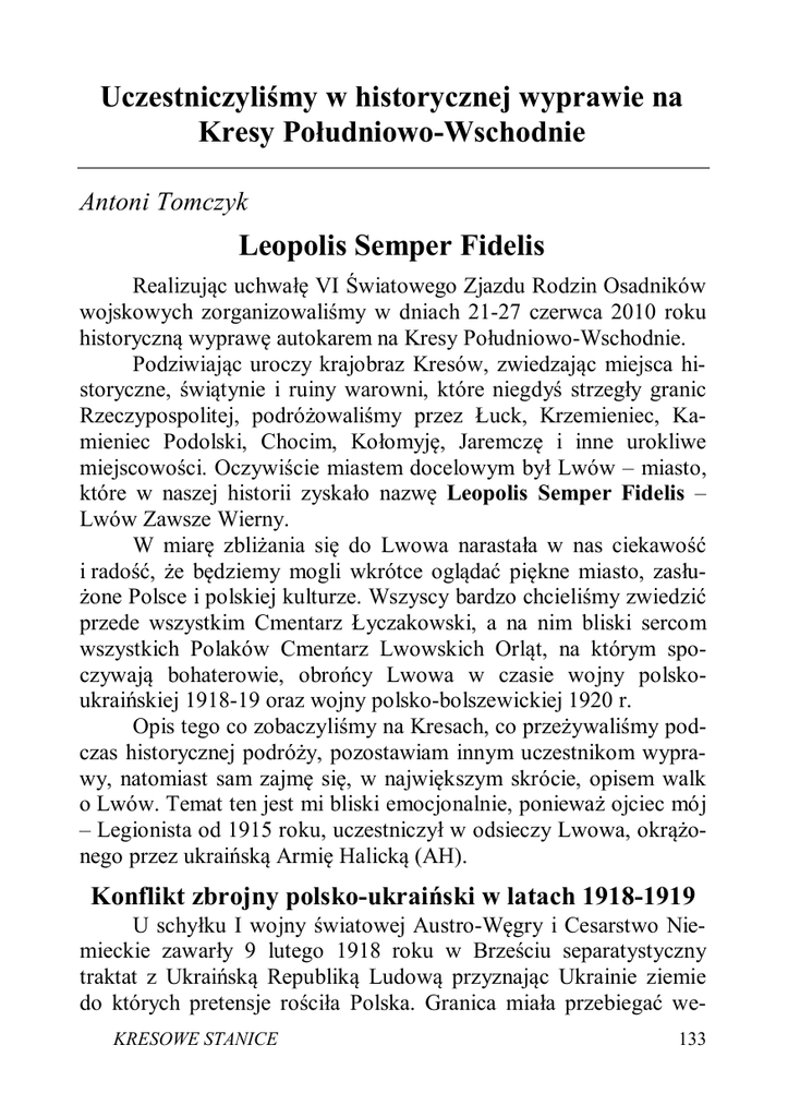 Uczestniczyliśmy w historycznej wyprawie na Kresy Południowo-Wschodnie Antoni Tomczyk Leopolis Semper Fidelis Realizując uchwałę VI Światowego Zjazdu Rodzin Osadników wojskowych zorganizowaliśmy w dniach 21-27 czerwca 2010 roku historyczną wyprawę autokarem na Kresy Południowo-Wschodnie. Podziwiając uroczy krajobraz Kresów, zwiedzając miejsca historyczne, świątynie i ruiny warowni, które niegdyś strzegły granic Rzeczypospolitej, podróżowaliśmy przez Łuck, Krzemieniec, Kamieniec Podolski, Chocim, Kołomyję, Jaremczę i inne urokliwe miejscowości. Oczywiście miastem docelowym był Lwów – miasto, które w naszej historii zyskało nazwę Leopolis Semper Fidelis – Lwów Zawsze Wierny. W miarę zbliżania się do Lwowa narastała w nas ciekawość i radość, że będziemy mogli wkrótce oglądać piękne miasto, zasłużone Polsce i polskiej kulturze. Wszyscy bardzo chcieliśmy zwiedzić przede wszystkim Cmentarz Łyczakowski, a na nim bliski sercom wszystkich Polaków Cmentarz Lwowskich Orląt, na którym spoczywają bohaterowie, obrońcy Lwowa w czasie wojny polskoukraińskiej 1918-19 oraz wojny polsko-bolszewickiej 1920 r. Opis tego co zobaczyliśmy na Kresach, co przeżywaliśmy podczas historycznej podróży, pozostawiam innym uczestnikom wyprawy, natomiast sam zajmę się, w największym skrócie, opisem walk o Lwów. Temat ten jest mi bliski emocjonalnie, ponieważ ojciec mój – Legionista od 1915 roku, uczestniczył w odsieczy Lwowa, okrążonego przez ukraińską Armię Halicką (AH). Konflikt zbrojny polsko-ukraiński w latach 1918-1919 U schyłku I wojny światowej Austro-Węgry i Cesarstwo Niemieckie zawarły 9 lutego 1918 roku w Brześciu separatystyczny traktat z Ukraińską Republiką Ludową przyznając Ukrainie ziemie do których pretensje rościła Polska. Granica miała przebiegać weKRESOWE STANICE 133 dług linii: Biłgoraj, Szczebrzeszyn, Krasnystaw, Puchaczów, Radzyń, Międzyrzec, Sarnaki, Mielnik itd. W zamian za taką darowiznę liczono na dostawę żywności z obszaru Ukrainy. W następstwie dalszych wydarzeń wojennych nie doszło do zmiany granic ani do dostaw żywności. Traktat spowodował ostre protesty Polaków, a szczególnie żołnierzy pochodzenia polskiego służących w armii austriackiej. W następstwie tego wysyłano Polaków na front włoski, w inne rejony monarchii, bądź internowano. Tymczasem do Lwowa kierowano pułki składające się przeważnie z Ukraińców. Ukraińcy rozpoczęli przygotowania do zbrojnego objęcia ważniejszych obiektów Lwowa, w którym funkcjonowała administracja austriacka z komendantem miasta gen. Pfefferem na czele. Rozdrobnione polskie frakcje polityczne rozpoczęły spotkania, narady i przygotowania walk o miasto. Niewiele z tych narad wynikało zwłaszcza, że poza niezbyt liczną grupą żołnierzy skupionych wokół POW, polska strona nie dysponowała wojskiem zdolnym przeciwstawić się pułkom ukraińskim. 1 listopada 1918 roku nad ranem żołnierze austro-węgierscy ukraińskiego pochodzenia, podlegający Ukraińskiej Komendzie Generalnej, opanowali większość gmachów publicznych miasta. Po internowaniu austriackiej administracji i komendanta miasta, ogłoszono utworzenie Zachodnioukraińskiej Republiki Ludowej ze stolicą we Lwowie. W odpowiedzi na akcję agresywną Ukraińców już 1 listopada powstały pierwsze polskie punkty oporu: szkoła im. Henryka Sienkiewicza i Dom Akademicki. Wkrótce powołana została Komenda Obrony Lwowa z kpt. Czesławem Mączyńskim jako komendantem. Pamiętajmy, że w tamtych dniach Polska nie odzyskała jeszcze niepodległości po latach rozbiorów i nie było zorganizowane regularne Wojsko Polskie. W kolejnych dniach listopada spontanicznie powstawały grupy zbrojne i oddziałki polskie, złożone często z młodzieży niepełnoletniej, które w walce opanowały szereg kluczowych pozycji. Młodzież szkolna, natchniona głębokim patriotyzmem, znająca doskonale ulice miasta i przejścia podwórkami, bohatersko i skutecznie walczyła 134 KRESOWE STANICE z regularnymi pułkami ukraińskimi. Początkowo zdobywano broń na przeciwniku, a później opróżniano magazyny austriackie. 3 listopada przybyły do miasta 3 sotnie ukraińskiego Legionu, a kilka dni później oddziały ochotników ze Złoczowa, Kamionki Strumiłowej i Rawy Ruskiej. W dniach 3-6 listopada toczyły się ciężkie walki o szkołę im. H. Sienkiewicza, cmentarz żydowski, Cytadelę, Kasę Oszczędności, Odwach Główny, Dyrekcję Skarbu, Teatr Skarbkowski i in. Obie strony poniosły w duże straty i przeszły do walk pozycyjnych, trwających do 19 listopada. W tym czasie inicjatywę zaczepną posiadali Ukraińcy. Polska odsiecz dla walczącego Lwowa Po odzyskaniu niepodległości przez Polskę Naczelny Wódz Józef Piłsudski w rozkazach z 12 i 16 listopada polecał przyspieszyć organizację odsieczy dla Lwowa. Na dowódcę Wojsk Polskich w Galicji wyznaczył gen. Tadeusza Rozwadowskiego. Generał Bolesław Roja wyznaczony został do organizacji pomocy dla obrońców Lwowa. Zgrupowanie wojskowe SAN, stanowiące straż przednią odsieczy, wyruszyło pociągiem z Krakowa i 12 listopada zdobyło Przemyśl. Natomiast 20 listopada oddział liczący 140 oficerów i 1228 żołnierzy, dowodzony przez ppłk. Michała KaraszewiczaTokarzewskiego dotarł z Przemyśla do Lwowa. Po całodobowych walkach z 21 na 22 listopada Ukraińcy opuścili Lwów w obawie przed okrążeniem. W mieście panował wielki chaos, dokonywano rabunków sklepów, magazynów i domów prywatnych, których dopuszczali się kryminaliści wypuszczeni z więzień przez Ukraińców oraz maruderzy z armii austriackiej. Gen. Roja wydał 23.11.1918 r. rozkaz nr 2, w którym wyznaczył ppłk. Mączyńskiego na Komendanta Miasta, polecił mu zorganizowanie Pułku Strzelców Lwowskich w składzie trzech batalionów i zaprowadzenie porządku publicznego w mieście. We Lwowie zorganizowano dwa Pułki Strzelców Lwowskich, a