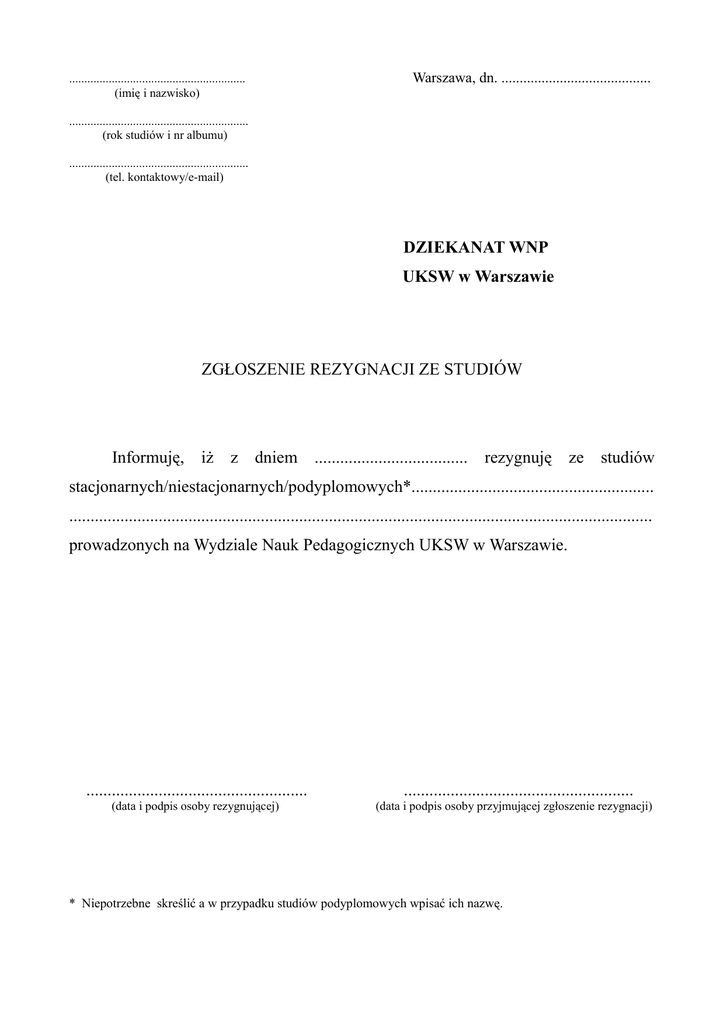 .......................................................... (imię i nazwisko) Warszawa, dn. ......................................... ........................................................... (rok studiów i nr albumu) ........................................................... (tel. kontaktowy/e-mail) DZIEKANAT WNP UKSW w Warszawie ZGŁOSZENIE REZYGNACJI ZE STUDIÓW Informuję, iż z dniem .................................... rezygnuję ze studiów stacjonarnych/niestacjonarnych/podyplomowych*......................................................... ......................................................................................................................................... prowadzonych na Wydziale Nauk Pedagogicznych UKSW w Warszawie. .................................................... (data i podpis osoby rezygnującej) ...................................................... (data i podpis osoby przyjmującej zgłoszenie rezygnacji) * Niepotrzebne skreślić a w przypadku studiów podyplomowych wpisać ich nazwę.