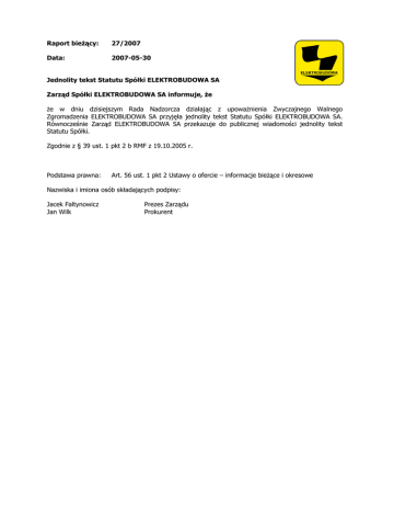 Raport bieżący: 27/2007 Data: 2007-05-30 Jednolity tekst Statutu Spółki ELEKTROBUDOWA SA Zarząd Spółki ELEKTROBUDOWA SA informuje, że że w dniu dzisiejszym Rada Nadzorcza działając z upoważnienia Zwyczajnego Walnego Zgromadzenia ELEKTROBUDOWA SA przyjęła jednolity tekst Statutu Spółki ELEKTROBUDOWA SA. Równocześnie Zarząd ELEKTROBUDOWA SA przekazuje do publicznej wiadomości jednolity tekst Statutu Spółki. Zgodnie z § 39 ust. 1 pkt 2 b RMF z 19.10.2005 r. Podstawa prawna: Art. 56 ust. 1 pkt 2 Ustawy o ofercie – informacje bieżące i okresowe Nazwiska i imiona osób składających podpisy: Jacek Faltynowicz Jan Wilk Prezes Zarządu Prokurent